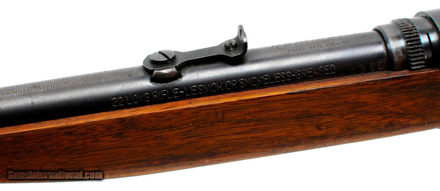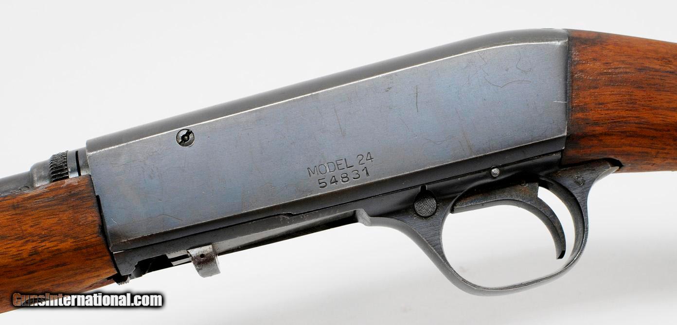 Description: Remington Model 24. 22LR Semi-Auto Takedown Rifle. Very Good AVAILABLE FOR PURCHASE AT OUR ON-LINE STORE Based on a John Browning design and manufactured from 1922-1935, the Remington model 24 is a semi-automatic rifle chambered in either .22 Short or .22 long rifle. It is very closely related to the Browning 22 Semi-Auto rifle (the Browning SA-22) which is still in production. It is a Takedown gun, meaning that the barrel and receiver are easily separated without tools, allowing for a smaller package for transport. DOM: 1927 According To Date Code. SPECIFICATIONS