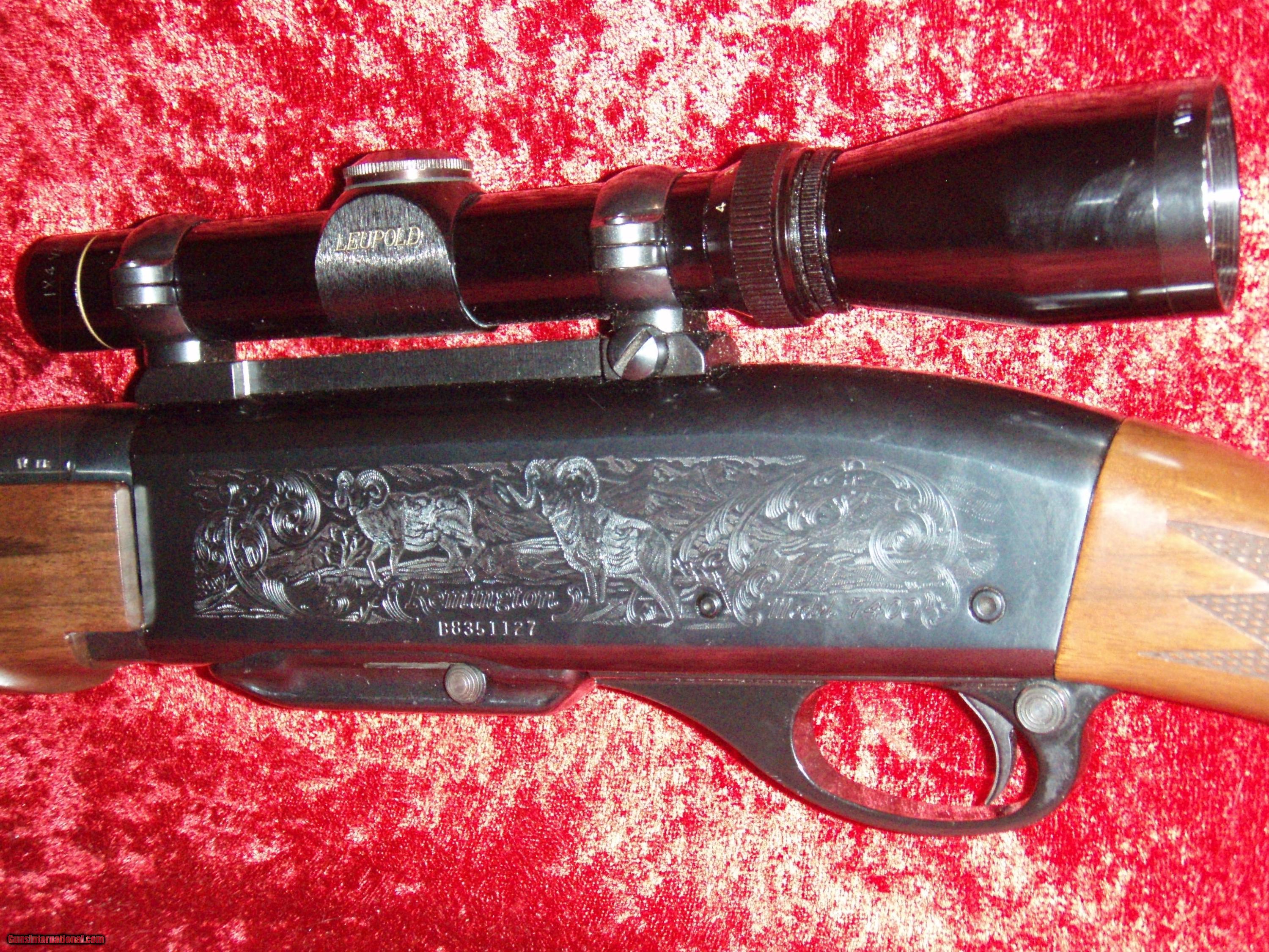 Description: Remington Model 7400 Engraved .243 cal with Leupold 1x4 Vari-X-II scope and sling Great Ladies or Kids Rifle!! Up for sale is a used Remington Model 7400 machine laser engraved with Elk and scenery on right side, and Big Horn sheep and scenery on the left side. Sights have been removed for ease of scabbard or case use and correct screws installed. 22" barrel, detachable box mag, LOP 12 3/4" with Limbsaver Pad. Comes with Leupold 1x4 Vari-X-II Scope. Also, comes with Butler Creek Camo Sling. Overall condition 90% showing light handling marks from normal use. Will separate for the right price.