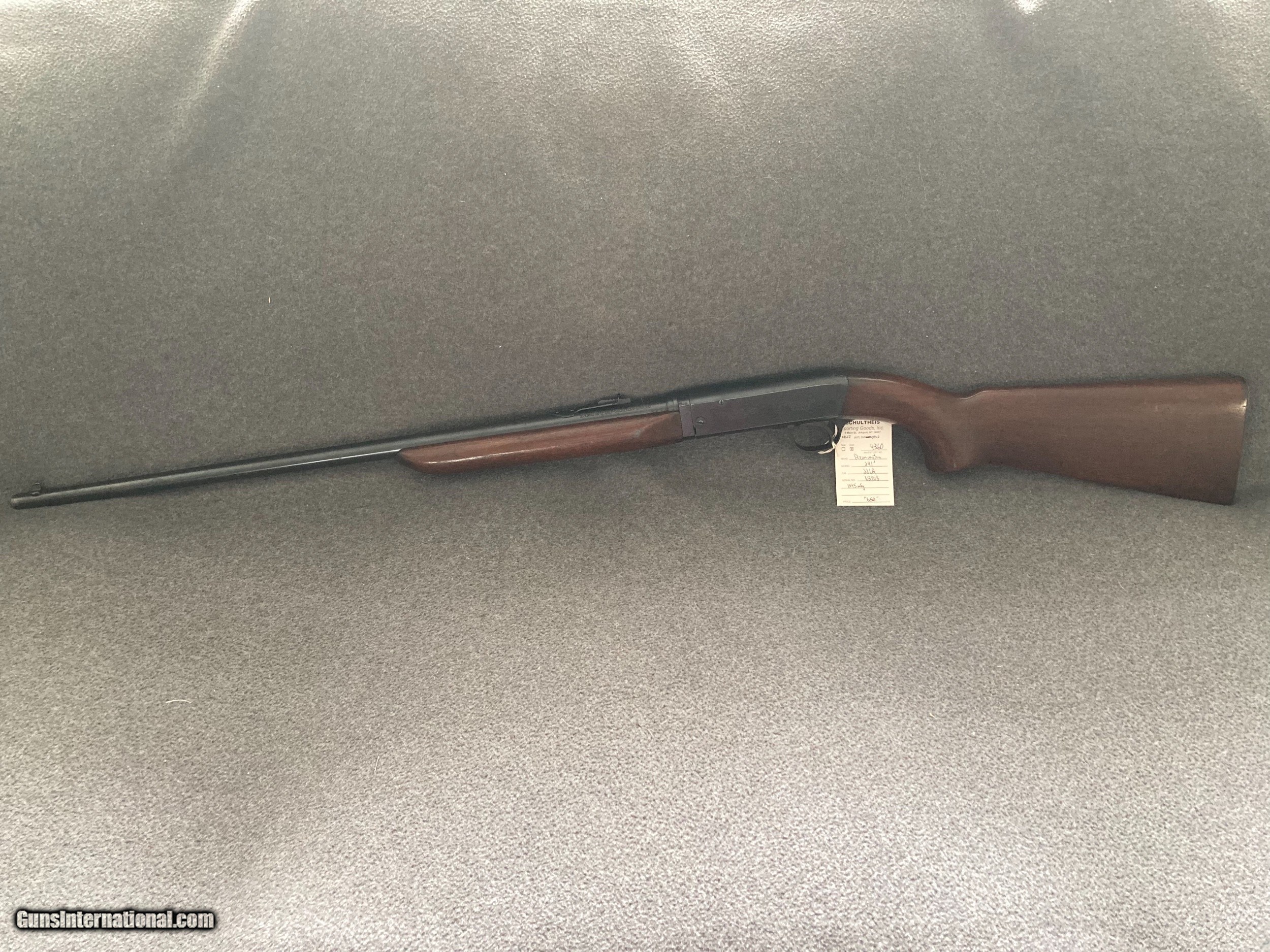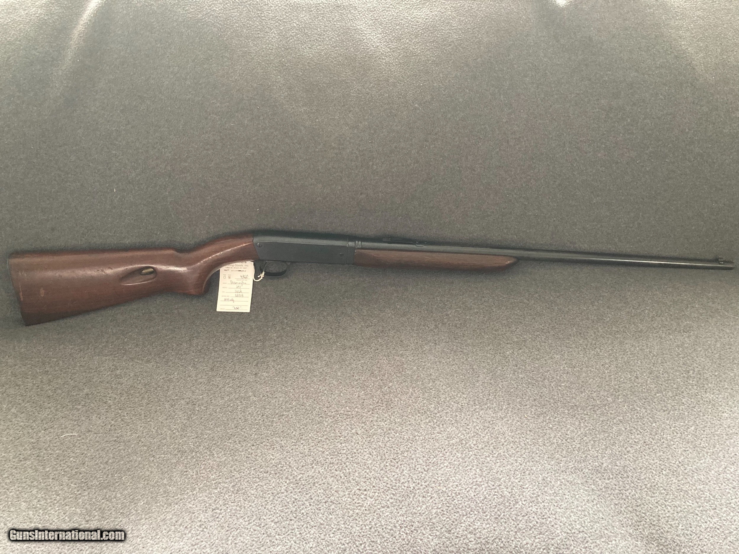 Description: Remington Speedmaster Model 241, 22LR only, serial #68XXX, 1945 mfg, tube magazine in the buttstock, Browning design, excellent bore, all original, 80% blue, original wood varnish shows light handling wear on the stock and a couple large scratches on the forearm. ($35.00 shipping) SOLD |