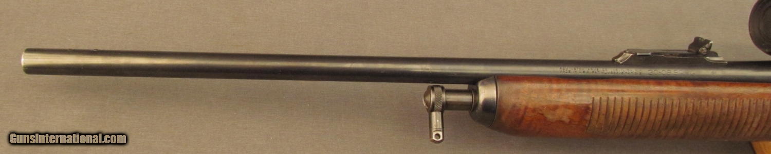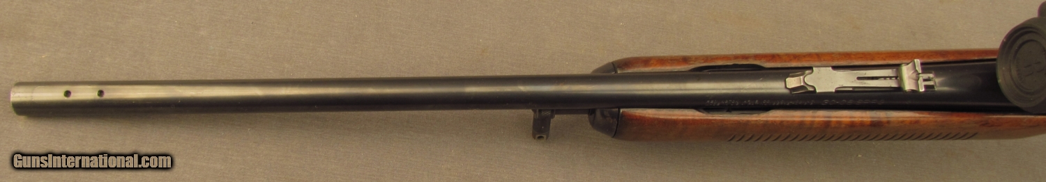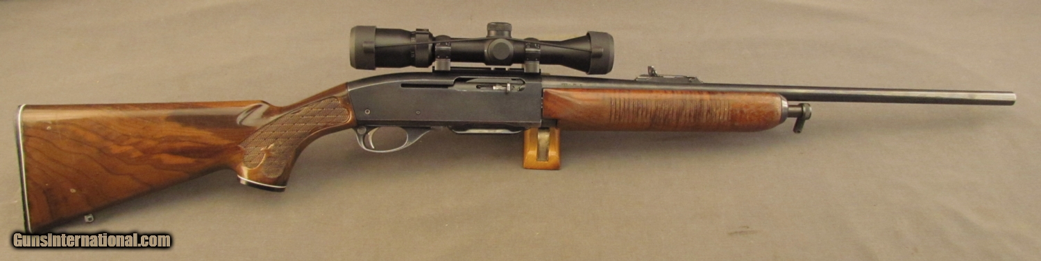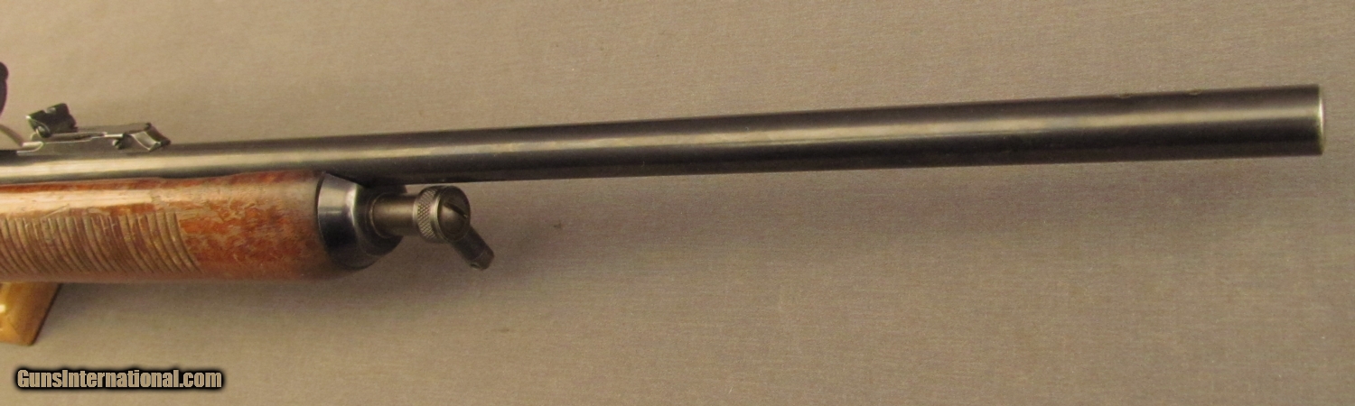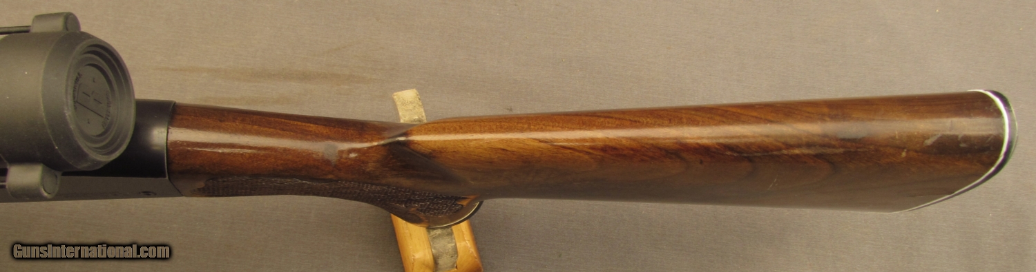 Description: Serial #24226, .30-06, 22” barrel with an excellent, bright bore. This rifle retains 90-95% of the original blue finish with silvering at the muzzle and on the exposed edges and projections. The receiver does exhibit some mild freckling on both sides at the carry point towards the front. There is some further gray fading along the underside of the receiver and, more noticeably, on the trigger guard. The grooved walnut forend and press-checkered, pistol grip buttstock have numerous small handling marks and minor surface blemishes including finish loss at the grooves on the forend. The rifle retains its original rear barrel sight, but the front sight ramp has been removed and a swiveling QD sling stud has been installed on the nose of the forend. The rifle is topped by a Bushnell Legend 1.75x – 5x scope with duplex reticle and original bikini-style lens covers. This is a handy woods rifle with quality optics and rates fine condition overall. FFL SOLD Manufacturer: Remington Model: 742 Serial Number: 24226 Caliber Info: .30-06 Gauge Info: .30-06 |