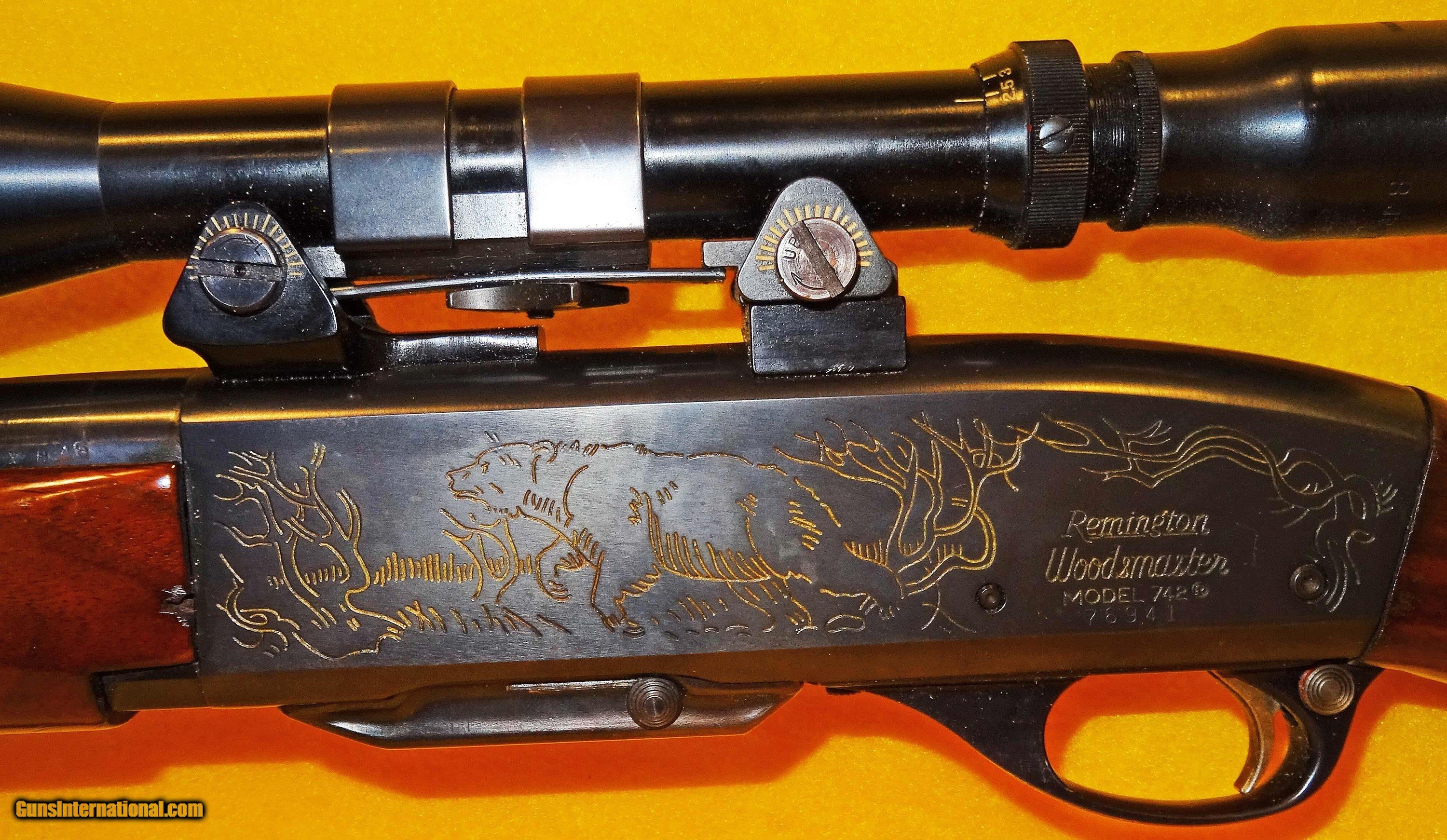 Description: REMINGTON WOODSMASTER 742 CARBINE IN 30-06 CAL., WITH 19" BARREL. COLOR BLUE. CONDITION 95%+. SERIAL NUMBER 76941. REMINGTON MODEL WOODSMASTER 742 CARBINE, MIRROR BORE, STOCK EXCELLENT SMALL CRACK IN FRONT RIGHT HAND SIDE OF FORE END, CAME SCENE ON RECEIVER HAS RUNNING BEAR ON LEFT SIDE WITH RUNNING BUCK ON RIGHT SIDE, COMES WITH A BAUSCH & LOMB 2.5X8 POWER SCOPE WITH A TAPERED DUPLEX RETICLE, 95%+ OVERALL CONDITION, OUR STOCK # D526. SOLD |