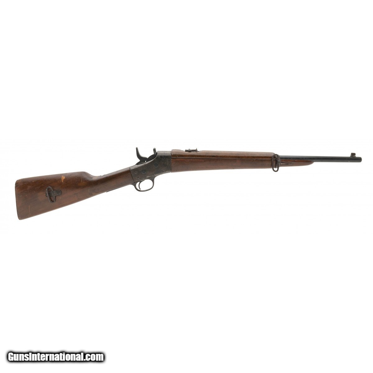 This 7mm Mauser caliber Remington rolling block saddle ring carbine is circa 1897. The great majority of these carbines went to Central and South America. The 20.5"" barrel has a much better than average bore with some brightness and strong rifling. The metal parts have a smooth brown patina with scattered pitting, especially under the handguard. With the exception of *51* on the right side of the receiver, the gun is unmarked. The restored stock is good with scattered areas of fillers and repairs. The sling bar and ring are present on the left side of the receiver and sling swivels are on the right side of the stock. The action functions correctly. This rifle presents well and will fill that hole in your collection.