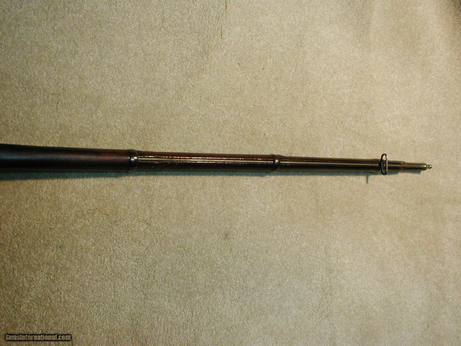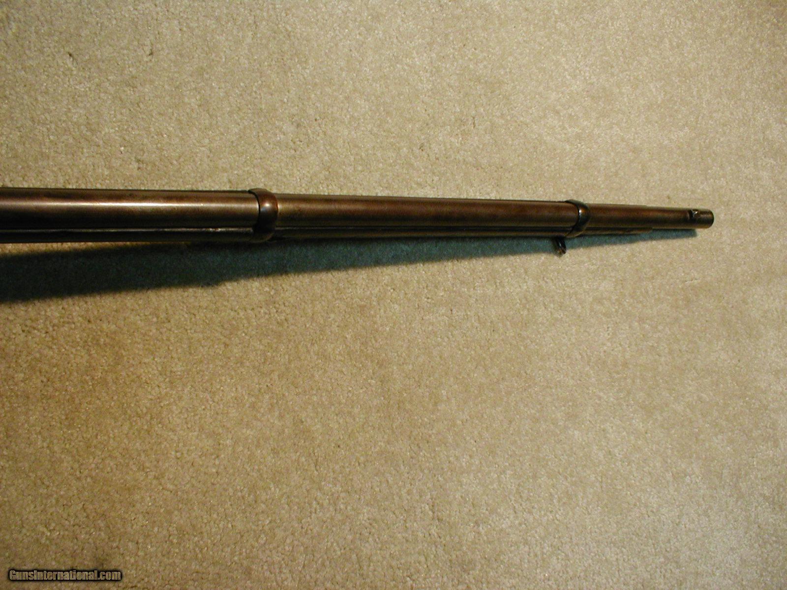 Description: ATTIC CONDITION, NEVER CLEANED .50-70 CALIBER NEW YORK CONTRACT ROLLING BLOCK MILITARY RIFLE, MADE 1871, sharp cartouche in the left side of the wrist with the usual rack number ahead of the butt plate on the top of the stock, nice aged gray/brown patina overall with fine tang markings, correct military style rear sight, exc. bright bore, correct swivels, wood has never been cleaned or sanded and shows normal light handling marks only, cleaning rod intact, tight action, getting hard to find untouched rifles like this. SOLD Antique: Yes Manufacturer: REMINGTON Model: Rolling Block No.1 New York Contract Musket Caliber Info: .50-70 Condition: fine Barrels: 36 |
