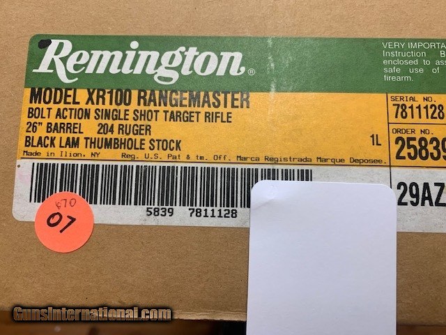 REMINGTON MODEL XR 100 RANGEMASTER 204 CAL. SINGLE SHOT RIFLE, 26” BARREL, BLACK LAMINATE THUMBHOLE STOCK, NEW UNFIRED IN THE BOX