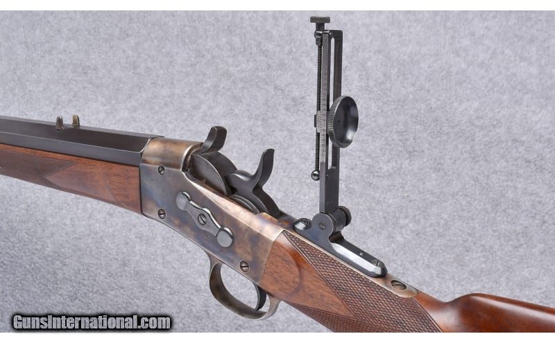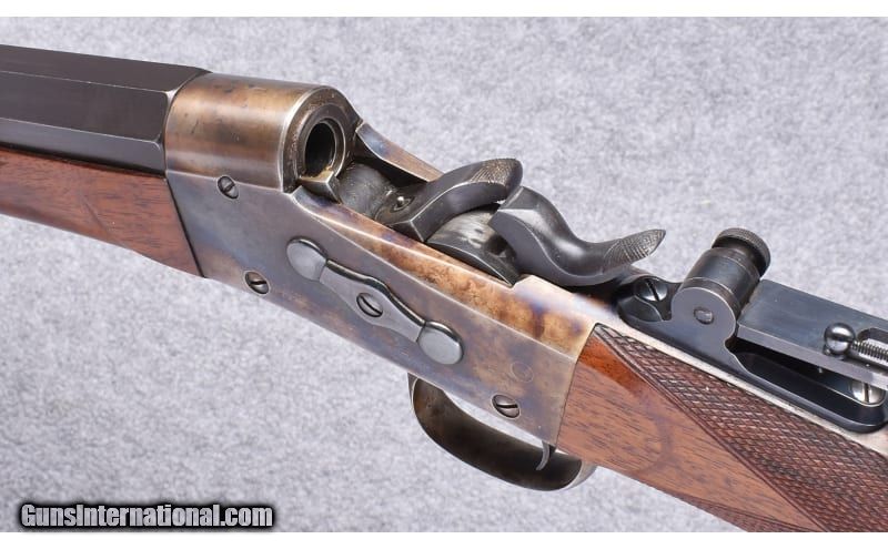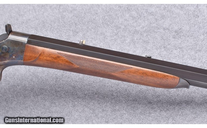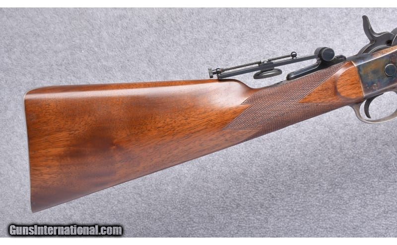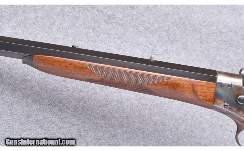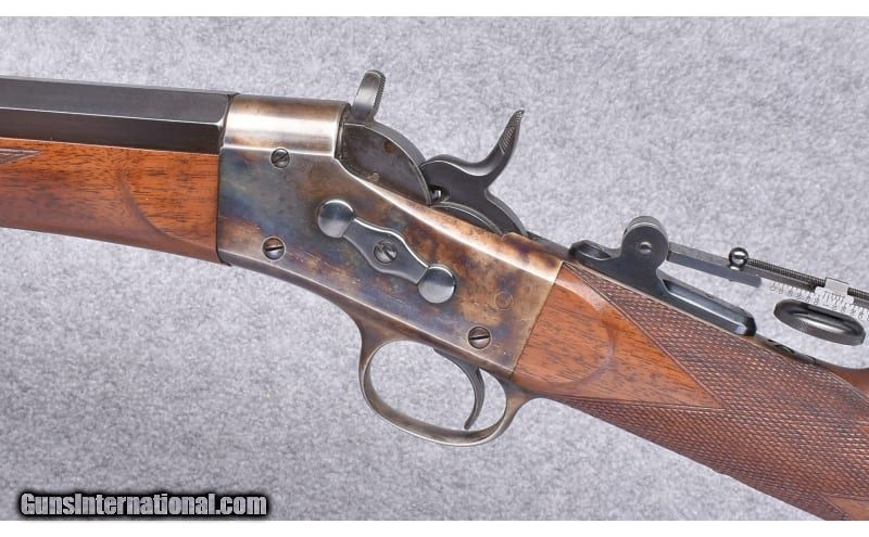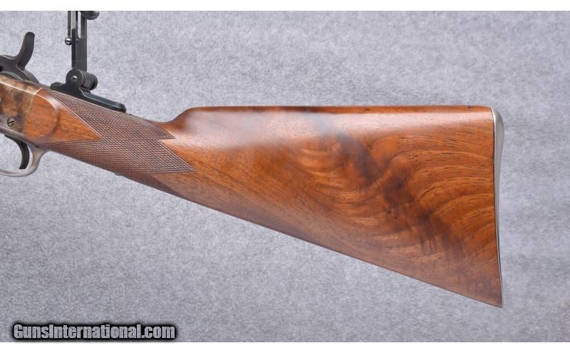 Description: Very attractive custom rifle based on a Remington-style rolling block action, Stamped P.L. Sanders on the barrel and on the tang under the vernier sight. Includes original rear sight and extra globe inserts. None SOLD Metal Condition: Blued and Case Hardened Wood Condition: Checkered High Grade Walnut Bore Condition: "Bright, Sharp Barrels: "28 Inch Octagon, 1 3/16"" across the flats Stock Dimensions: 13 5/8" LOP Fore End: "Checked Walnut, Steel Tip Butt Pad: Steel with Widows Peak Weight: 13 lb Sights: "Vernier Tang Sight, Globe Front Item Location: Buda, TX |