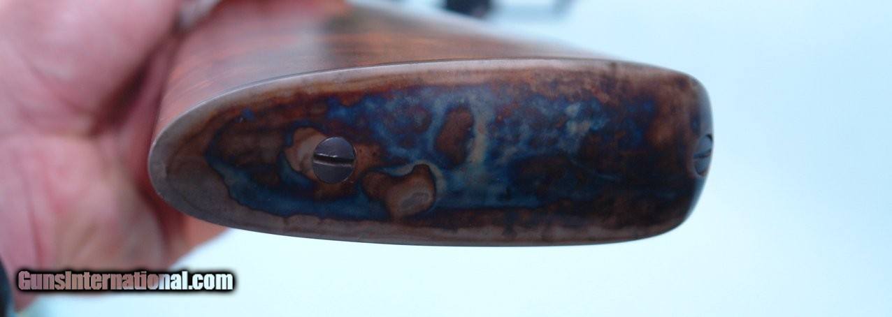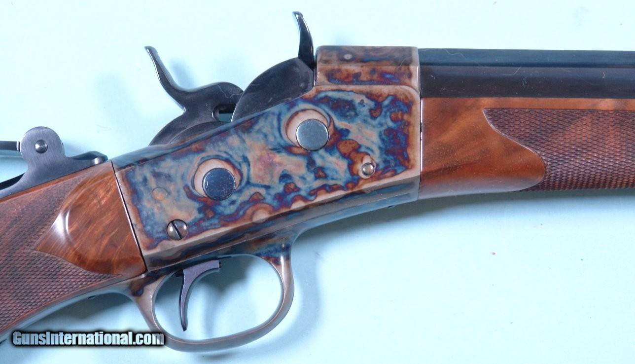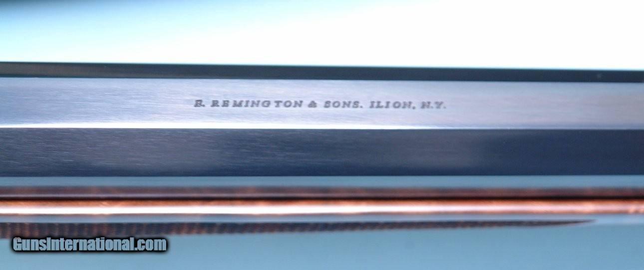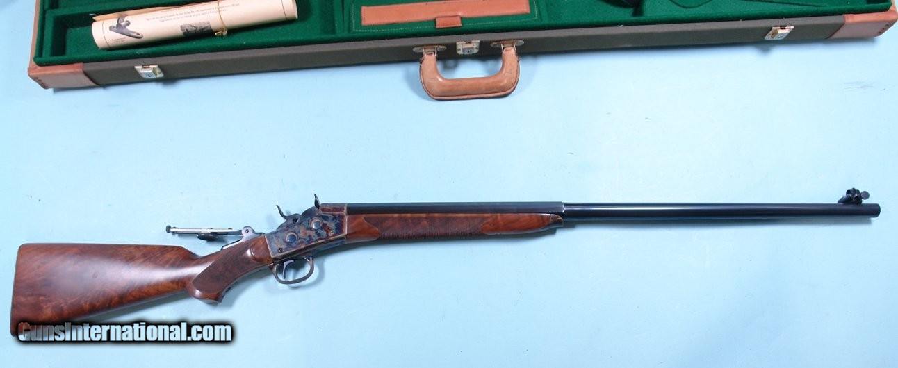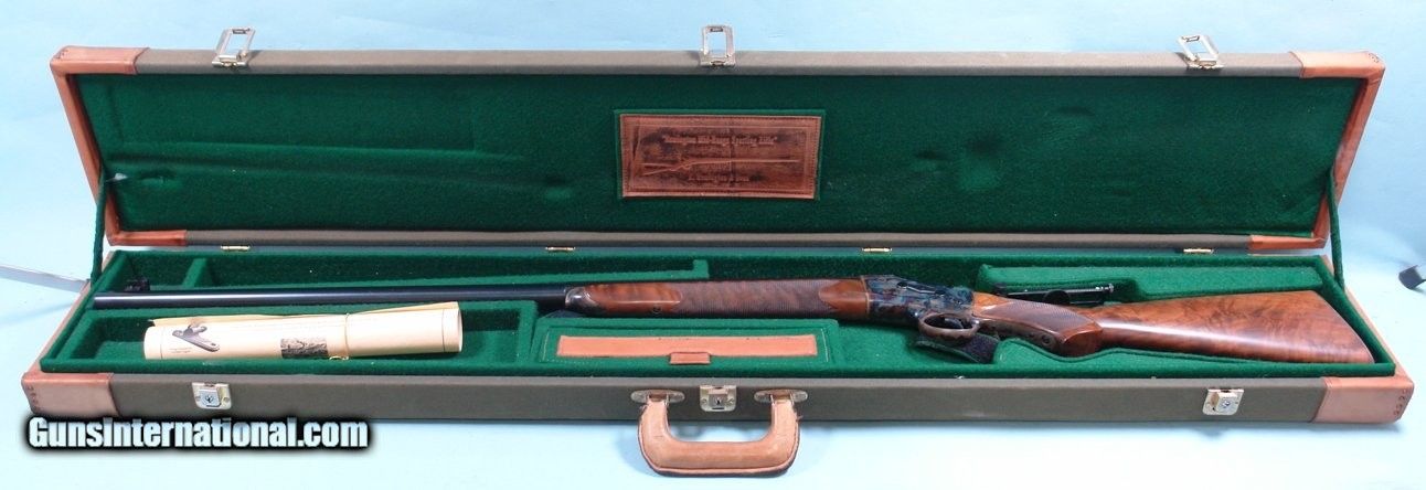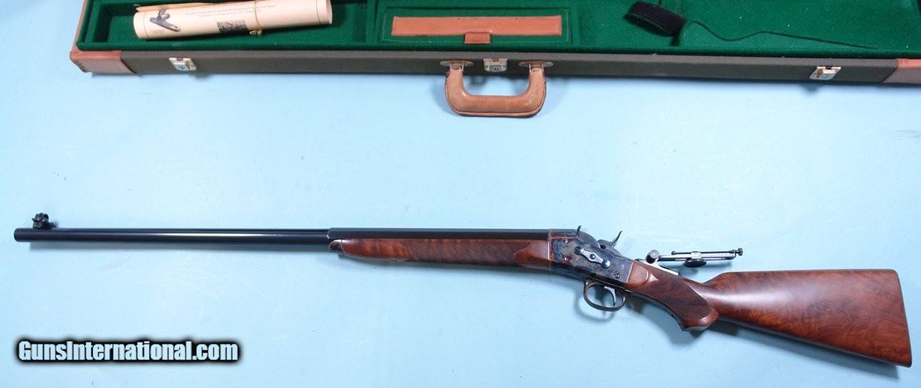Description: UNFIRED FACTORY REMINGTON CUSTOM SHOP ROLLING BLOCK MID-RANGE TARGET .45-70 GOVT. SPORTING RIFLE IN FACTORY CASE WITH CERTIFICATE. Serial number "RB970035" and matching to hand signed certificate. 30" heavy oct./ round barrelled new unfired condition in original case. Hand cut checkering perfect and crisp, steel buttplate, tang mounted vernier peep sight and globe front with spirit level. Re-introduced in 1997. This one from 1998. Prime example. SOLD Rifle Caliber: .45-70 Government |