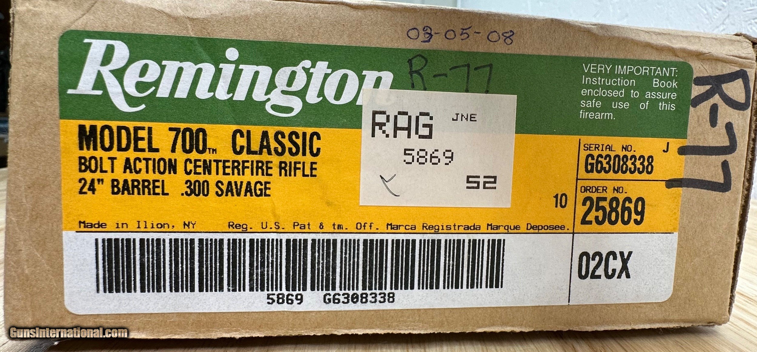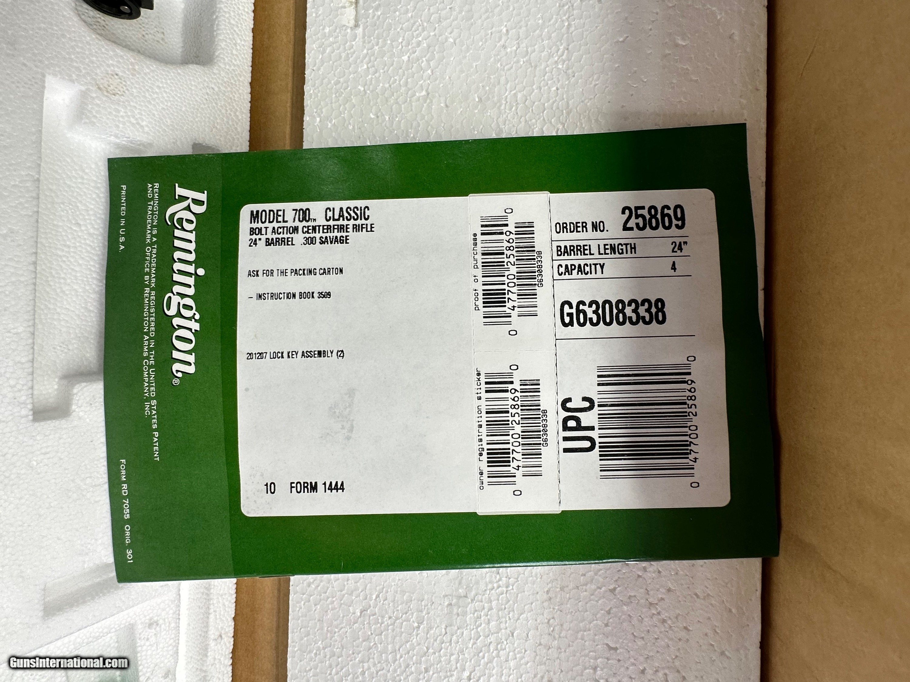Description: This model 700 classic is similar to the Remington BDL but has a classic straight stock and high polish bluing. These limited edition calibers were introduced in 1981 each year these were produced in limited quantities this caliber was produced in 2003 and has never been sold over the counter to the public. It is in Mint un-sold original condition. The box and all original paperwork inside is in Mint condition as well. Perfect to add to your 700 Classic Collection. Maine Residents only add 5.5% Sales Tax Flat 45.00 Shipping buyer can Add shipping insurance at an additional cost if they desire Price reflects a cash discount of 3.5% SOLD Rifle Caliber: .300 Savage Manufacturer: Remington Model: 700 Serial Number: G6308338 Barrel Length: 24 Condition: Mint New Unsold to public Metal Condition: Mint New Unsold to public Wood Condition: Mint New Unsold to public Bore Condition: Mint New Unsold to public Action: Bolt Finish: Blued Manufacture Date: 2003 Item Location: Buxton Maine |