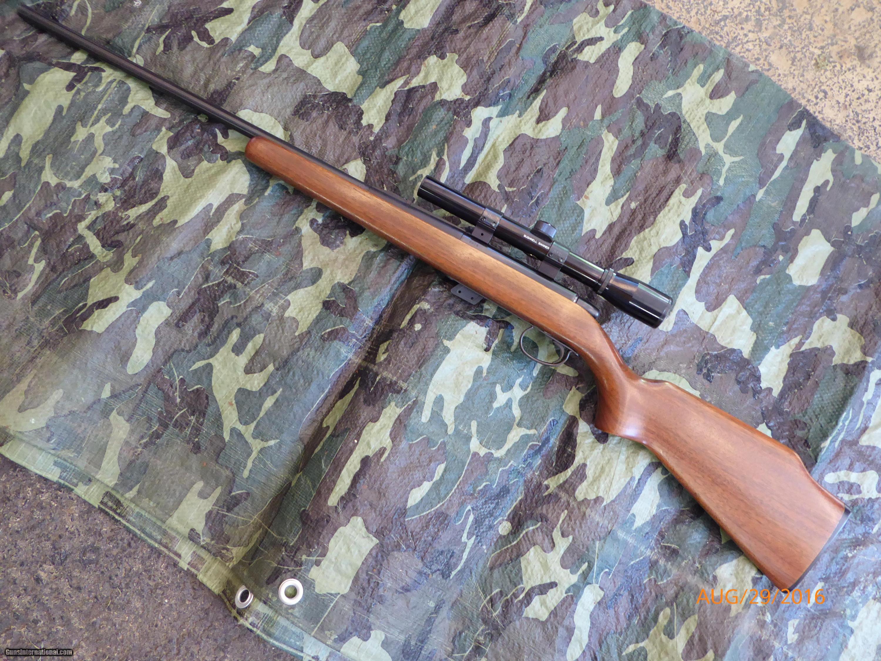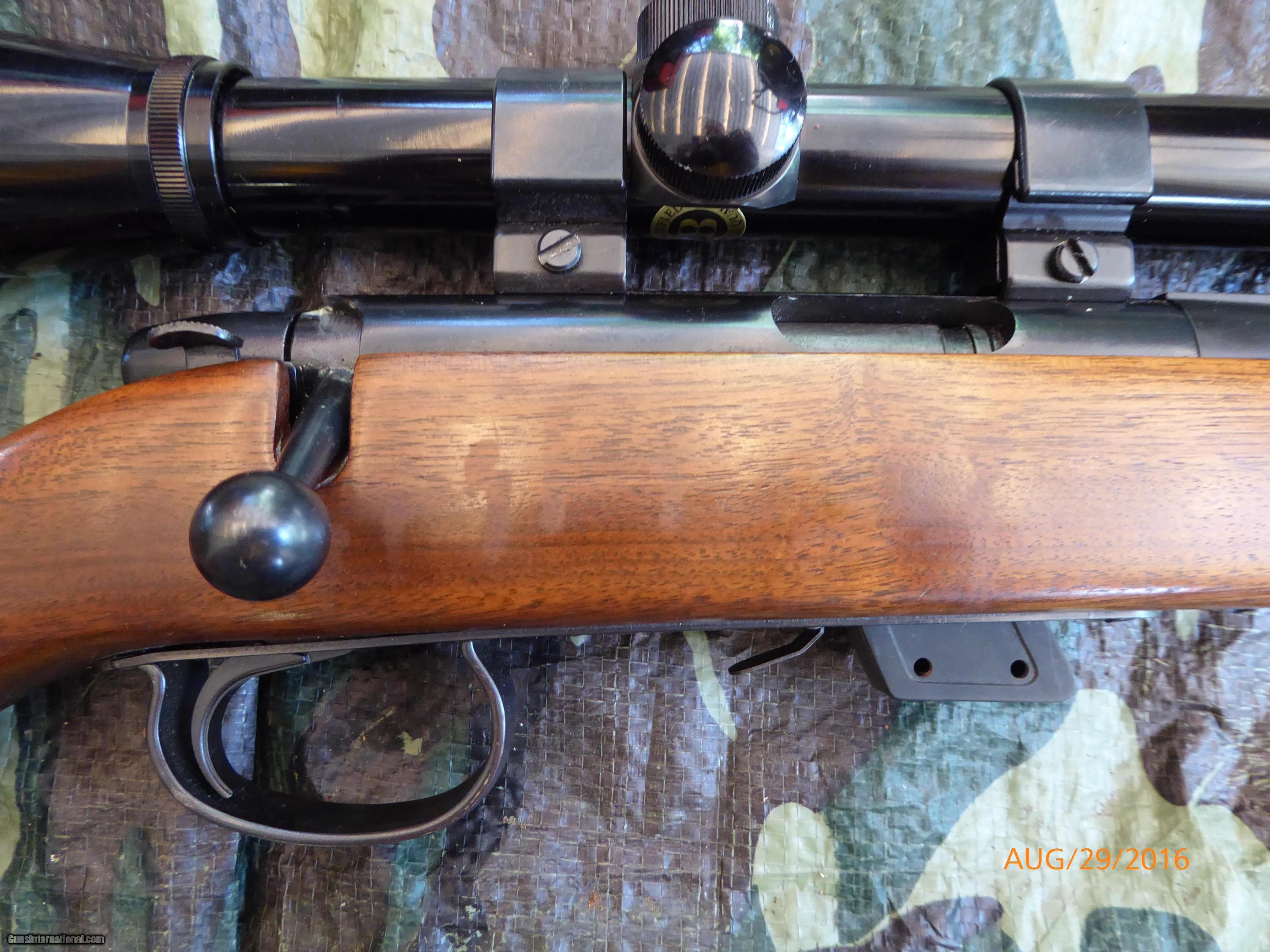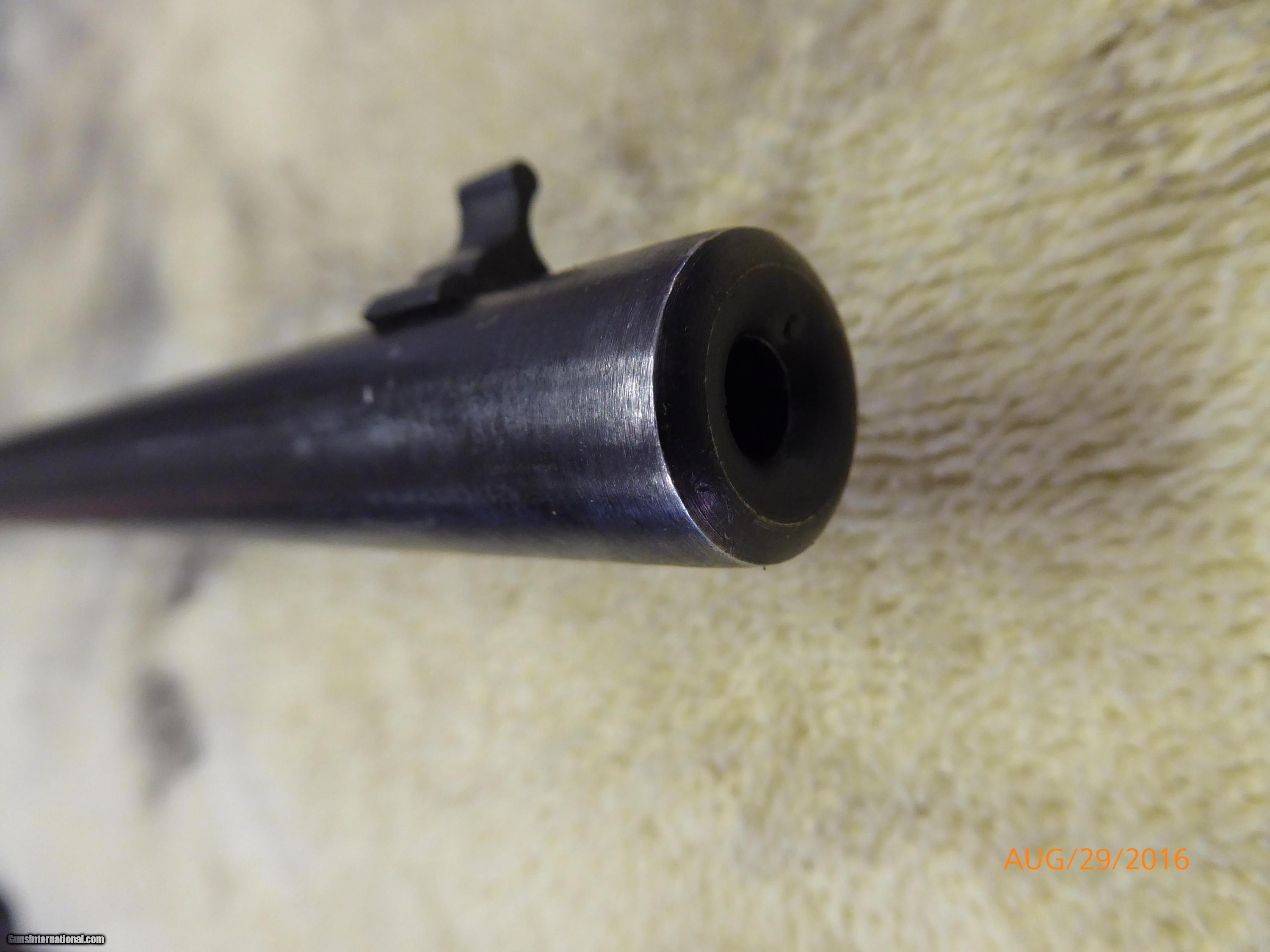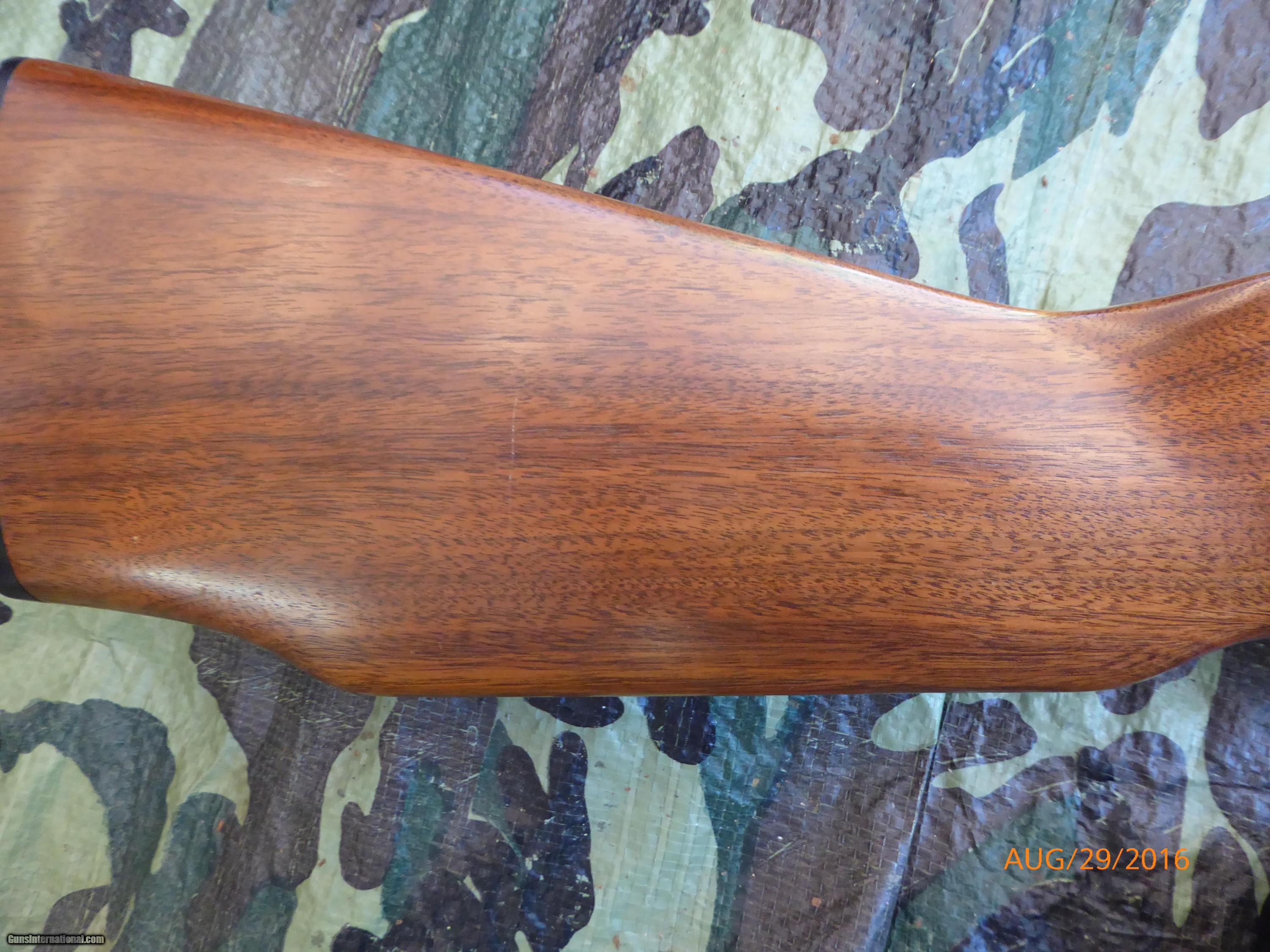 Description: This is an early four digit serial numbered (89XX) rifle with original factory walnut stock (not "hardwood"). Will be shipped with four extra magazines - two 5 shot and two 10 shot. Includes Bushnel Banner 4X-20 scope in Weaver mounts. Stock has several light "runs" on right side that appear to be solvent etching (see photo 3) and a light scratch on the left side of the buttstock (see photo 6). Metal is very good with a little wear at the muzzle (see photo 5) and a floorplate scatch next to a retaining screw (see photo 4). Buyer must furnish a FFL copy from dealer to which item will be shipped. Bank check or money order only accepted. Please add $30.00 for shipping. SOLD |