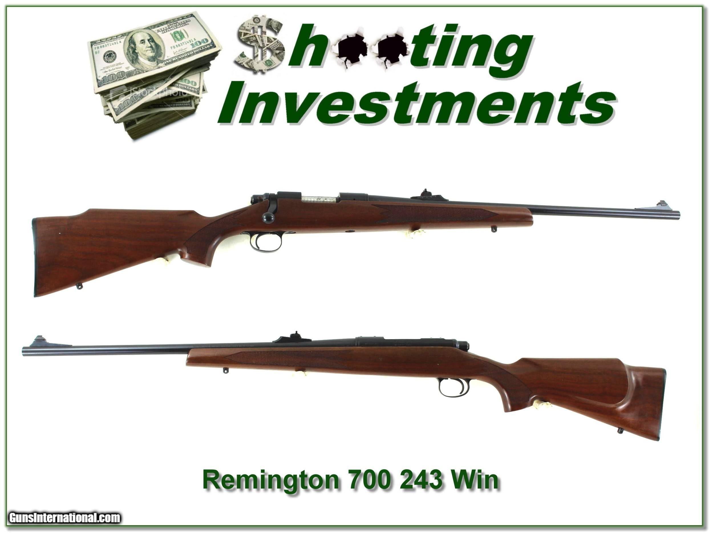 Description: This is a 1983 made Remington 700 in 243 Winchester. The metal is excellent with just a few spots. The bore is bright, shiny and sharp. The wood has a few marks as seen. It will make a classic hunting gun in a low recoil caliber! It is a Shooting Investment! Shipping and insurance is $49. Please email me with any questions or larger pictures. (Consign your quality firearms with Shooting Investments for only 12%! Let me know if you have any you would like to sell!) 22-0697 Payment: Payment is by Money Order, Cashiers Check or Personal Check. I can now also accept Credit Cards (MasterCard, Visa, Discover & American Express) with a 3% convenience fee. Shipping: The shipping charge will be listed in each description. It is $49 for most long guns. Some heavy guns, over 48in boxes or those insured for over $2000 will be higher. Shipments to Alaska and Hawaii are higher because air shipment is required. Most firearms are shipped on Tuesday and Thursday and usually in 5 days of receipt of payment. We package all shipments carefully and insure them. Optics are shipped Priority Mail and most other non-firearm shipments are shipped First Class. Returns: Our return policy is simple. If for any reason you are not pleased with your purchase, you may return your item for a full refund of purchase price. Ammunition cannot be returned. It is important to us that you are happy. Guns cannot be fired or dissembled before returning them and they must be returned in the same condition as received. Notification of a return must occur with-in 3 days of receipt at your dealer. Shipping, convenience and dealer fees are not refundable and are the responsibility of the buyer. Lay-a-way: If needed, we offer a 60 day lay-a-way option on most firearms. It is 1/3 now, 1/3 in 30 days and 1/3 in 60 days. Lay-a-way firearm sales are final and if not completed the first payment cannot be returned. Consigning your firearms with Shooting Investments: We will help you get top dollar for your firearms. While most local guns shops charge 20% or more, our fee is only 12% with a minimum of $75. At your local gun shop it might take months to sell. Selling on-line provides instant access to thousands of interested buyers. You won’t find any other on-line dealer willing to sell your firearms for only 12% or listing every gun on 3 separate s. Selling through an House typically costs the seller 15% and the buyer an addition 15% (so 30%) and you have to wait several months to sell and longer to receive funds. If properly priced, we will sell your firearms in a few weeks. Send us an email or give us a call and we’ll explain how easy it is for you to get top dollar. Trading: Trading for use is really just buying your gun to re-sell. If you have a gun you want to trade, please email a picture and we will let you know what we can give or it. You will always get more if we sell it for you on consignment. Help for California Buyers: We are happy to ship to California. It is the buyer’s responsibility to make sure any item you buy is legal in your state. We are also happy to help with your purchase of a firearm from someone other than us. If you see a gun you would like to buy but the seller can’t or won’t ship to California they can ship to use and we’ll then ship it to your California dealer. The cost for this service is only $30 + shipping. Let us know if we can help! SOLD |