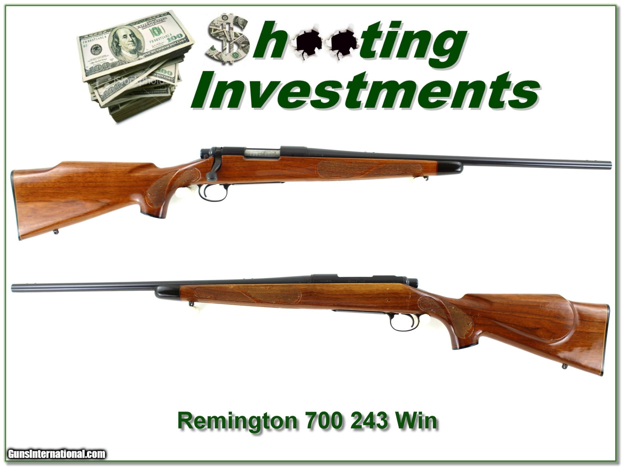 Description: This is an early Pressed Checkering Remington 700 BDL in 243 Winchester. The blue is excellent and from the bolt jeweling I’m sure not many rounds fired. It has a 22in barrel. The wood has just a few minor marks I expect from storage, not use. Shipping and insurance is $39. Please email me with any questions or larger pictures. (Consign your quality firearms with Shooting Investments for only 12%! Let me know if you have any you would like to sell!) 20-0563 Payment: Payment is by Money Order, Cashiers Check or Personal Check. I can now also accept Credit Cards (MasterCard, Visa, Discover & American Express) with a 3% convenience fee. Shipping: The shipping charge will be listed in each description. It is $39 for most firearms. Some heavy guns or those insured for over $2000 will be higher. Shipments to Alaska and Hawaii are higher because air shipment is required. Most firearms are shipped on Tuesday and Thursday and usually in 5 days of receipt of payment. We package all shipments carefully and insure them. Optics are shipped Priority Mail and most other non-firearm shipments are shipped First Class. Returns: Our return policy is simple. If for any reason you are not pleased with your purchase, you may return your item for a full refund of purchase price. Ammunition cannot be returned. It is important to us that you are happy. Guns cannot be fired or dissembled before returning them and they must be returned in the same condition as received. Notification of a return must occur with-in 3 days of receipt at your dealer. Shipping, convenience and dealer fees are not refundable and are the responsibility of the buyer. Lay-a-way: If needed, we offer a 60 day lay-a-way option on most firearms. It is 1/3 now, 1/3 in 30 days and 1/3 in 60 days. Lay-a-way firearm sales are final and if not completed the first payment cannot be returned. Consigning your firearms with Shooting Investments: We will help you get top dollar for your firearms. While most local guns shops charge 20% or more, our fee is only 12% with a minimum of $75. At your local gun shop it might take months to sell. Selling on-line provides instant access to thousands of interested buyers. You won’t find any other on-line dealer willing to sell your firearms for only 12% or listing every gun on 3 separate s. Selling through an House typically costs the seller 15% and the buyer an addition 15% (so 30%) and you have to wait several months to sell and longer to receive funds. If properly priced, we will sell your firearms in a few weeks. Send us an email or give us a call and we’ll explain how easy it is for you to get top dollar. Trading: Trading for use is really just buying your gun to re-sell. If you have a gun you want to trade, please email a picture and we will let you know what we can give or it. You will always get more if we sell it for you on consignment. Help for California Buyers: We are happy to ship to California. It is the buyer’s responsibility to make sure any item you buy is legal in your state. We are also happy to help with your purchase of a firearm from someone other than us. If you see a gun you would like to buy but the seller can’t or won’t ship to California they can ship to use and we’ll then ship it to your California dealer. The cost for this service is only $30 + shipping. Let us know if we can help! SOLD |