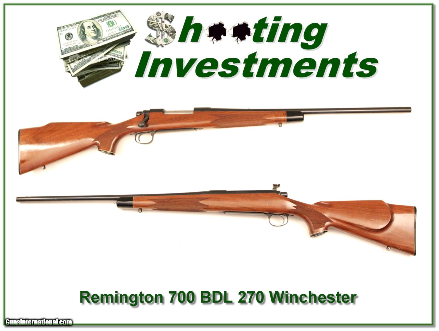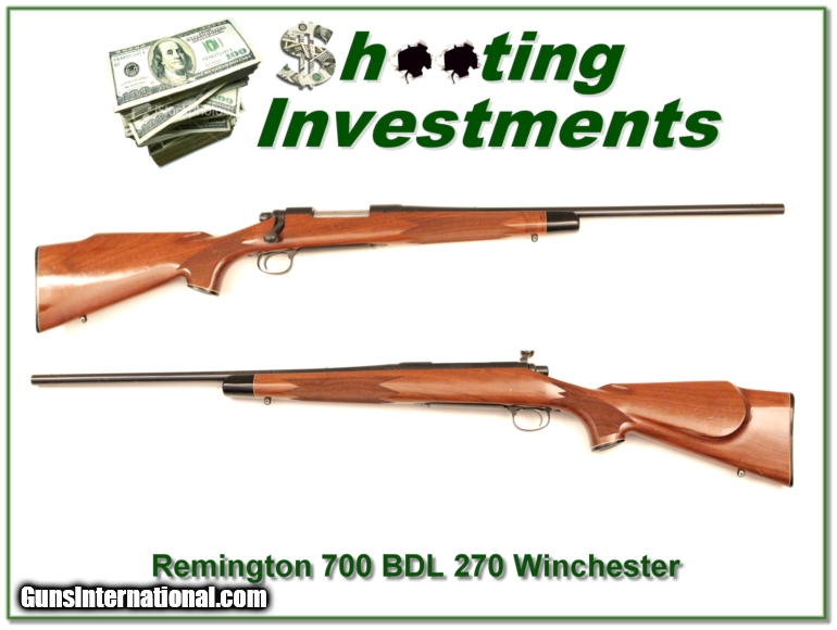 Description: This is a Remington BDL in 270 Winchester. The blue is excellent. The wood has some hunting marks as shown. This one will make a very nice hunting gun. Shipping and insurance is $30 or $18 more if you want it shipped in a new Plano hard case. Please email me with any questions or larger pictures. (I now consign quality firearms only 10%! Let me know if you have any you would like to sell!) [15-0425] Payment: Payment is by Money Order, Cashiers Check or Personal Check. I can now also accept MasterCard and Visa with a 3% convenience fee. PayPal can be used for some items but never firearms. Please let us know if you would like to pay via PayPal. Shipping: The shipping charge will be listed in each description. It is $30 for most guns. Some heavy guns or those insured for over $2000 may be higher. Shipments to Alaska and Hawaii are higher because air shipment is required. Most firearms are shipped within 5 days of receipt of payment. We prefer shipping at the beginning of the week to avoid firearms in transit over weekends. We package all shipments carefully and insure them for the full purchase price, rounded up to the next $100. In the unlikely event that damage occurs, it is important that you save all packaging material for the claims process. Optics are shipped Priority Mail and most other non-firearm shipments are shipped First Class. Returns: Our return policy is simple. If for any reason you are not pleased with your purchase, you may return your item for a refund. The only exception is ammunition, it cannot be returned. It is important to us that you are happy. Guns cannot be fired or dissembled before returning them and must be returned in the same condition as received. Notification of a return must occur with-in 3 days of receipt at your dealer. Shipping, convenience and dealer fees are not refundable and are the responsibility of the buyer. Lay-a-way: If needed, we offer a 60 day lay-a-way option on most firearms. It is 1/3 now, 1/3 in 30 days and 1/3 in 60 days. Lay-a-way firearm sales are final. Consigning your firearms with Shooting Investments: We will help you get top dollar for your firearms. While most local guns shops charge 20% or more, our fee is only 10% with a minimum of $50. At your local gun shop it might take months to sell. Selling on-line provides instant access to thousands of interested buyers. You won’t find any other on-line dealer willing to sell your firearms for only 10% or listing every gun on 4 separate s. Selling through an House typically costs the seller 15% and the buyer an addition 15% (so 30%) and you have to wait several months to sell and longer to receive funds. If properly priced, we will sell your firearms in a week or two. Send us an email or give us a call and we’ll explain how easy it is for you to get top dollar. Trading: We collect guns and usually just trade for guns we want to add to our collections. We often sell guns for others wanting to purchase one of ours. We find this the most fair to both of us. Our Commission is only 10% and we hold the gun you want until yours sells. Please contact us if you want to sell one of yours to buy one of ours. Help for California Buyers: We are happy to ship to California. It is the buyer’s responsibility to make sure any item you buy is legal in your state. We are also happy to help with your purchase of a firearm from someone other than us. If you see a gun you would like to buy but the seller can’t or won’t ship to California we can help. You buy the gun and have it shipped to us. We’ll then ship it to your California dealer. The cost for this service is only $30 + shipping. Let me know if we can help! SOLD |