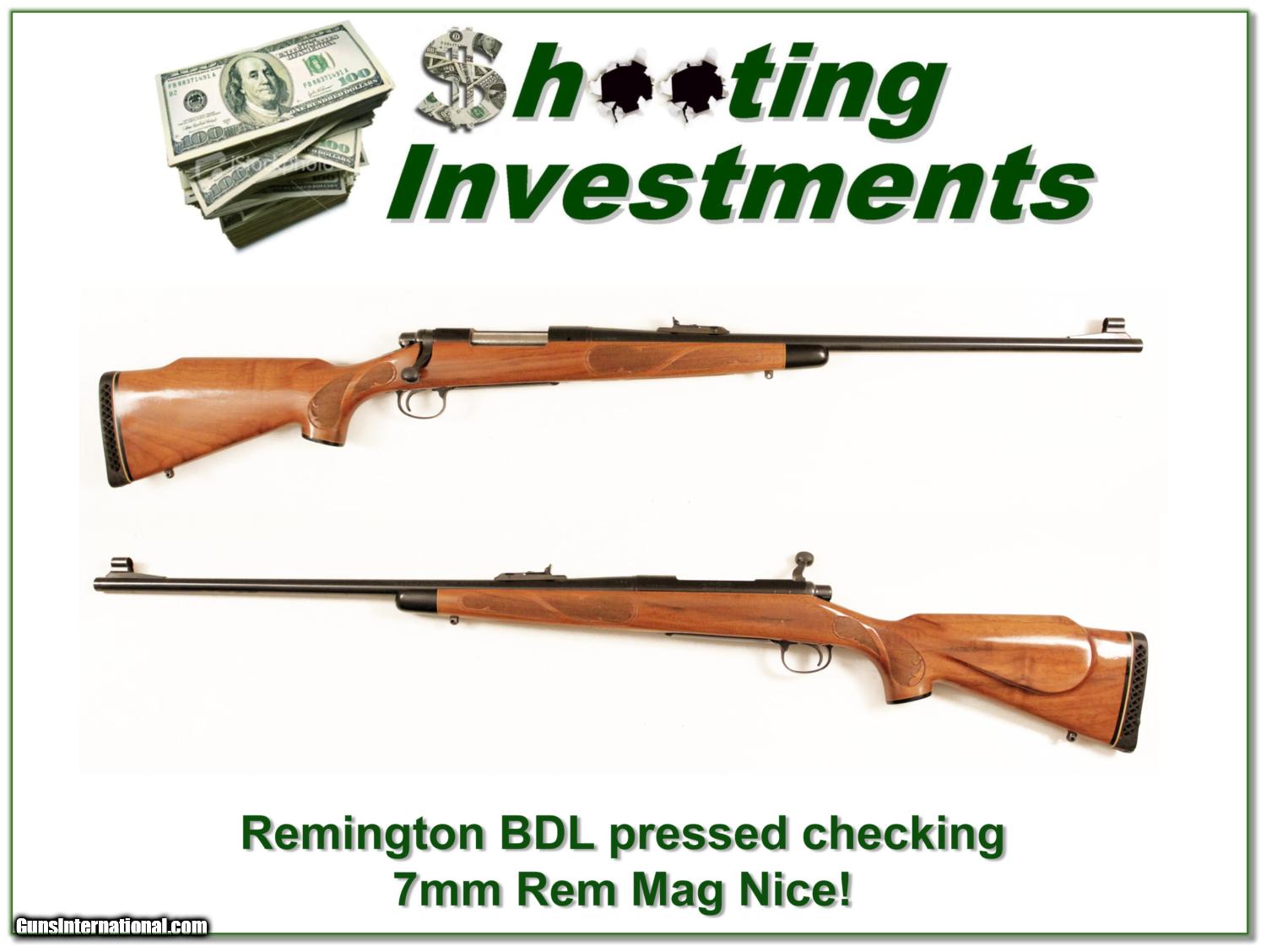Description: This is very nice Remington 700 BDL in 7mm Rem Mag. It is an earlier pressed checkering gun. The blue is excellent and the wood has only a few marks. It will make a nice classic hunting gun or addition to your collection. It is a Shooting Investment as it is one you can use yet expect to increase in value over time. Shipping and insurance is $30 or $18 more if you want it shipped in a new Plano hard case. Please email me with any questions or larger pictures. (I now consign quality firearms only 10%! Let me know if you have any you would like to sell!) [15-0259] Terms & Conditions Payment: Payment is by Money Order, Cashiers Check or Personal Check. I can now also accept MasterCard and Visa with a 3% convenience fee. PayPal can be used for some items but never firearms. Please let us know if you would like to pay via PayPal. Shipping: The shipping charge will be listed in each description. It is $30 for most guns. Some heavy guns or those insured for over $2000 may be higher. Shipments to Alaska and Hawaii are higher because air shipment is required. Most firearms are shipped within 5 days of receipt of payment. We prefer shipping at the beginning of the week to avoid firearms in transit over weekends. We package all shipments carefully and insure them for the full purchase price, rounded up to the next $100. In the unlikely event that damage occurs, it is important that you save all packaging material for the claims process. Optics are shipped Priority Mail and most other non-firearm shipments are shipped First Class. Returns: Our return policy is simple. If for any reason you are not pleased with your purchase, you may return your item for a refund. The only exception is ammunition, it cannot be returned. It is important to us that you are happy. Guns cannot be fired or dissembled before returning them and must be returned in the same condition as received. Notification of a return must occur with-in 3 days of receipt at your dealer. Shipping, convenience and dealer fees are not refundable and are the responsibility of the buyer. Lay-a-way: If needed, we offer a 60 day lay-a-way option on most firearms. It is 1/3 now, 1/3 in 30 days and 1/3 in 60 days. Lay-a-way firearm sales are final. Consigning your firearms with Shooting Investments: We will help you get top dollar for your firearms. While most local guns shops charge 20% or more, our fee is only 10% with a minimum of $50. At your local gun shop it might take months to sell. Selling on-line provides instant access to thousands of interested buyers. You won’t find any other on-line dealer willing to sell your firearms for only 10% or listing every gun on 4 separate s. Selling through an House typically costs 15% and you have to wait several months to sell and longer to receive funds. If properly priced, we will sell your firearms in a week or two. Send us an email or give us a call and we’ll explain how easy it is for you to get top dollar. Trading: We collect guns and usually just trade for guns we want to add to our collections. We often sell guns for others wanting to purchase one of ours. We find this the most fair to both of us. Our Commission is only 10% and we hold the gun you want until yours sells. Please contact us if you want to sell one of yours to buy one of ours. Help for California Buyers: We are happy to ship to California. It is the buyer’s responsibility to make sure any item you buy is legal in your state. We are also happy to help with your purchase of a firearm from someone other than us. If you see a gun you would like to buy but the seller can’t or won’t ship to California we can help. You buy the gun and have it shipped to us. We’ll then ship it to your California dealer. The cost for this service is only $30 + shipping. Let me know if we can help! SOLD |