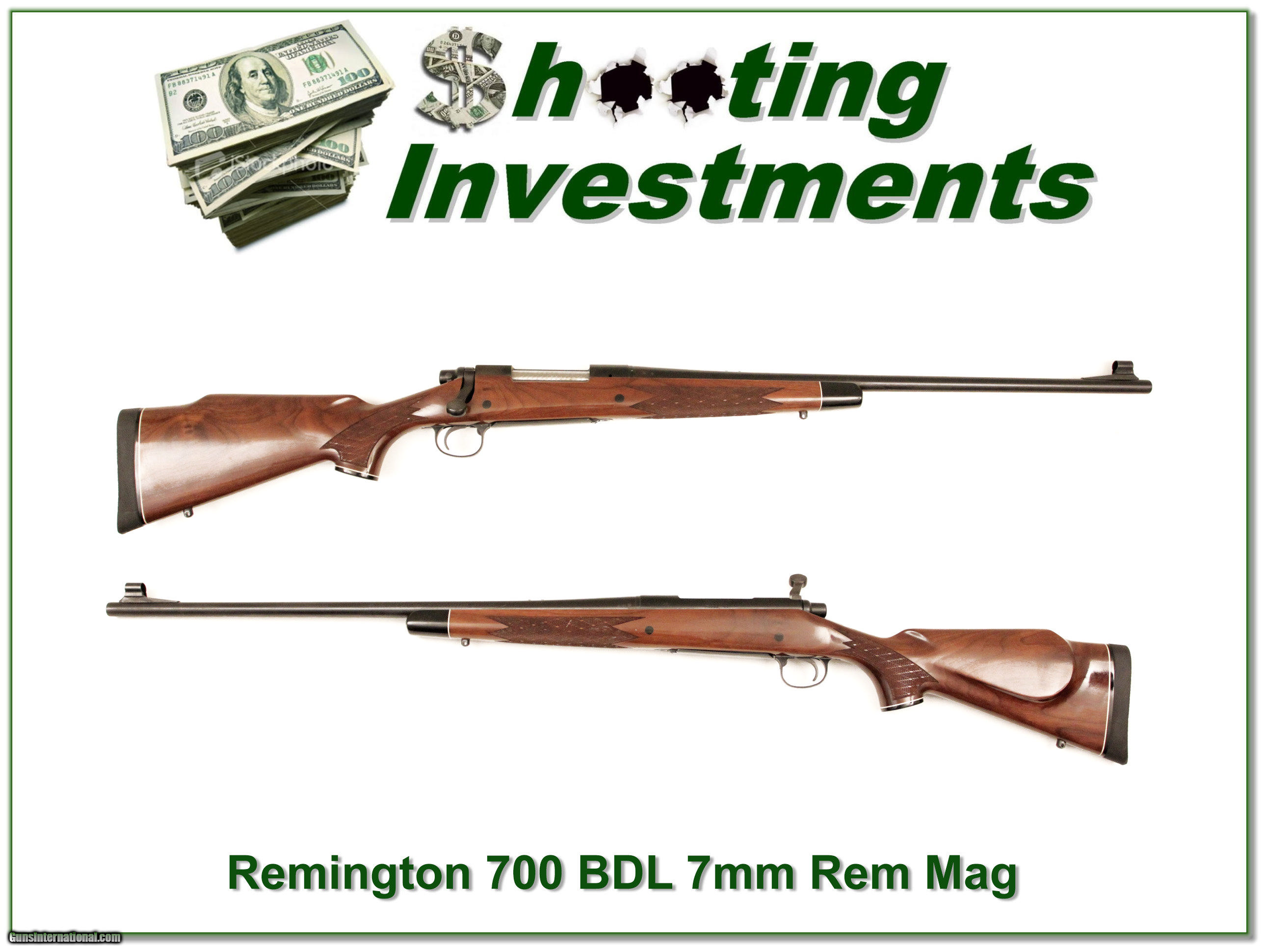 Description: This is a Remington 700 BDL in 7mm Remington Magnum. The wood has beautiful grain and is MUCH nicer than most. Both blue and wood are excellent with only a couple minor marks. This will make a nice classic gun for your collection! Shipping and insurance is $35 or $15 more if you want it shipped in a new Plano hard case. Please email me with any questions or larger pictures. (I now consign quality firearms only 10%! Let me know if you have any you would like to sell!) [16-0322] Payment: Payment is by Money Order, Cashiers Check or Personal Check. I can now also accept MasterCard and Visa with a 3% convenience fee. PayPal can be used for some items but never firearms. Please let us know if you would like to pay via PayPal. Shipping: The shipping charge will be listed in each description. It is $35 for most guns. Some heavy guns or those insured for over $2000 will be higher. Shipments to Alaska and Hawaii are higher because air shipment is required. Most firearms are shipped within 5 days of receipt of payment. We prefer shipping at the beginning of the week to avoid firearms in transit over weekends. We package all shipments carefully and insure them for the full purchase price, rounded up to the next $100. In the unlikely event that damage occurs, it is important that you save all packaging material for the claims process. Optics are shipped Priority Mail and most other non-firearm shipments are shipped First Class. Returns: Our return policy is simple. If for any reason you are not pleased with your purchase, you may return your item for a refund. The only exception is ammunition, it cannot be returned. It is important to us that you are happy. Guns cannot be fired or dissembled before returning them and must be returned in the same condition as received. Notification of a return must occur with-in 3 days of receipt at your dealer. Shipping, convenience and dealer fees are not refundable and are the responsibility of the buyer. Lay-a-way: If needed, we offer a 60 day lay-a-way option on most firearms. It is 1/3 now, 1/3 in 30 days and 1/3 in 60 days. Lay-a-way firearm sales are final. Consigning your firearms with Shooting Investments: We will help you get top dollar for your firearms. While most local guns shops charge 20% or more, our fee is only 10% with a minimum of $50. At your local gun shop it might take months to sell. Selling on-line provides instant access to thousands of interested buyers. You won’t find any other on-line dealer willing to sell your firearms for only 10% or listing every gun on 4 separate s. Selling through an House typically costs the seller 15% and the buyer an addition 15% (so 30%) and you have to wait several months to sell and longer to receive funds. If properly priced, we will sell your firearms in a week or two. Send us an email or give us a call and we’ll explain how easy it is for you to get top dollar. Trading: We collect guns and usually just trade for guns we want to add to our collections. We often sell guns for others wanting to purchase one of ours. We find this the most fair to both of us. Our Commission is only 10% and we hold the gun you want until yours sells. Please contact us if you want to sell one of yours to buy one of ours. Help for California Buyers: We are happy to ship to California. It is the buyer’s responsibility to make sure any item you buy is legal in your state. We are also happy to help with your purchase of a firearm from someone other than us. If you see a gun you would like to buy but the seller can’t or won’t ship to California we can help. You buy the gun and have it shipped to us. We’ll then ship it to your California dealer. The cost for this service is only $30 + shipping. Let me know if we can help! SOLD |