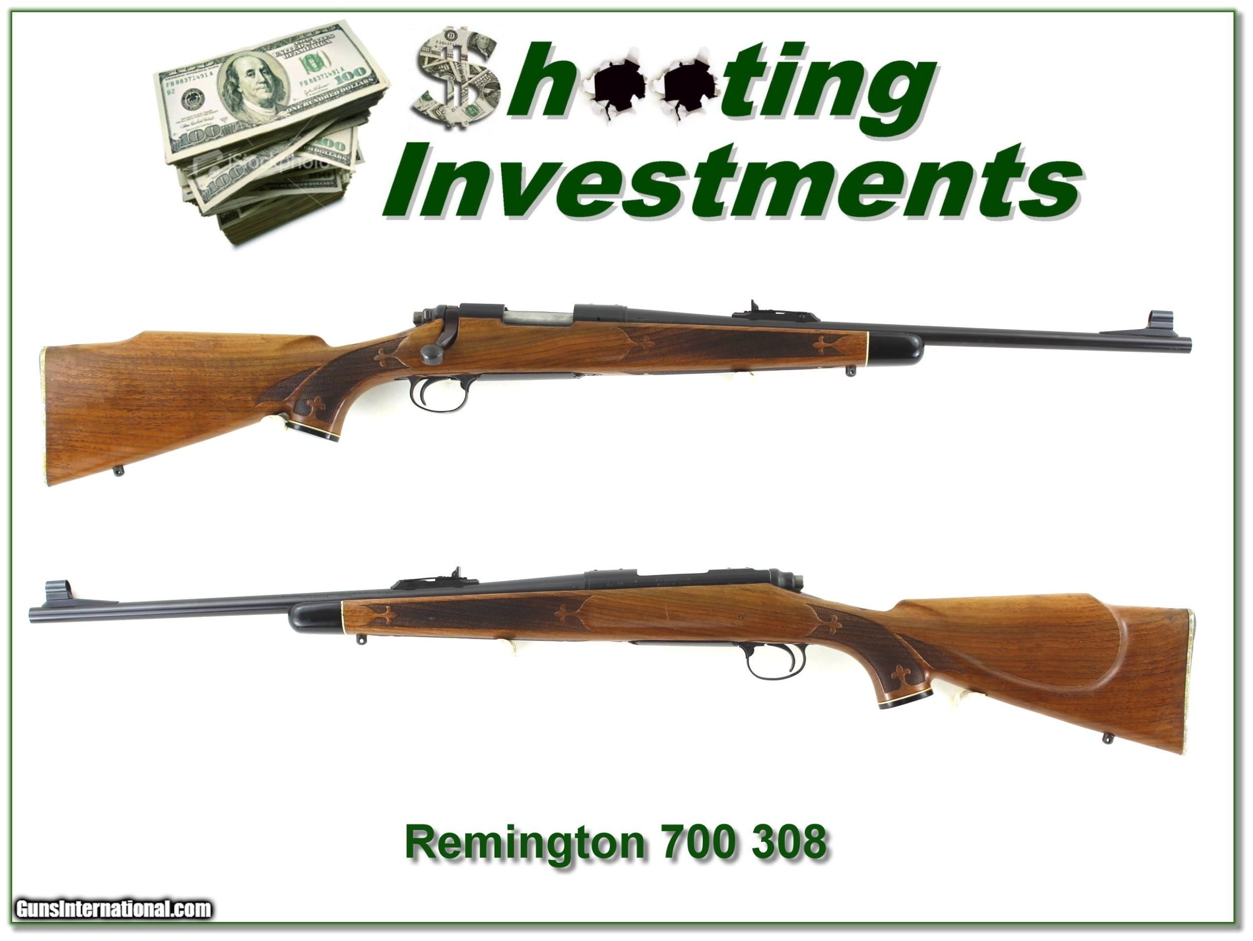 Description: This is an excellent collector condition and VERY hard to find first year 1962 made Remington 700 in 308 Winchester. It is the 20in carbine. The metal is excellent near new condition. The wood has the early pressed checking patter and aluminum butt and only a few minor marks I expect more from storage than use. I don’t think a scope was ever mounted and I’m sure not many rounds fired. This one will make a fine addition to your collection. There will be no more like this! It is a real Shooting Investment. Shipping and insurance is $49. Please email me with any questions or larger pictures. (Consign your quality firearms with Shooting Investments for only 12%! Let me know if you have any you would like to sell!) 21-0604 Payment: Payment is by Money Order, Cashiers Check or Personal Check. I can now also accept Credit Cards (MasterCard, Visa, Discover & American Express) with a 3% convenience fee. Shipping: The shipping charge will be listed in each description. It is $39 for most firearms. Some heavy guns or those insured for over $2000 will be higher. Shipments to Alaska and Hawaii are higher because air shipment is required. Most firearms are shipped on Tuesday and Thursday and usually in 5 days of receipt of payment. We package all shipments carefully and insure them. Optics are shipped Priority Mail and most other non-firearm shipments are shipped First Class. Returns: Our return policy is simple. If for any reason you are not pleased with your purchase, you may return your item for a full refund of purchase price. Ammunition cannot be returned. It is important to us that you are happy. Guns cannot be fired or dissembled before returning them and they must be returned in the same condition as received. Notification of a return must occur with-in 3 days of receipt at your dealer. Shipping, convenience and dealer fees are not refundable and are the responsibility of the buyer. Lay-a-way: If needed, we offer a 60 day lay-a-way option on most firearms. It is 1/3 now, 1/3 in 30 days and 1/3 in 60 days. Lay-a-way firearm sales are final and if not completed the first payment cannot be returned. Consigning your firearms with Shooting Investments: We will help you get top dollar for your firearms. While most local guns shops charge 20% or more, our fee is only 12% with a minimum of $75. At your local gun shop it might take months to sell. Selling on-line provides instant access to thousands of interested buyers. You won’t find any other on-line dealer willing to sell your firearms for only 12% or listing every gun on 3 separate s. Selling through an House typically costs the seller 15% and the buyer an addition 15% (so 30%) and you have to wait several months to sell and longer to receive funds. If properly priced, we will sell your firearms in a few weeks. Send us an email or give us a call and we’ll explain how easy it is for you to get top dollar. Trading: Trading for use is really just buying your gun to re-sell. If you have a gun you want to trade, please email a picture and we will let you know what we can give or it. You will always get more if we sell it for you on consignment. Help for California Buyers: We are happy to ship to California. It is the buyer’s responsibility to make sure any item you buy is legal in your state. We are also happy to help with your purchase of a firearm from someone other than us. If you see a gun you would like to buy but the seller can’t or won’t ship to California they can ship to use and we’ll then ship it to your California dealer. The cost for this service is only $30 + shipping. Let us know if we can help! SOLD |