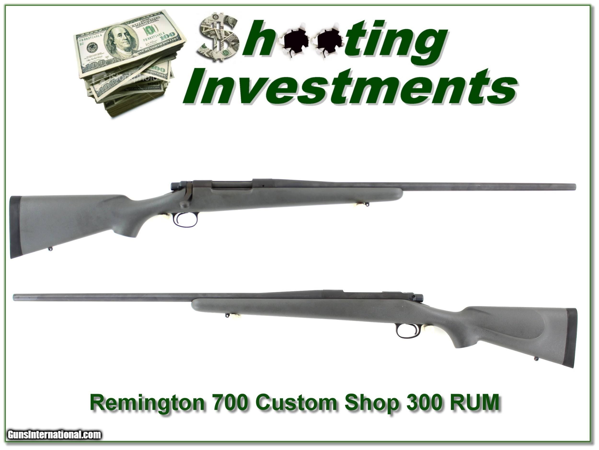 Description: This is a like new Remington 700 Custom Shop 300 RUM. It has a factory Custom Shop stock and a 26in barrel. All metal was factory cerakoted. From the bolt I am sure only a couple rounds fired since being built. It will make a high-end long-range big game gun. Shipping and insurance is $39. Please email me with any questions or larger pictures. (Consign your quality firearms with Shooting Investments for only 12%! Let me know if you have any you would like to sell!) 20-0623 Payment: Payment is by Money Order, Cashiers Check or Personal Check. I can now also accept Credit Cards (MasterCard, Visa, Discover & American Express) with a 3% convenience fee. Shipping: The shipping charge will be listed in each description. It is $39 for most firearms. Some heavy guns or those insured for over $2000 will be higher. Shipments to Alaska and Hawaii are higher because air shipment is required. Most firearms are shipped on Tuesday and Thursday and usually in 5 days of receipt of payment. We package all shipments carefully and insure them. Optics are shipped Priority Mail and most other non-firearm shipments are shipped First Class. Returns: Our return policy is simple. If for any reason you are not pleased with your purchase, you may return your item for a full refund of purchase price. Ammunition cannot be returned. It is important to us that you are happy. Guns cannot be fired or dissembled before returning them and they must be returned in the same condition as received. Notification of a return must occur with-in 3 days of receipt at your dealer. Shipping, convenience and dealer fees are not refundable and are the responsibility of the buyer. Lay-a-way: If needed, we offer a 60 day lay-a-way option on most firearms. It is 1/3 now, 1/3 in 30 days and 1/3 in 60 days. Lay-a-way firearm sales are final and if not completed the first payment cannot be returned. Consigning your firearms with Shooting Investments: We will help you get top dollar for your firearms. While most local guns shops charge 20% or more, our fee is only 12% with a minimum of $75. At your local gun shop it might take months to sell. Selling on-line provides instant access to thousands of interested buyers. You won’t find any other on-line dealer willing to sell your firearms for only 12% or listing every gun on 3 separate s. Selling through an House typically costs the seller 15% and the buyer an addition 15% (so 30%) and you have to wait several months to sell and longer to receive funds. If properly priced, we will sell your firearms in a few weeks. Send us an email or give us a call and we’ll explain how easy it is for you to get top dollar. Trading: Trading for use is really just buying your gun to re-sell. If you have a gun you want to trade, please email a picture and we will let you know what we can give or it. You will always get more if we sell it for you on consignment. Help for California Buyers: We are happy to ship to California. It is the buyer’s responsibility to make sure any item you buy is legal in your state. We are also happy to help with your purchase of a firearm from someone other than us. If you see a gun you would like to buy but the seller can’t or won’t ship to California they can ship to use and we’ll then ship it to your California dealer. The cost for this service is only $30 + shipping. Let us know if we can help! SOLD |