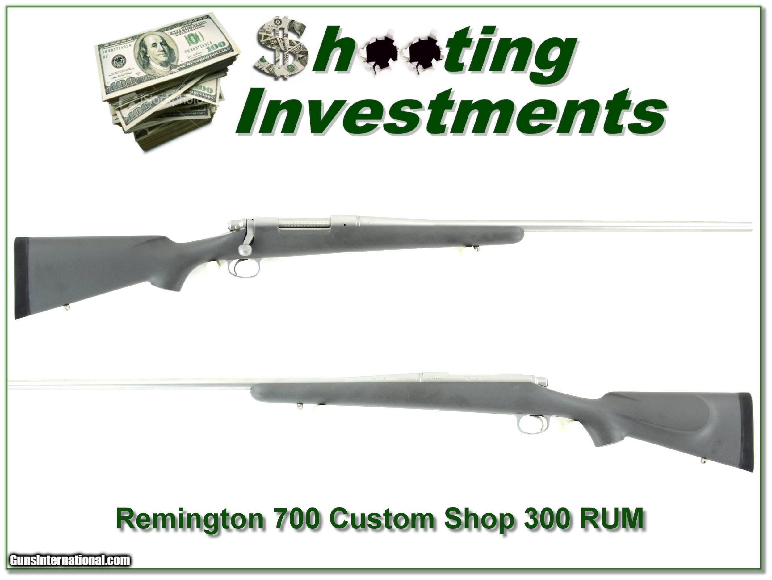 Description: This is a near new Remington Custom Shop 700 in the flat shooting 300 RUM! It is stainless with a 26in barrel. It is an early 300 RUM made in 2001 (pre-lock). From the bolt face and jeweling, if fired since leaving the factory I’m sure only a few rounds. These Custom Shop 700’s are known for superior accuracy. This one will make a high-end all-weather big game gun. Shipping and insurance is $39. Please email me with any questions or larger pictures. (Consign your quality firearms with Shooting Investments for only 12%! Let me know if you have any you would like to sell!) 20-0748 Payment: Payment is by Money Order, Cashier’s Check or Personal Check. I can now also accept Credit Cards (MasterCard, Visa, Discover & American Express) with a 3% convenience fee. Shipping: The shipping charge will be listed in each description. It is $39 for most firearms. Some heavy guns or those insured for over $2000 will be higher. Shipments to Alaska and Hawaii are higher because air shipment is required. Most firearms are shipped on Tuesday and Thursday and usually in 5 days of receipt of payment. We package all shipments carefully and insure them. Optics are shipped Priority Mail and most other non-firearm shipments are shipped First Class. Returns: Our return policy is simple. If for any reason you are not pleased with your purchase, you may return your item for a full refund of purchase price. Ammunition cannot be returned. It is important to us that you are happy. Guns cannot be fired or dissembled before returning them and they must be returned in the same condition as received. Notification of a return must occur within 3 days of receipt at your dealer. Shipping, convenience and dealer fees are not refundable and are the responsibility of the buyer. Lay-a-way: If needed, we offer a 60 day lay-a-way option on most firearms. It is 1/3 now, 1/3 in 30 days and 1/3 in 60 days. Lay-a-way firearm sales are final and cannot be returned. If a lay-a-way is not completed the first payment cannot be refunded. Consigning your firearms with Shooting Investments: We will help you get top dollar for your firearms. While most local guns shops charge 20% or more, our fee is only 12% with a minimum of $75. At your local gun shop it might take months to sell. Selling on-line provides instant access to thousands of interested buyers. You won’t find any other on-line dealer willing to sell your firearms for only 12% or listing every gun on 3 separate s. Selling through an House typically costs the seller 15% and the buyer an addition 15% (so 30%) and you have to wait several months to sell and longer to receive funds. If properly priced, we will sell your firearms within a few weeks. Send us an email or give us a call and we’ll explain how easy it is for you to get top dollar. Trading: Trading for us is really just buying your gun to re-sell. If you have a gun you want to trade, please email a picture and we will let you know what we can give for it. You will always get more if we sell it for you on consignment. Help for California Buyers: We are happy to ship to California. It is the buyer’s responsibility to make sure any item you buy is legal in your state. We are also happy to help with your purchase of a firearm from someone other than us. If you see a gun you would like to buy but the seller can’t or won’t ship to California they can ship to use and we’ll then ship it to your California dealer. The cost for this service is only $30 + shipping. Let us know if we can help! SOLD |