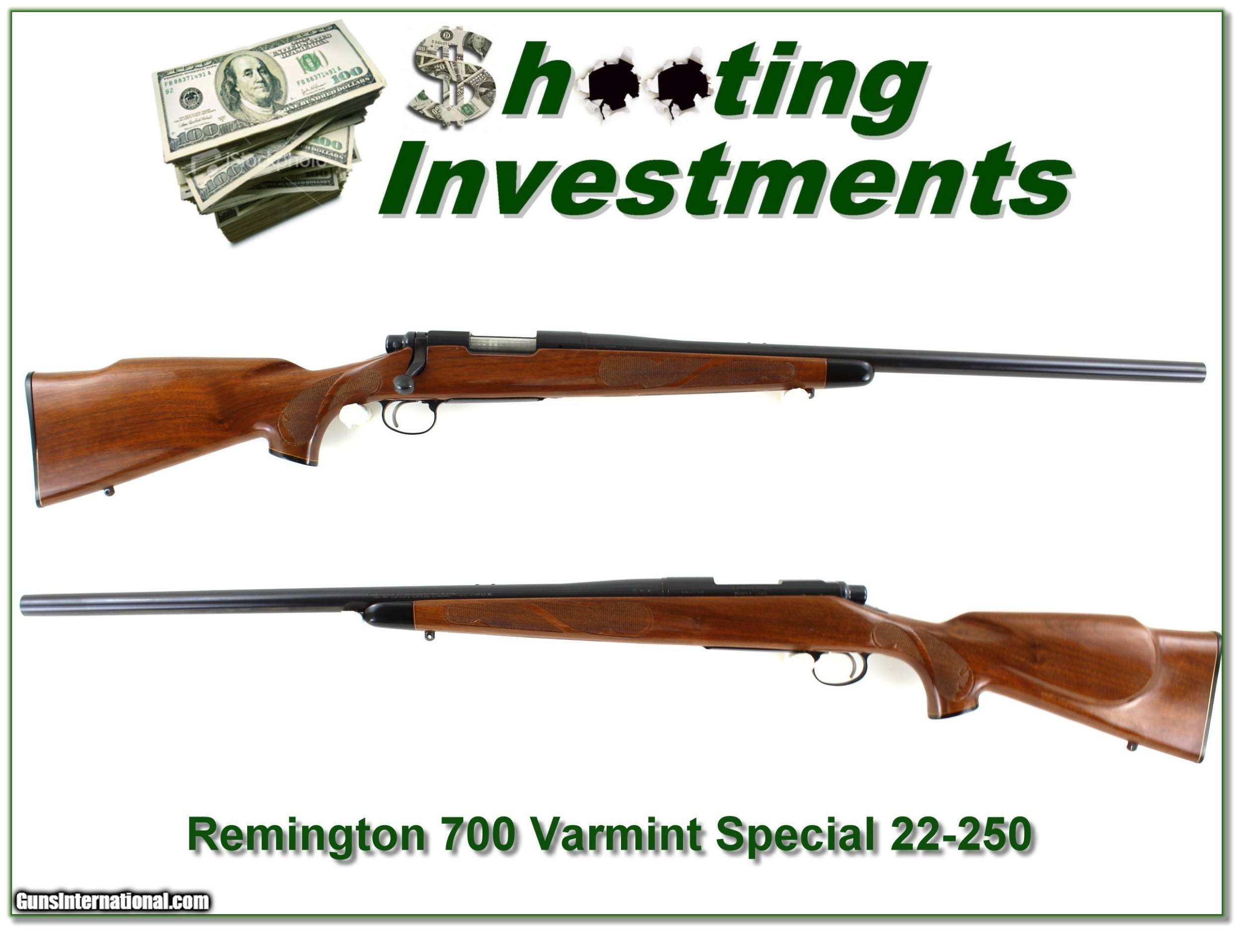 Description: This is an early Remington 700 Varmint Special in 22-250 Remington in excellent condition. It has the earlier Pressed checkering. The blue has no marks or signs of wear. The heavy barrel is 24in. The wood has just a few minor marks. It will make a classic varmint Remington. They just don’t make them like they used too! I am selling this one on consignment and as such lay-a-way can’t be used. It does of course have the standard 3-day inspection. Shipping and insurance is $39. Please email me with any questions or larger pictures. (Consign your quality firearms with Shooting Investments for only 12%! Let me know if you have any you would like to sell!) 20-0182 Payment: Payment is by Money Order, Cashiers Check or Personal Check. I can now also accept Credit Cards (MasterCard, Visa, Discover & American Express) with a 3% convenience fee. PayPal can be used for some items but never for firearms. Shipping: The shipping charge will be listed in each description. It is $39 for most firearms. Some heavy guns or those insured for over $2000 will be higher. Shipments to Alaska and Hawaii are higher because air shipment is required. Most firearms are shipped on Tuesday and Thursday and usually in 5 days of receipt of payment. We package all shipments carefully and insure them. Optics are shipped Priority Mail and most other non-firearm shipments are shipped First Class. Returns: Our return policy is simple. If for any reason you are not pleased with your purchase, you may return your item for a full refund of purchase price. Ammunition cannot be returned. It is important to us that you are happy. Guns cannot be fired or dissembled before returning them and they must be returned in the same condition as received. Notification of a return must occur with-in 3 days of receipt at your dealer. Shipping, convenience and dealer fees are not refundable and are the responsibility of the buyer. Lay-a-way: If needed, we offer a 60 day lay-a-way option on most firearms. It is 1/3 now, 1/3 in 30 days and 1/3 in 60 days. Lay-a-way firearm sales are final and if not completed the first payment cannot be returned. Consigning your firearms with Shooting Investments: We will help you get top dollar for your firearms. While most local guns shops charge 20% or more, our fee is only 12% with a minimum of $75. At your local gun shop it might take months to sell. Selling on-line provides instant access to thousands of interested buyers. You won’t find any other on-line dealer willing to sell your firearms for only 12% or listing every gun on 3 separate s. Selling through an House typically costs the seller 15% and the buyer an addition 15% (so 30%) and you have to wait several months to sell and longer to receive funds. If properly priced, we will sell your firearms in a few weeks. Send us an email or give us a call and we’ll explain how easy it is for you to get top dollar. Trading: Trading for use is really just buying your gun to re-sell. If you have a gun you want to trade, please email a picture and we will let you know what we can give or it. You will always get more if we sell it for you on consignment. Help for California Buyers: We are happy to ship to California. It is the buyer’s responsibility to make sure any item you buy is legal in your state. We are also happy to help with your purchase of a firearm from someone other than us. If you see a gun you would like to buy but the seller can’t or won’t ship to California they can ship to use and we’ll then ship it to your California dealer. The cost for this service is only $30 + shipping. Let us know if we can help! SOLD |