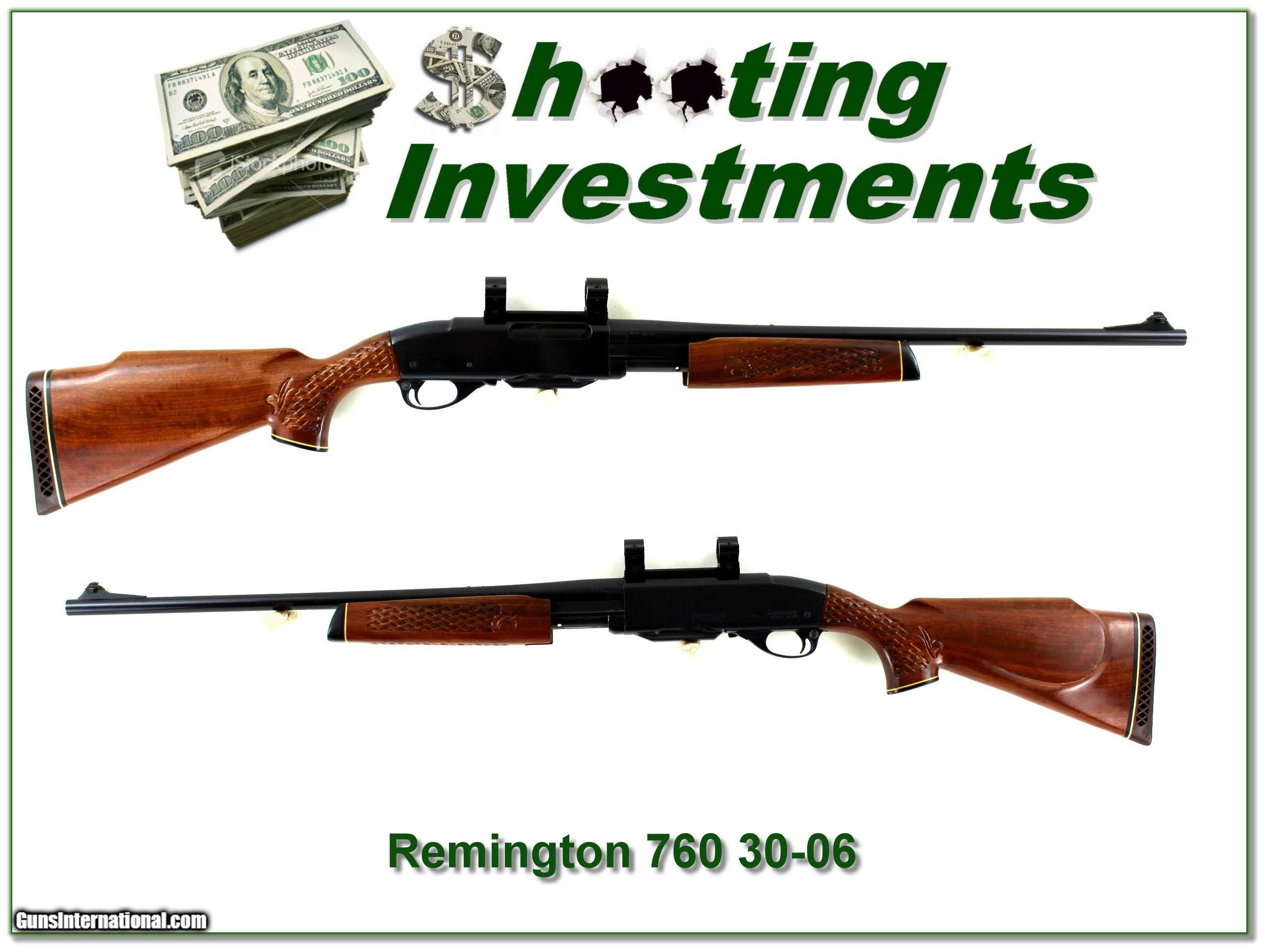 Description: This is a 1997 made Remington 760 Deluxe 30-06. It has basketweave checkering. It is in very good condition with only a few marks. The blue shows little use and I don’t think many rounds fired. It comes with bases and rings as seen. It will make a classic hunting gun. Shipping and insurance is $39. Please email me with any questions or larger pictures. (Consign your quality firearms with Shooting Investments for only 12%! Let me know if you have any you would like to sell!) 23-0790 Payment: Payment is by Money Order, Cashier’s Check or Personal Check. I can now also accept Credit Cards (MasterCard, Visa, Discover & American Express) with a 3% convenience fee. Shipping: The shipping charge will be listed in each description. It is $49 for most firearms. Some heavy guns or those insured for over $2000 will be higher. Shipments to Alaska and Hawaii are higher because air shipment is required. Most firearms are shipped on Tuesday and Thursday and usually in 5 days of receipt of payment. We package all shipments carefully and insure them. Optics are shipped Priority Mail and most other non-firearm shipments are shipped First Class. Returns: Our return policy is simple. If for any reason you are not pleased with your purchase, you may return your item for a full refund of purchase price. Ammunition cannot be returned. It is important to us that you are happy. Guns cannot be fired or dissembled before returning them and they must be returned in the same condition as received. Notification of a return must occur within 3 days of receipt at your dealer. Shipping, convenience and dealer fees are not refundable and are the responsibility of the buyer. Lay-a-way: If needed, we offer a 60 day lay-a-way option on most firearms. It is 1/3 now, 1/3 in 30 days and 1/3 in 60 days. Lay-a-way firearm sales are final and cannot be returned. If a lay-a-way is not completed the first payment cannot be refunded. Consigning your firearms with Shooting Investments: We will help you get top dollar for your firearms. While most local guns shops charge 20% or more, our fee is only 12% with a minimum of $75. At your local gun shop it might take months to sell. Selling on-line provides instant access to thousands of interested buyers. You won’t find any other on-line dealer willing to sell your firearms for only 12% or listing every gun on 3 separate s. Selling through an House typically costs the seller 15% and the buyer an addition 15% (so 30%) and you have to wait several months to sell and longer to receive funds. If properly priced, we will sell your firearms within a few weeks. Send us an email or give us a call and we’ll explain how easy it is for you to get top dollar. Trading: Trading for us is really just buying your gun to re-sell. If you have a gun you want to trade, please email a picture and we will let you know what we can give for it. You will always get more if we sell it for you on consignment. SOLD |