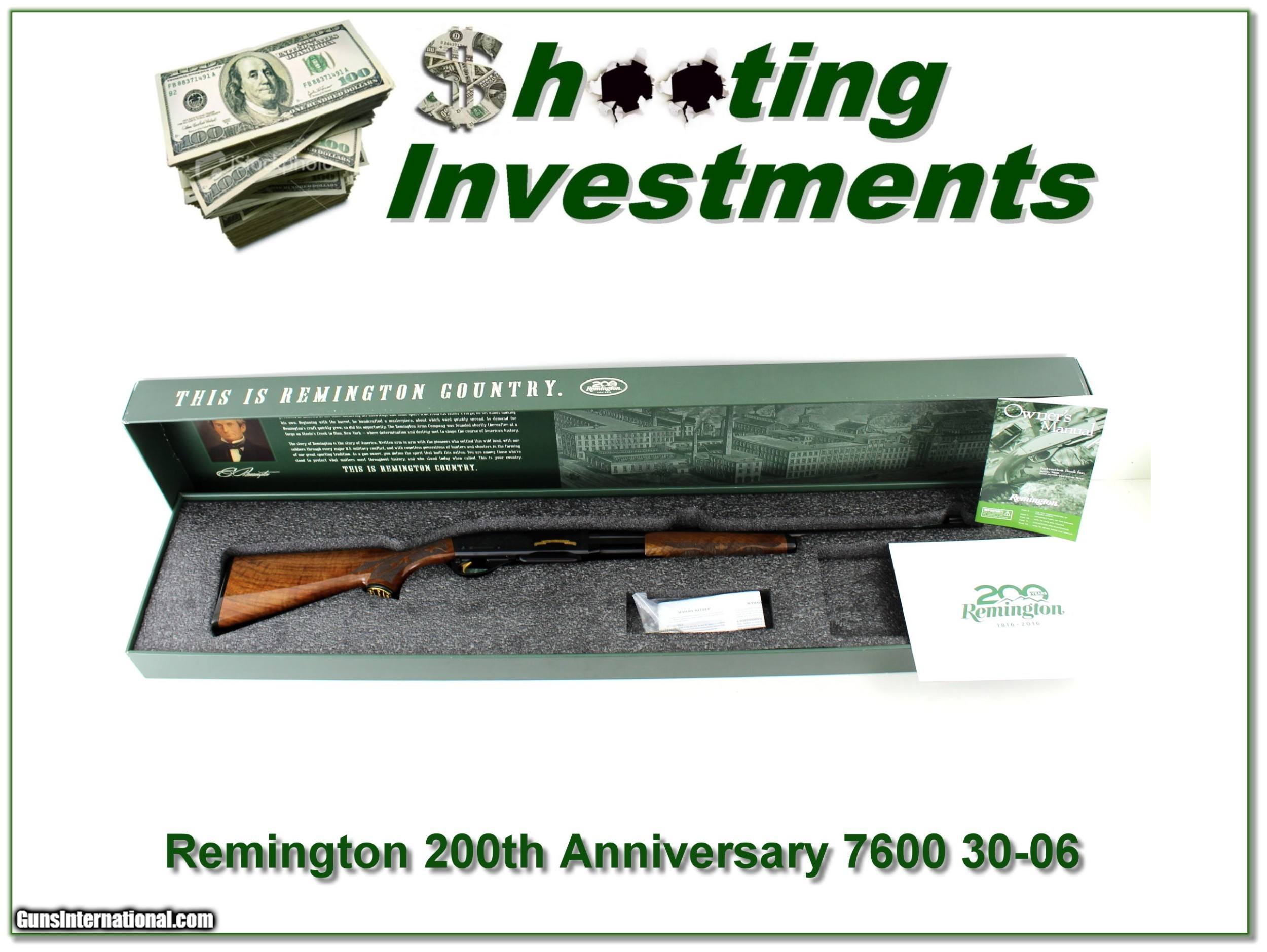 Description: This is a beautiful Remington 7600 High Grade 200th Anniversary 30-06. It comes as seen new, unfired in original box with papers. I am selling this one on consignment and as such lay-a-way can’t be used. It does of course have the standard 3-day inspection. Shipping with insurance is $49. Please email me with any questions or larger pictures. (Consign your quality firearms with Shooting Investments for only 12%! Let me know if you have any you would like to sell!) 19-1300 Payment: Payment is by Money Order, Cashiers Check or Personal Check. I can now also accept Credit Cards (MasterCard, Visa, Discover & American Express) with a 3% convenience fee. PayPal can be used for some items but never for firearms. Shipping: The shipping charge will be listed in each description. It is $39 for most firearms. Some heavy guns or those insured for over $2000 will be higher. Shipments to Alaska and Hawaii are higher because air shipment is required. Most firearms are shipped on Tuesday and Thursday and usually in 5 days of receipt of payment. We package all shipments carefully and insure them. Optics are shipped Priority Mail and most other non-firearm shipments are shipped First Class. Returns: Our return policy is simple. If for any reason you are not pleased with your purchase, you may return your item for a full refund of purchase price. Ammunition cannot be returned. It is important to us that you are happy. Guns cannot be fired or dissembled before returning them and they must be returned in the same condition as received. Notification of a return must occur with-in 3 days of receipt at your dealer. Shipping, convenience and dealer fees are not refundable and are the responsibility of the buyer. Lay-a-way: If needed, we offer a 60 day lay-a-way option on most firearms. It is 1/3 now, 1/3 in 30 days and 1/3 in 60 days. Lay-a-way firearm sales are final and if not completed the first payment cannot be returned. Consigning your firearms with Shooting Investments: We will help you get top dollar for your firearms. While most local guns shops charge 20% or more, our fee is only 12% with a minimum of $75. At your local gun shop it might take months to sell. Selling on-line provides instant access to thousands of interested buyers. You won’t find any other on-line dealer willing to sell your firearms for only 12% or listing every gun on 3 separate s. Selling through an House typically costs the seller 15% and the buyer an addition 15% (so 30%) and you have to wait several months to sell and longer to receive funds. If properly priced, we will sell your firearms in a few weeks. Send us an email or give us a call and we’ll explain how easy it is for you to get top dollar. Trading: Trading for use is really just buying your gun to re-sell. If you have a gun you want to trade, please email a picture and we will let you know what we can give or it. You will always get more if we sell it for you on consignment. Help for California Buyers: We are happy to ship to California. It is the buyer’s responsibility to make sure any item you buy is legal in your state. We are also happy to help with your purchase of a firearm from someone other than us. If you see a gun you would like to buy but the seller can’t or won’t ship to California they can ship to use and we’ll then ship it to your California dealer. The cost for this service is only $30 + shipping. Let us know if we can help! SOLD |