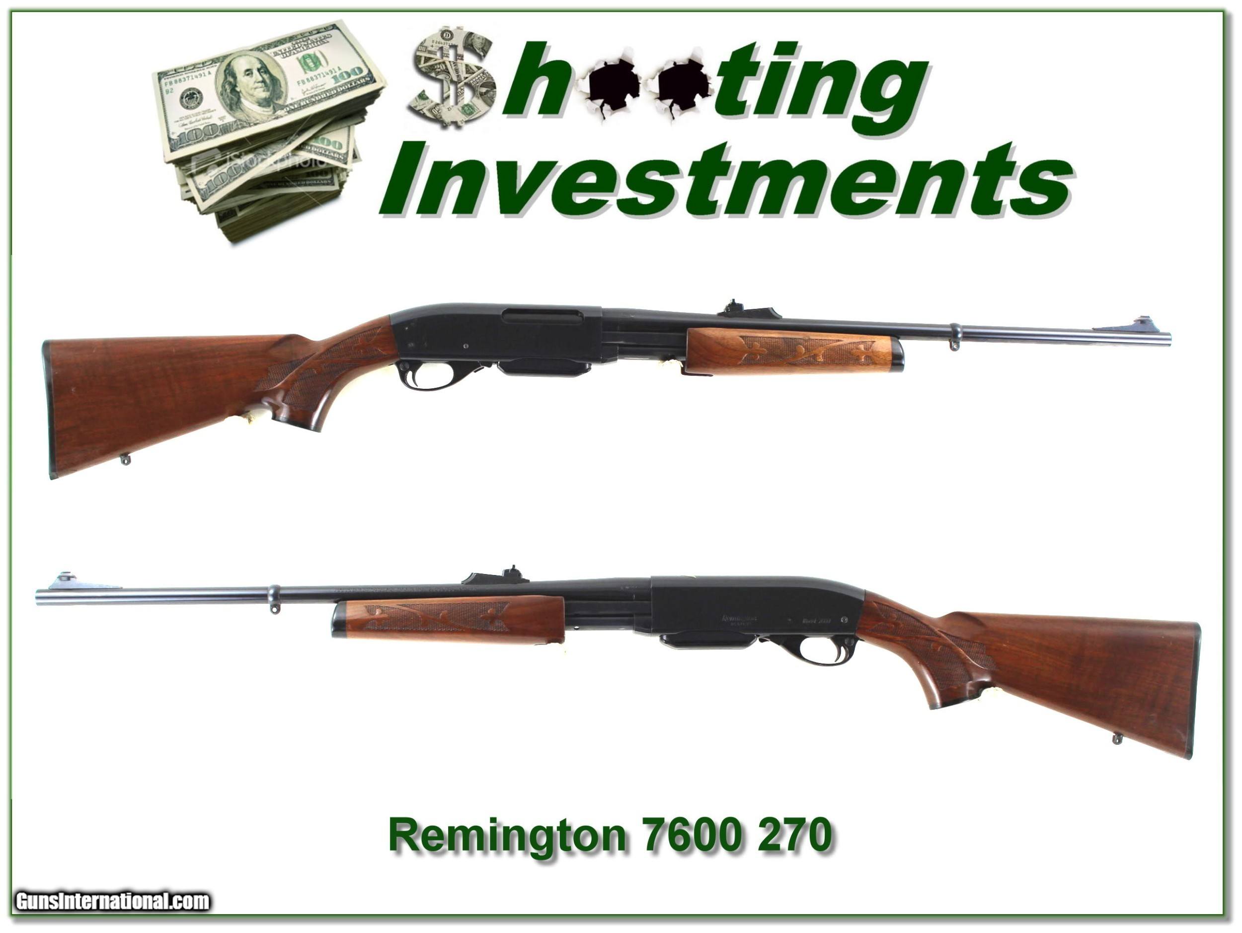 Description: This is a 1989 made Remington 7600 in 270 Winchester. It is in very good condition with only a few minor marks here and there. It will make a classic Remington hunting gun and there will be no more of these! That makes it a real Shooting Investment. Shipping and insurance is $49. Please email me with any questions or larger pictures. (Consign your quality firearms with Shooting Investments for only 12%! Let me know if you have any you would like to sell!) 22-0502 Payment: Payment is by Money Order, Cashiers Check or Personal Check. I can now also accept Credit Cards (MasterCard, Visa, Discover & American Express) with a 3% convenience fee. Shipping: The shipping charge will be listed in each description. It is $49 for most long guns. Some heavy guns, over 48in boxes or those insured for over $2000 will be higher. Shipments to Alaska and Hawaii are higher because air shipment is required. Most firearms are shipped on Tuesday and Thursday and usually in 5 days of receipt of payment. We package all shipments carefully and insure them. Optics are shipped Priority Mail and most other non-firearm shipments are shipped First Class. Returns: Our return policy is simple. If for any reason you are not pleased with your purchase, you may return your item for a full refund of purchase price. Ammunition cannot be returned. It is important to us that you are happy. Guns cannot be fired or dissembled before returning them and they must be returned in the same condition as received. Notification of a return must occur with-in 3 days of receipt at your dealer. Shipping, convenience and dealer fees are not refundable and are the responsibility of the buyer. Lay-a-way: If needed, we offer a 60 day lay-a-way option on most firearms. It is 1/3 now, 1/3 in 30 days and 1/3 in 60 days. Lay-a-way firearm sales are final and if not completed the first payment cannot be returned. Consigning your firearms with Shooting Investments: We will help you get top dollar for your firearms. While most local guns shops charge 20% or more, our fee is only 12% with a minimum of $75. At your local gun shop it might take months to sell. Selling on-line provides instant access to thousands of interested buyers. You won’t find any other on-line dealer willing to sell your firearms for only 12% or listing every gun on 3 separate s. Selling through an House typically costs the seller 15% and the buyer an addition 15% (so 30%) and you have to wait several months to sell and longer to receive funds. If properly priced, we will sell your firearms in a few weeks. Send us an email or give us a call and we’ll explain how easy it is for you to get top dollar. Trading: Trading for use is really just buying your gun to re-sell. If you have a gun you want to trade, please email a picture and we will let you know what we can give or it. You will always get more if we sell it for you on consignment. Help for California Buyers: We are happy to ship to California. It is the buyer’s responsibility to make sure any item you buy is legal in your state. We are also happy to help with your purchase of a firearm from someone other than us. If you see a gun you would like to buy but the seller can’t or won’t ship to California they can ship to use and we’ll then ship it to your California dealer. The cost for this service is only $30 + shipping. Let us know if we can help! SOLD |