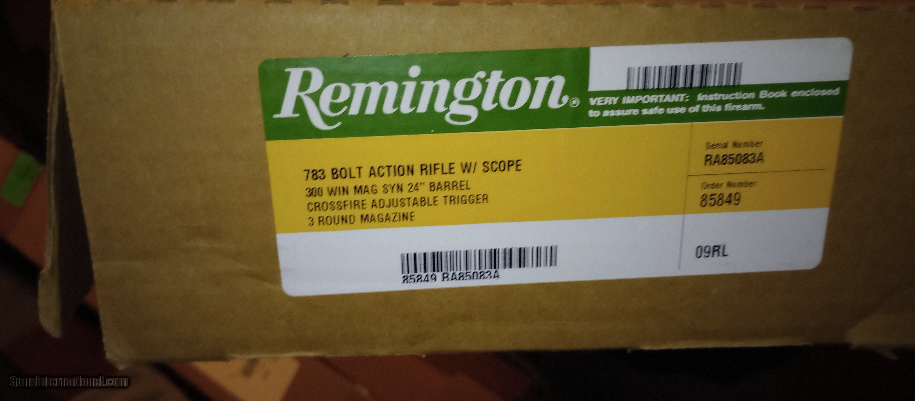 Description: Remington 783 Bolt Action Barrel Length - 24 Inches Calibre/Caliber - .300 Winchester Magnum Black Synthetic stock Adjustable CrossFire™ trigger system Scope Included New / Never Fired SOLD Rifle Caliber: .300 Winchester Magnum |