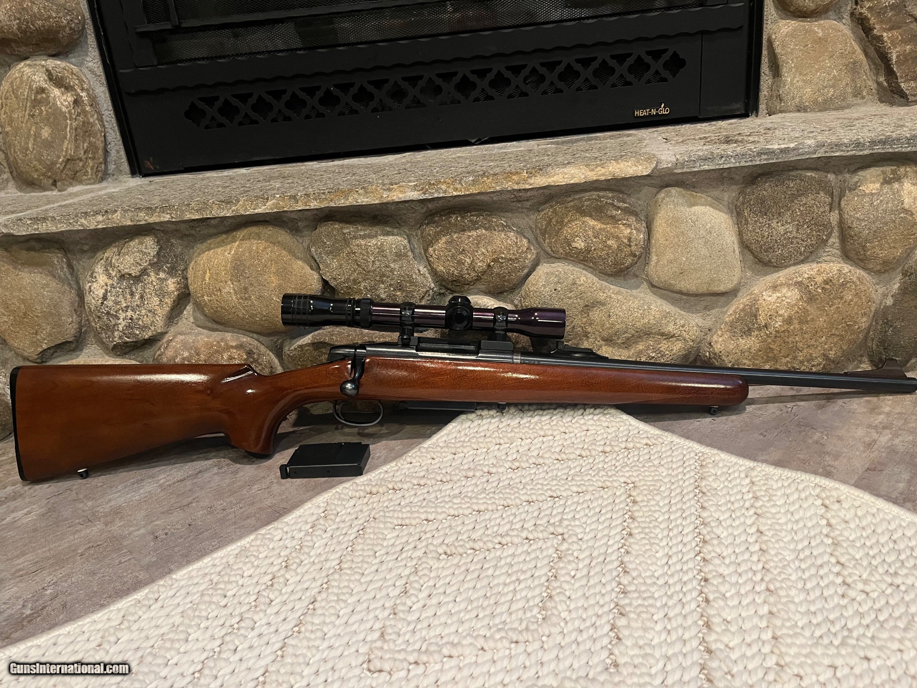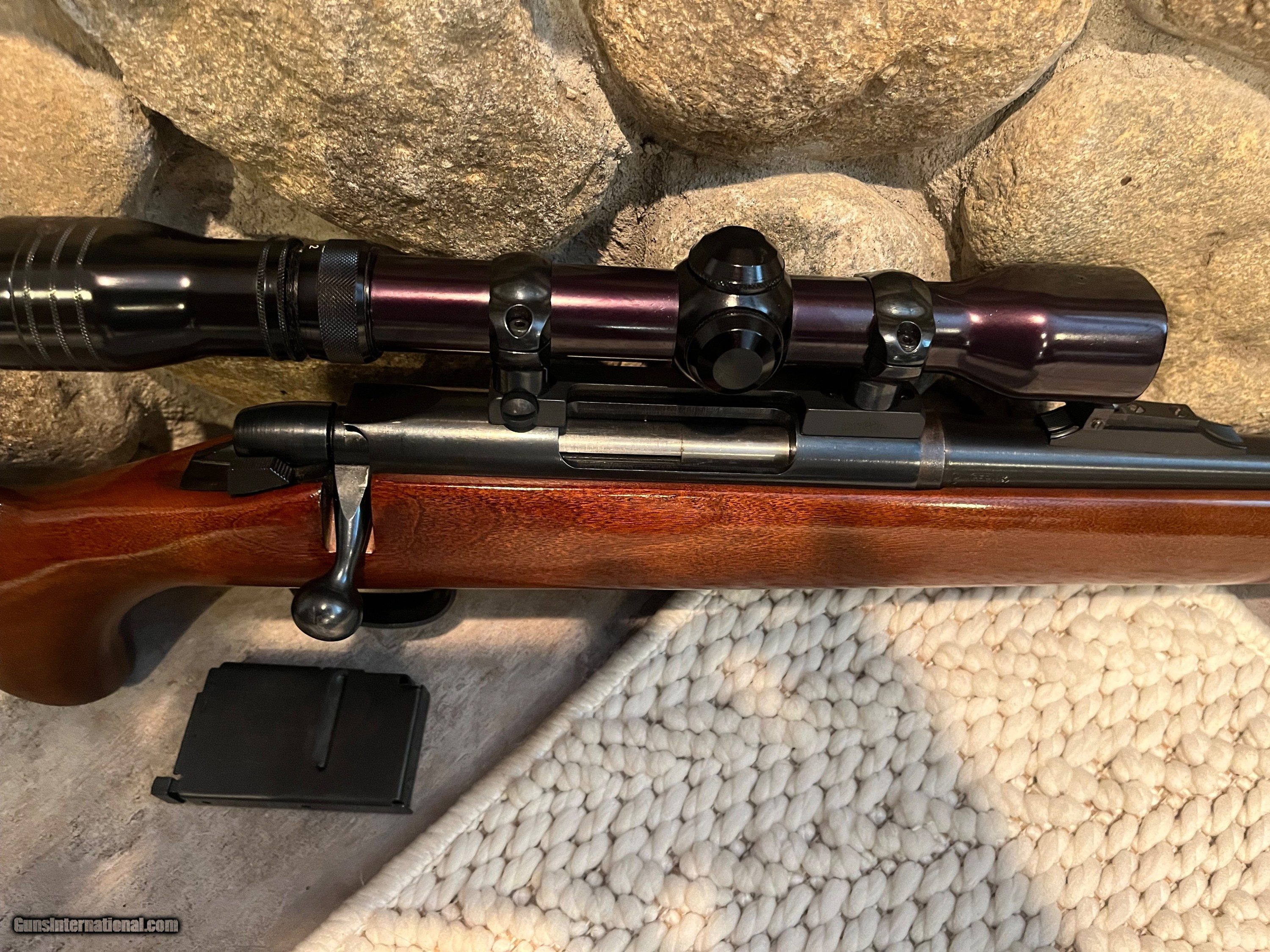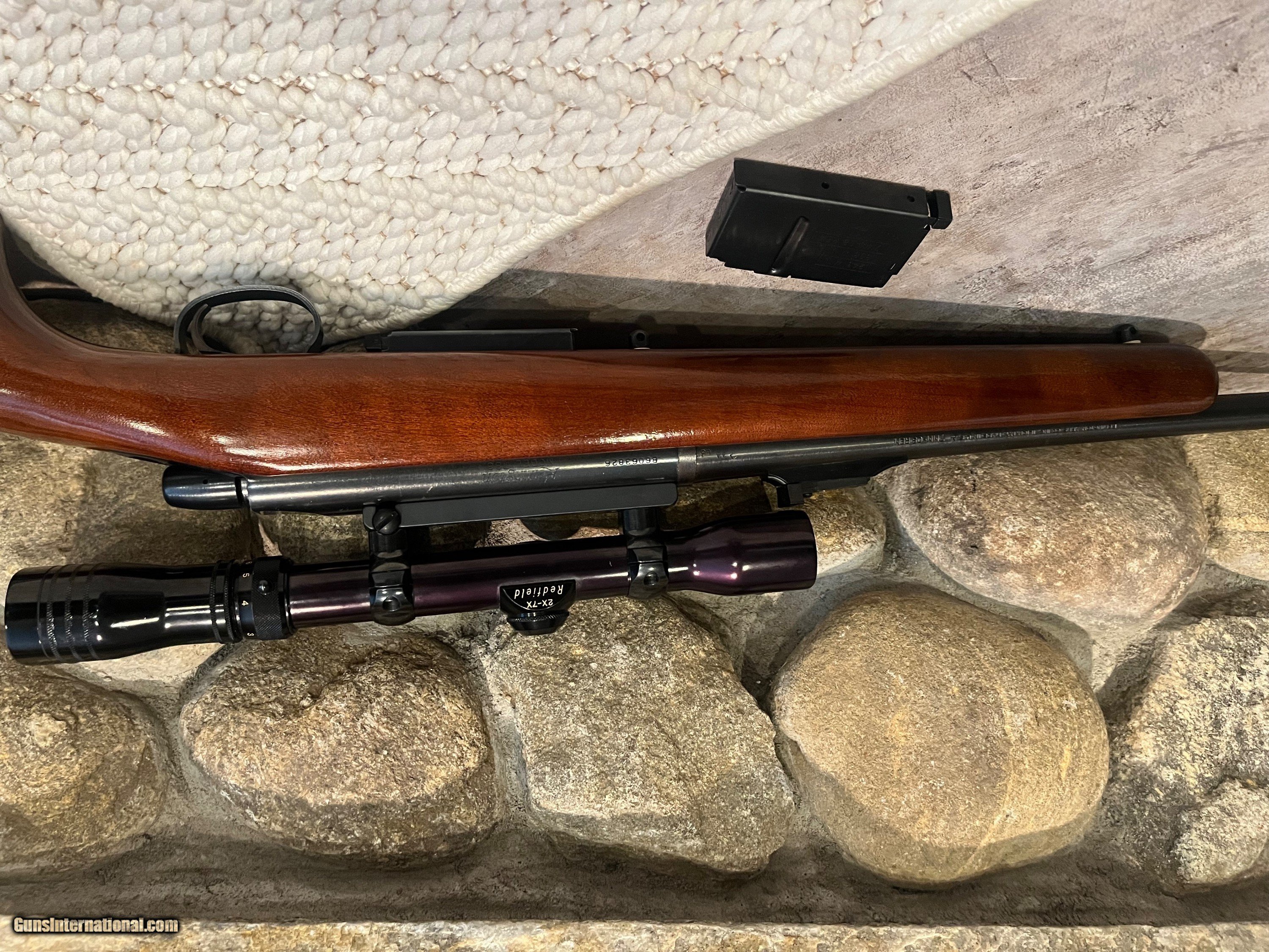Description: Remington model 788 chambered in 7mm-08 with an 18 1/2 inch barrel. This gun is in good condition with some very minor indentations in wood and some light bluing fade as pictured. This is a hard caliber to find as it was only manufactured for one year in 1980. You don't see this caliber come up for sale very often. Included is a vintage Redfield wideview duplex 2X-7X scope and 2 clips. SOLD Rifle Caliber: 7mm-08 Remington Manufacturer: Remington Model: 788 |