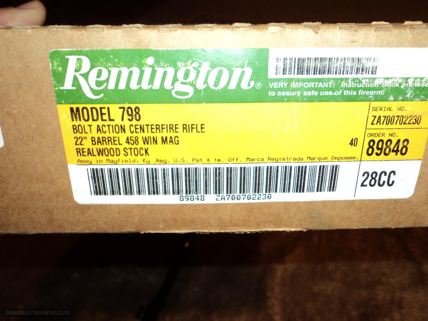 Description: Remington 798 High Grade 458 Win Mag NIB, high grade walnut stock, Mauser action, nice sights, 100% perfect NIB. SOLD |