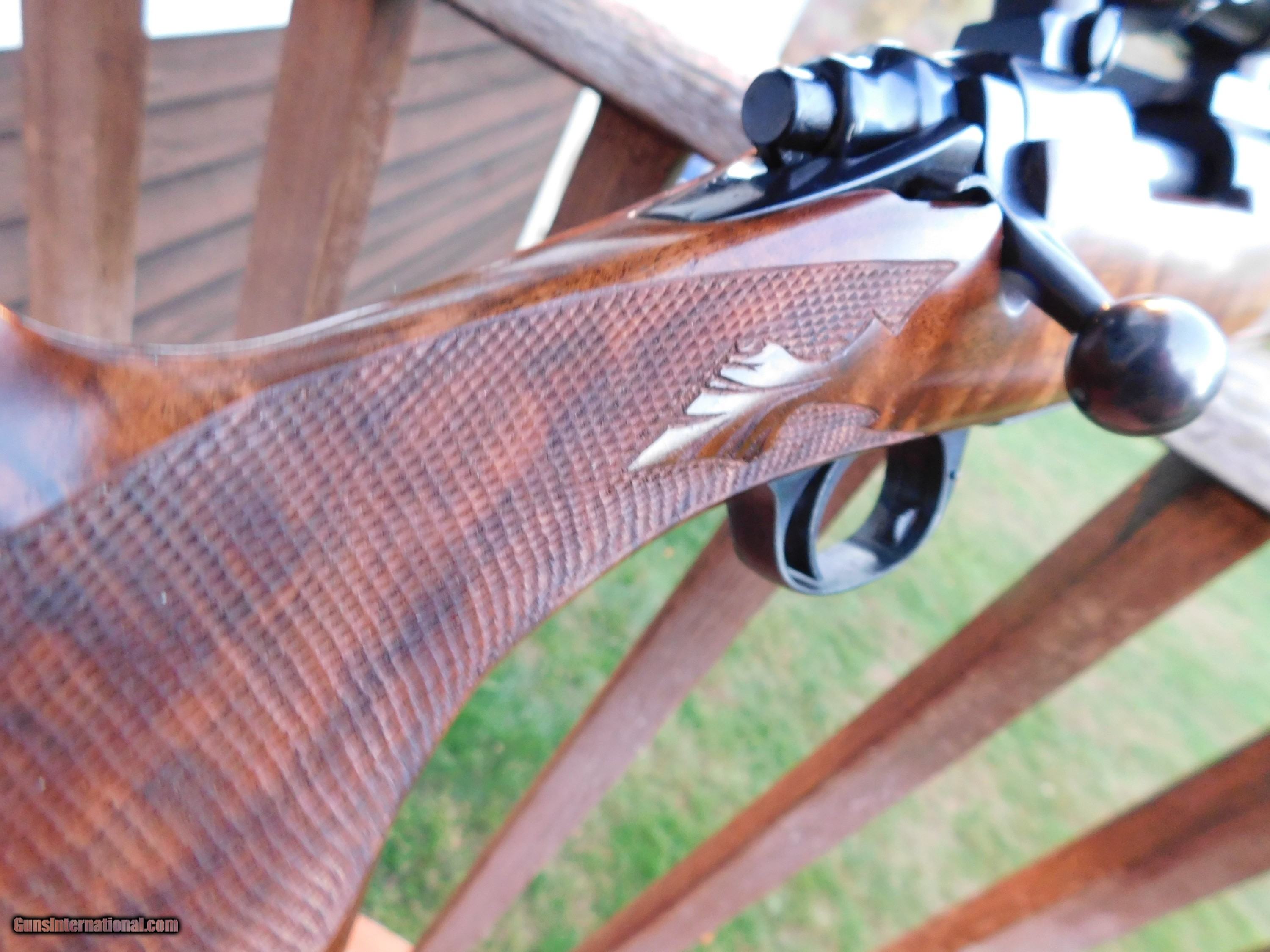 Description: Based on a 722 Action fully custom Stocked ...very fine and elegant checkering with ebony forend ....Hinged Floor Plate, 24" Rem Barrel chambered in 222. Skelatonized pg and butt plate (features found on rifles costing 2 or 3x our pice) on this fine once in a life time rifle. Scope show is NOT included (Leupold Fixed 12x AO....but may be purchased for $ 250.00) Shipping in a hard case insured $ 120.00 IF YOU WOULD LIKE TO BUY THIS OR ANY OF OUR GUNS WE SUGGEST YOU PHONE US AND THEN ALSO FOLLOW UP WITH A TEXT OR EMAIL. IF YOU ARE INTERSTED IN A GUN THAT IS UNDER DEPOSIT AND WOULD LIKE TO BE NOTIFIED IF A SIMILAR GUN COMES IN DROP US A LINE AND WE WILL MAKE EFFORTS TO CONTACT YOU WHEN ONE DOES COME IN. WE HAVE OVER 2000 SALES ON ALL SITES WITH AN A+ RATING ON ALL WE ALSO KEEP AN INVENTORY OF OLDER PERIOD CORRECT SCOPES; CALL WITH NEEDS WE MOSTLY PICK VERY CLEAN AND LIGHLTY USED GUNS. WE ARE HAPPY TO TAKE CONSIGNMENT GUNS AND COLLECTIONS OR WILL BUY YOURS OUTRIGHT. WE SOMETIMES ARE EMPLOYED FOR ESTATE PURPOSES AND VALUATIONS. AT THIS TIME WE ARE ONLY ACCEPTING US POSTAL MONEY ORDERS OR BANK CHECKS FOR PAYMENT YOU MUST PROVIDE US WITH THE RECEIVING FFL'S CONTACT INFO OR THEIR LIC COPY IF YOU HAVE IT LAYAWAY PURCHASES NOT COMPLETED ON ANY RETURNED ITEM UNLESS NOT AS DESCRIBED OR DAMAGED ARE SUBJECT TO A 10% RELISTING/RESTOCKING FEE AND MUST BE RETURNED WITH NO NEW MARKS OR SCRATCHES, SENT BACK INSURED, PRIORITY SIGNATURE REQUIRED. ALL INFORMATION CONTAINED HEREIN IS BELIEVED TO BE ACCURATE BUT IS NOT GUARANTEED. WITH ANY OLDER OR USED GUN IT SHOULD BE INSPECTED BY A GUNSMITH PRIOR TO SHOOTING. SOLD |