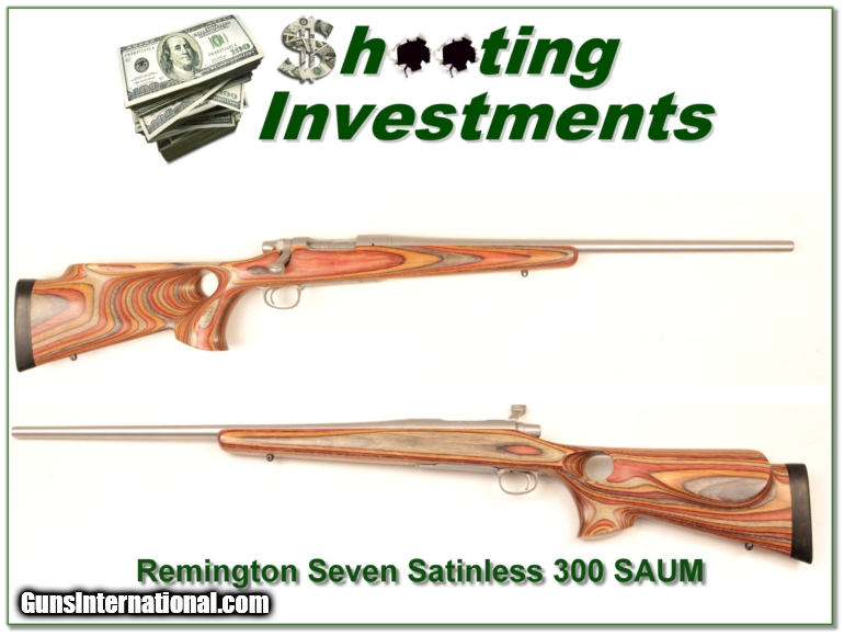 Description: This is a very nice Remington Model Seven in the hard hitting 300 SAUM. This is a light compact stainless rifle with a factory thumbhole laminated stock. It will make a very nice light weigh hunting gun. I am selling this one on consignment and as such lay-a-way can’t be used. It does of course have the standard 3 day inspection. Shipping and insurance is $30 or $18 more if you want it shipped in a new Plano hard case. Please email me with any questions or larger pictures. (I now consign quality firearms only 10%! Let me know if you have any you would like to sell!) [15-0149] Terms & Conditions Payment: Payment is by Money Order, Cashiers Check or Personal Check. I can now also accept MasterCard and Visa with a 3% convenience fee. PayPal can be used for some items but never firearms. Please let us know if you would like to pay via PayPal. Shipping: The shipping charge will be listed in each description. It is $30 for most guns. Some heavy guns or those insured for over $2000 may be higher. Shipments to Alaska and Hawaii are higher because air shipment is required. Most firearms are shipped within 5 days of receipt of payment. We prefer shipping at the beginning of the week to avoid firearms in transit over weekends. We package all shipments carefully and insure them for the full purchase price, rounded up to the next $100. In the unlikely event that damage occurs, it is important that you save all packaging material for the claims process. Optics are shipped Priority Mail and most other non-firearm shipments are shipped First Class. Returns: Our return policy is simple. If for any reason you are not pleased with your purchase, you may return your item for a refund. The only exception is ammunition, it cannot be returned. It is important to us that you are happy. Guns cannot be fired or dissembled before returning them and must be returned in the same condition as received. Notification of a return must occur with-in 3 days of receipt at your dealer. Shipping, convenience and dealer fees are not refundable and are the responsibility of the buyer. Lay-a-way: If needed, we offer a 60 day lay-a-way option on most firearms. It is 1/3 now, 1/3 in 30 days and 1/3 in 60 days. Lay-a-way firearm sales are final. Consigning your firearms with Shooting Investments: We will help you get top dollar for your firearms. While most local guns shops charge 20% or more, our fee is only 10% with a minimum of $50. At your local gun shop it might take months to sell. Selling on-line provides instant access to thousands of interested buyers. You won’t find any other on-line dealer willing to sell your firearms for only 10% or listing every gun on 4 separate s. Selling through an House typically costs 15% and you have to wait several months to sell and longer to receive funds. If properly priced, we will sell your firearms in a week or two. Send us an email or give us a call and we’ll explain how easy it is for you to get top dollar. Trading: We collect guns and usually just trade for guns we want to add to our collections. We often sell guns for others wanting to purchase one of ours. We find this the most fair to both of us. Our Commission is only 10% and we hold the gun you want until yours sells. Please contact us if you want to sell one of yours to buy one of ours. Help for California Buyers: We are happy to ship to California. It is the buyer’s responsibility to make sure any item you buy is legal in your state. We are also happy to help with your purchase of a firearm from someone other than us. If you see a gun you would like to buy but the seller can’t or won’t ship to California we can help. You buy the gun and have it shipped to us. We’ll then ship it to your California dealer. The cost for this service is only $30 + shipping. Let me know if we can help! SOLD |