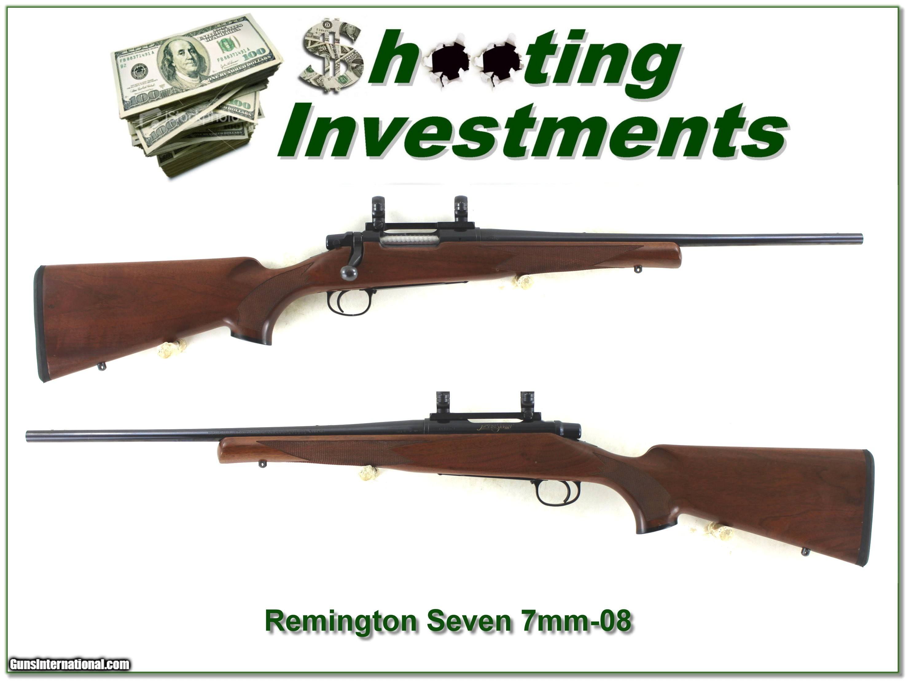 Description: Collectors and hunters, this is a 1984 made Remington Model Seven in 7mm-08 Remington. It is in excellent condition with a 19in barrel and Leupold bases and rings as seen. From the jeweling on the bolt I’m sure only a few rounds fired. The wood has nice grain with just a few minor marks. I am selling this one on consignment and as such lay-a-way can’t be used. It does of course have the standard 3-day inspection. Shipping and insurance is $49. Please email me with any questions or larger pictures. (Consign your quality firearms with Shooting Investments for only 12%! Let me know if you have any you would like to sell!) 25-0379 Payment: Payment is by Money Order, Cashier’s Check or Personal Check. I can now also accept Credit Cards (MasterCard, Visa, Discover & American Express) with a 3% convenience fee. Shipping: The shipping charge will be listed in each description. It is $49 for most firearms. Some heavy guns or those insured for over $2000 will be higher. Shipments to Alaska and Hawaii are higher because air shipment is required. Most firearms are shipped on Tuesday and Thursday and usually in 5 days of receipt of payment. We package all shipments carefully and insure them. Optics are shipped Priority Mail and most other non-firearm shipments are shipped First Class. Returns: Our return policy is simple. If for any reason you are not pleased with your purchase, you may return your item for a full refund of purchase price. Ammunition cannot be returned. It is important to us that you are happy. Guns cannot be fired or dissembled before returning them and they must be returned in the same condition as received. Notification of a return must occur within 3 days of receipt at your dealer. Shipping, convenience and dealer fees are not refundable and are the responsibility of the buyer. Lay-a-way: If needed, we offer a 60 day lay-a-way option on most firearms. It is 1/3 now, 1/3 in 30 days and 1/3 in 60 days. Lay-a-way firearm sales are final and cannot be returned. If a lay-a-way is not completed the first payment cannot be refunded. Consigning your firearms with Shooting Investments: We will help you get top dollar for your firearms. While most local guns shops charge 20% or more, our fee is only 12% with a minimum of $100. At your local gun shop it might take months to sell. Selling on-line provides instant access to thousands of interested buyers. You won’t find any other on-line dealer willing to sell your firearms for only 12% or listing every gun on 3 separate s. Selling through an House typically costs the seller 15% and the buyer an addition 15% (so 30%) and you have to wait several months to sell and longer to receive funds. If properly priced, we will sell your firearms within a few weeks. Send us an email or give us a call and we’ll explain how easy it is for you to get top dollar. Trading: Trading for us is really just buying your gun to re-sell. If you have a gun you want to trade, please email a picture and we will let you know what we can give for it. You will always get more if we sell it for you on consignment. SOLD |