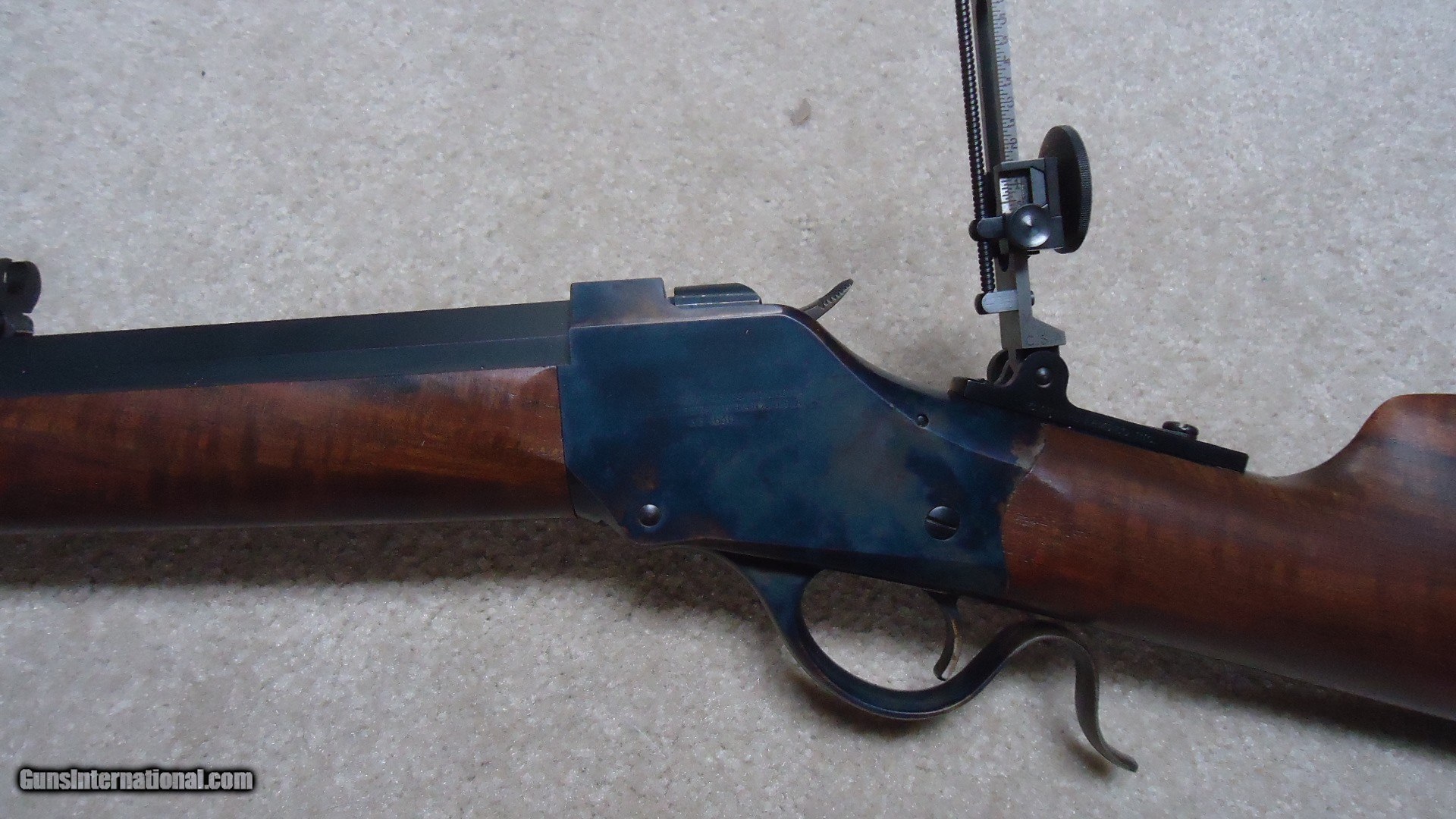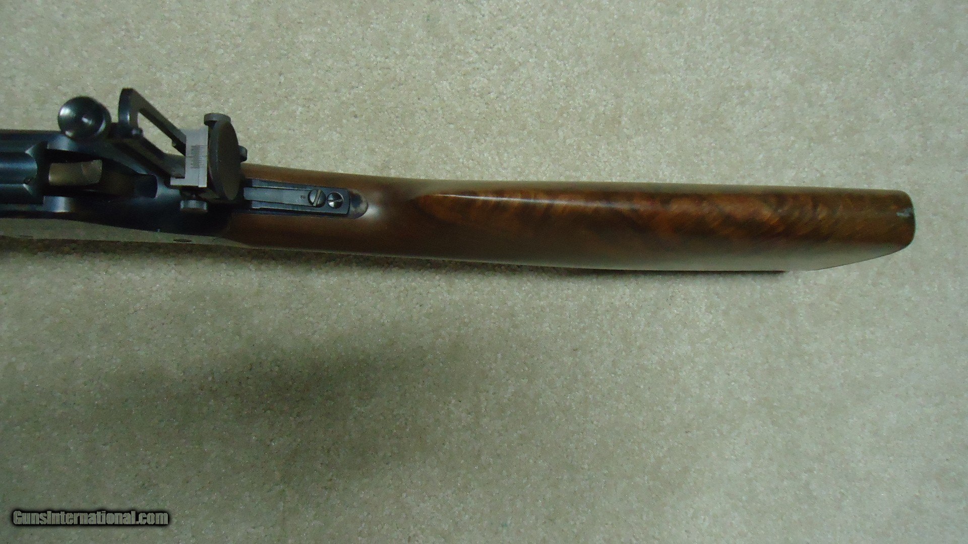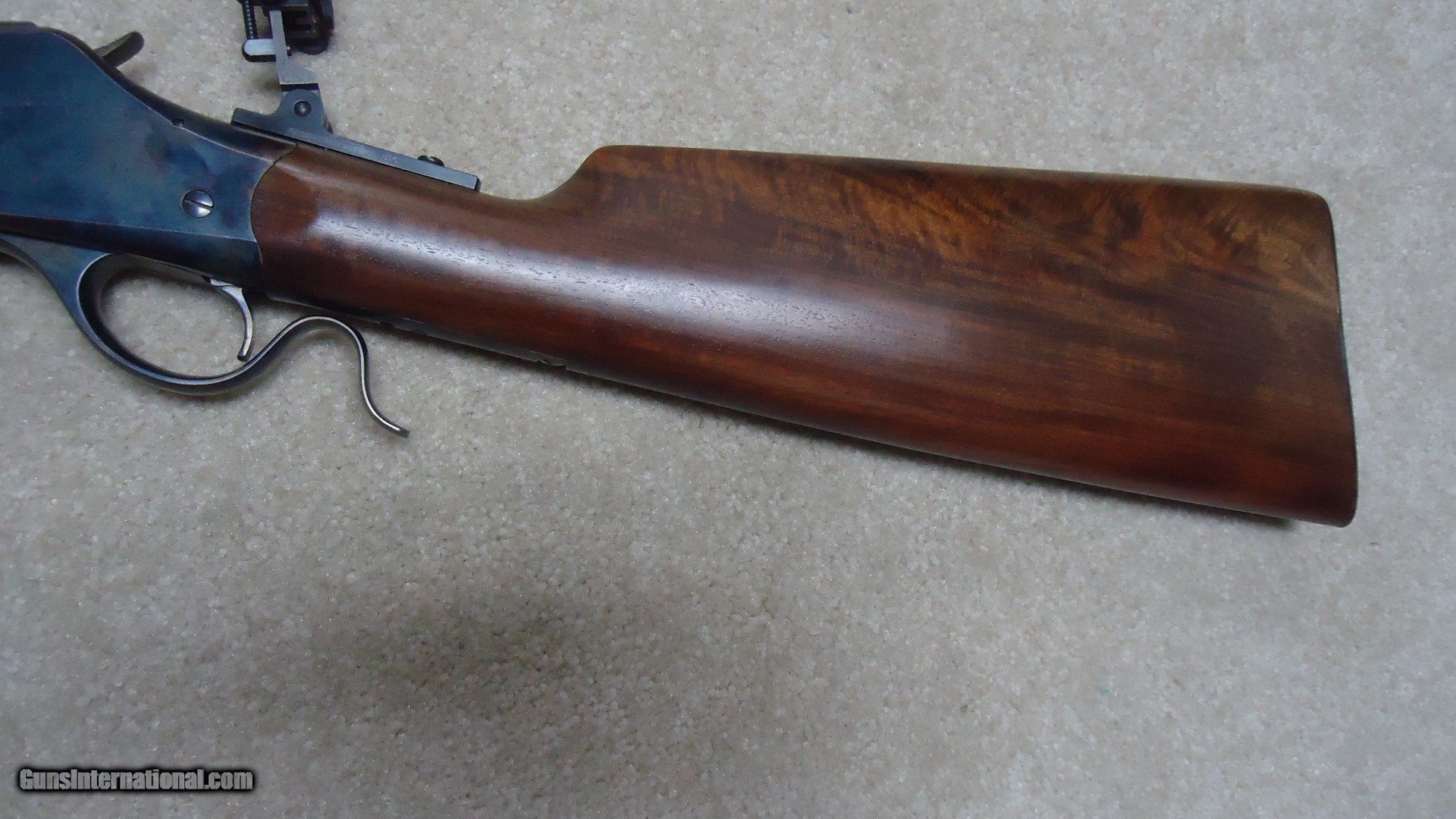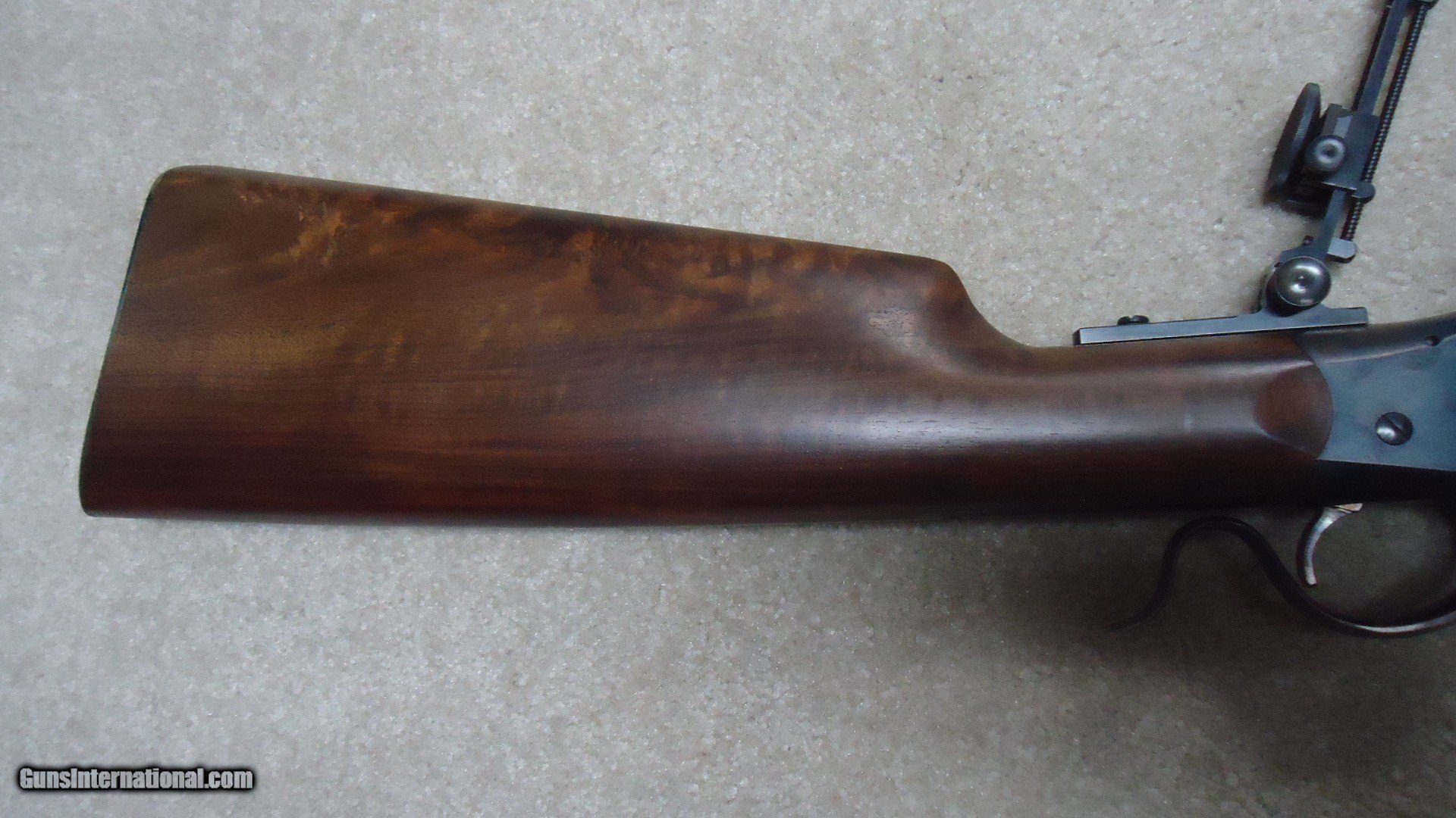 Description: CUSTOM C. SHARPS MADE IN BIG TIMBER, MONTANA, 1885 HIGHWALL SINGLE SHOT IN .30-40 KRAG CALIBER. These are beautifully made rifles on the Winchester pattern thick side Highwall action that is known for its fast lock time and strength. This one has a 28" #3 weight half-octagon barrel (medium weight and standard in antique Winchester Highwall rifles in this caliber). The barrel is fitted with a full buckhorn folding ladder rear sight with elevation slide paired with a globe front sight that will take inserts (a post insert in in the globe now). It is also fitted with a C. Sharps marked mid-range fully adjustable for windage and elevation vernier tang sight. The semi-fancy walnut stock and forend show some nice grain and are a n attractive deep brown color. The butt is fitted with a case colored checkered steel shotgun butt plate. The receiver is case colored and the trigger pull is light and crisp. Overall, this rifle appears about new and unfired. These are always back ordered with a long delivery wait time. This one is also in a great, traditional caliber that was quite popular in Winchester Highwalls in the late 1890s to early 1900s. A super hunting or target rifle. Weighs approx. 10 1/2 lbs. SOLD Rifle Caliber: .30-40 Krag Manufacturer: C. SHARPS Model: 1885 HIGH WALL Serial Number: 85-6XX Barrel Length: 28" HALF OCT. Condition: LIKE NEW |