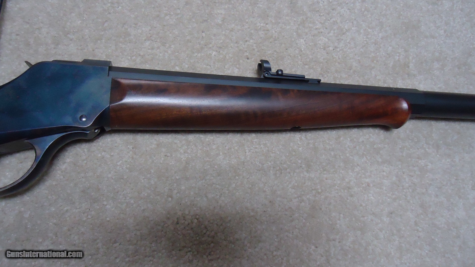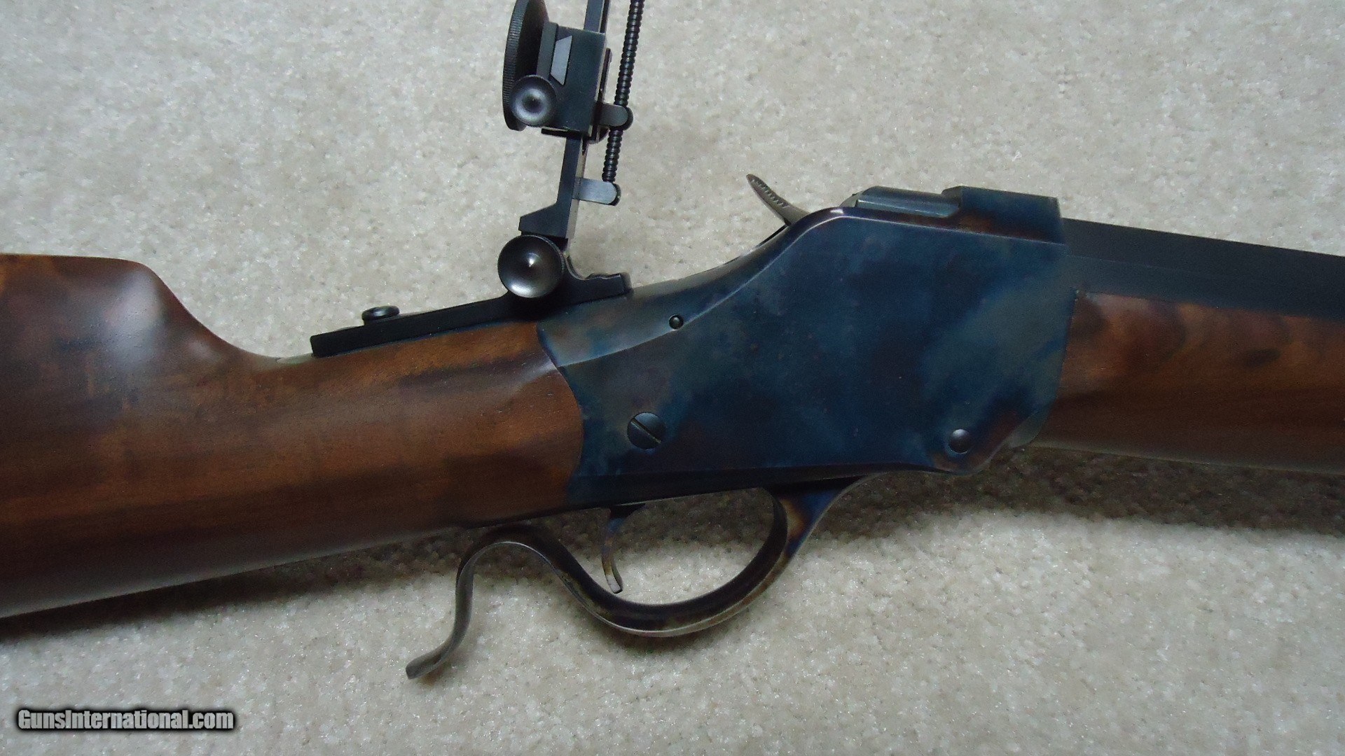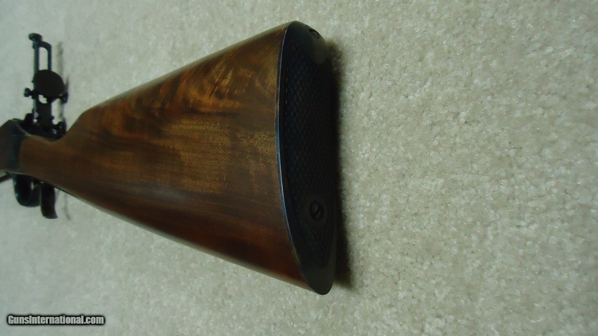Description: CUSTOM C. SHARPS MADE IN BIG TIMBER, MONTANA, 1885 HIGHWALL SINGLE SHOT IN .30-40 KRAG CALIBER. These are beautifully made rifles on the Winchester pattern thick side Highwall action that is known for its fast lock time and strength. This one has a 28" #3 weight half-octagon barrel (medium weight and standard in antique Winchester Highwall rifles in this caliber). The barrel is fitted with a full buckhorn folding ladder rear sight with elevation slide paired with a globe front sight that will take inserts (a post insert in in the globe now). It is also fitted with a C. Sharps marked mid-range fully adjustable for windage and elevation vernier tang sight. The semi-fancy walnut stock and forend show some nice grain and are a n attractive deep brown color. The butt is fitted with a case colored checkered steel shotgun butt plate. The receiver is case colored and the trigger pull is light and crisp. Overall, this rifle appears about new and unfired. These are always back ordered with a long delivery wait time. This one is also in a great, traditional caliber that was quite popular in Winchester Highwalls in the late 1890s to early 1900s. A super hunting or target rifle. Weighs approx. 10 1/2 lbs. SOLD Rifle Caliber: .30-40 Krag Manufacturer: C. SHARPS Model: 1885 HIGH WALL Serial Number: 85-6XX Barrel Length: 28" HALF OCT. Condition: LIKE NEW |