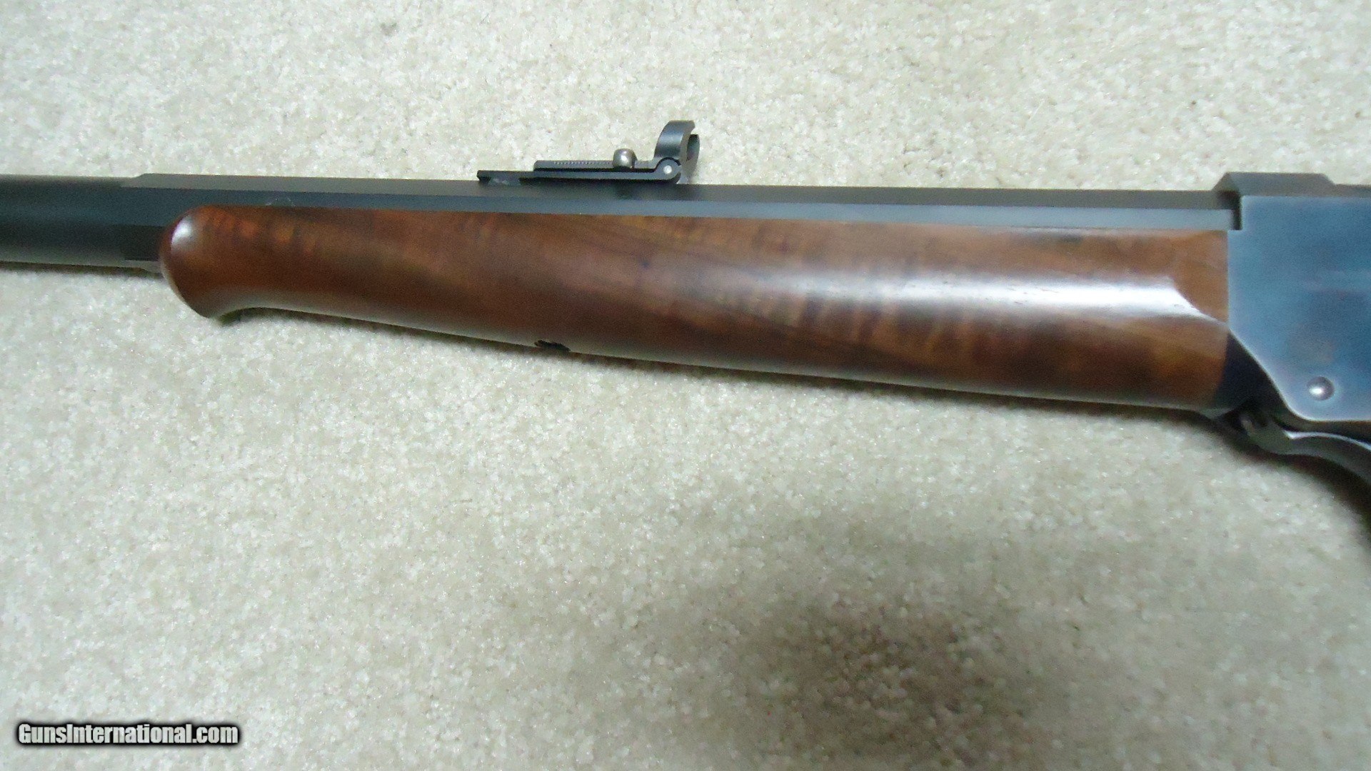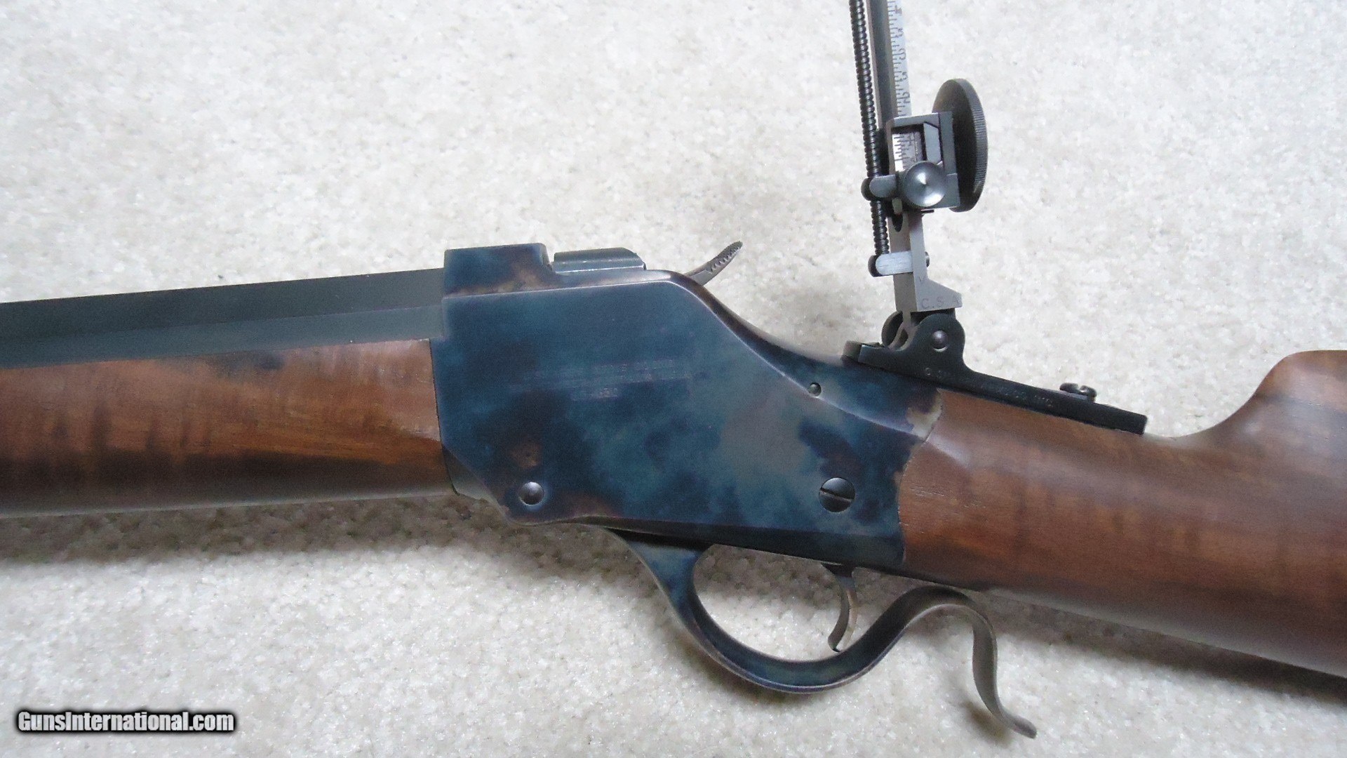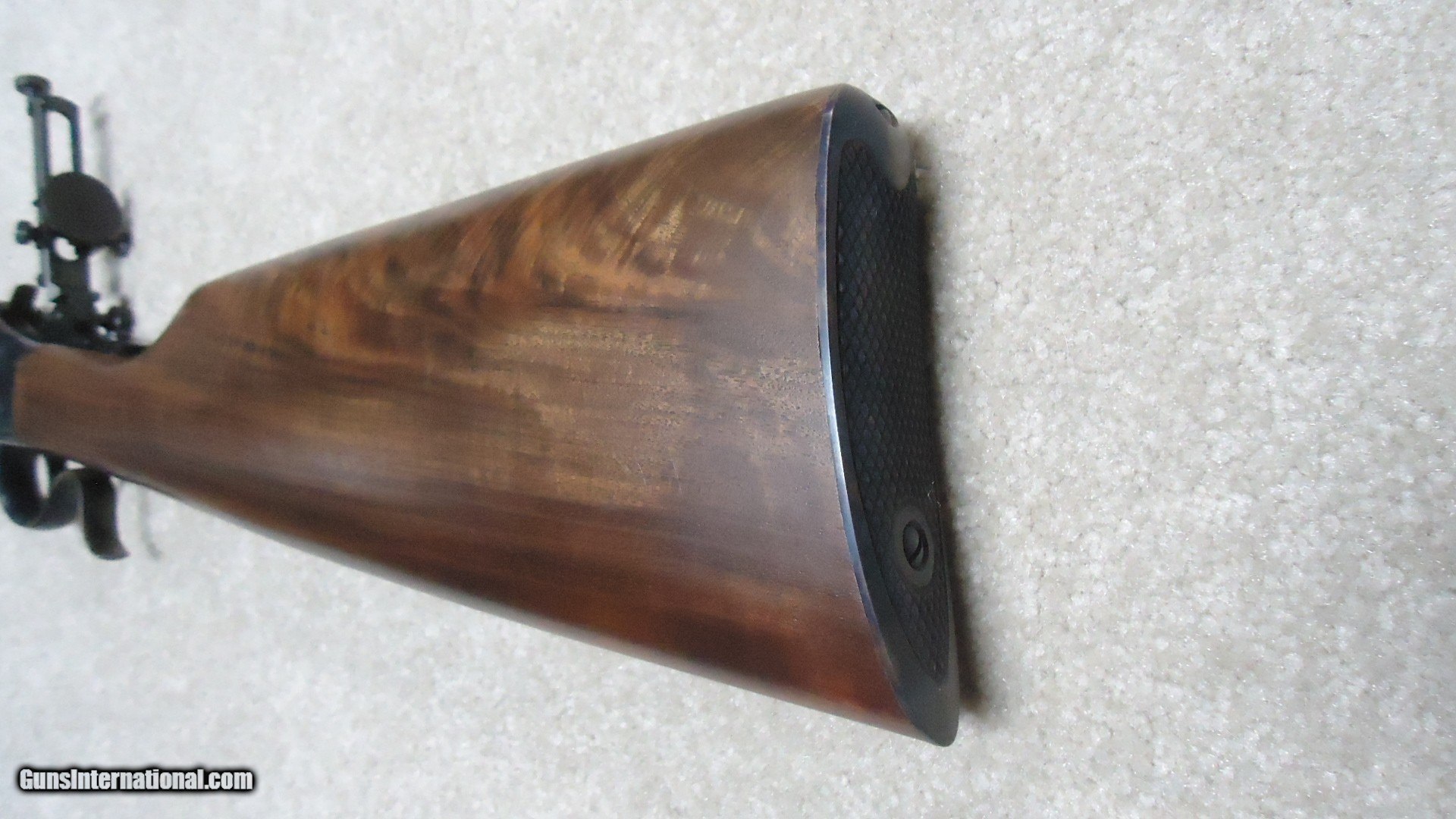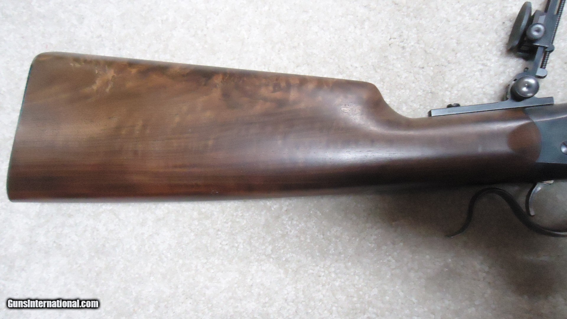 Description: CUSTOM C. SHARPS MADE IN BIG TIMBER, MONTANA, 1885 HIGHWALL SINGLE SHOT IN .30-40 KRAG CALIBER. These are beautifully made rifles on the Winchester pattern thick side Highwall action that is known for its fast lock time and strength. This one has a 28" #3 weight half-octagon barrel (medium weight and standard in antique Winchester Highwall rifles in this caliber). The barrel is fitted with a full buckhorn folding ladder rear sight with elevation slide paired with a globe front sight that will take inserts (a post insert in in the globe now). It is also fitted with a C. Sharps marked mid-range fully adjustable for windage and elevation vernier tang sight. The semi-fancy walnut stock and forend show some nice grain and are a n attractive deep brown color. The butt is fitted with a case colored checkered steel shotgun butt plate. The receiver is case colored and the trigger pull is light and crisp. Overall, this rifle appears about new and unfired. These are always back ordered with a long delivery wait time. This one is also in a great, traditional caliber that was quite popular in Winchester Highwalls in the late 1890s to early 1900s. A super hunting or target rifle. Weighs approx. 10 1/2 lbs. SOLD Rifle Caliber: .30-40 Krag Manufacturer: C. SHARPS Model: 1885 HIGHWALL Serial Number: 85- Barrel Length: 28" HALF OCT. Condition: LIKE NEW |
