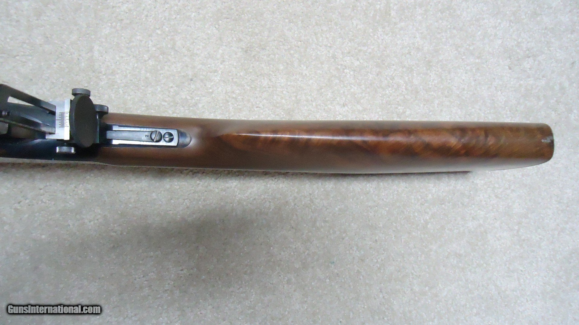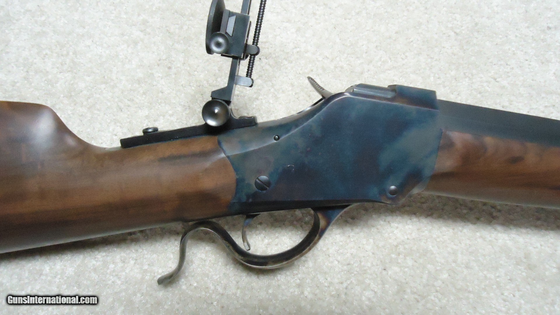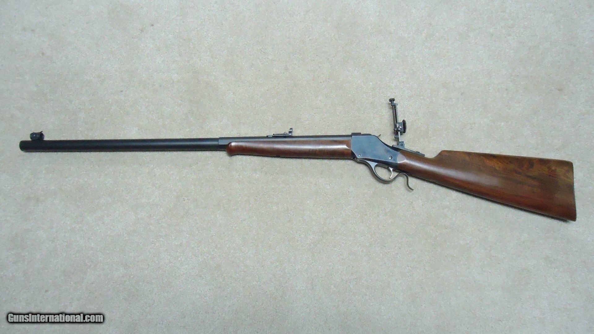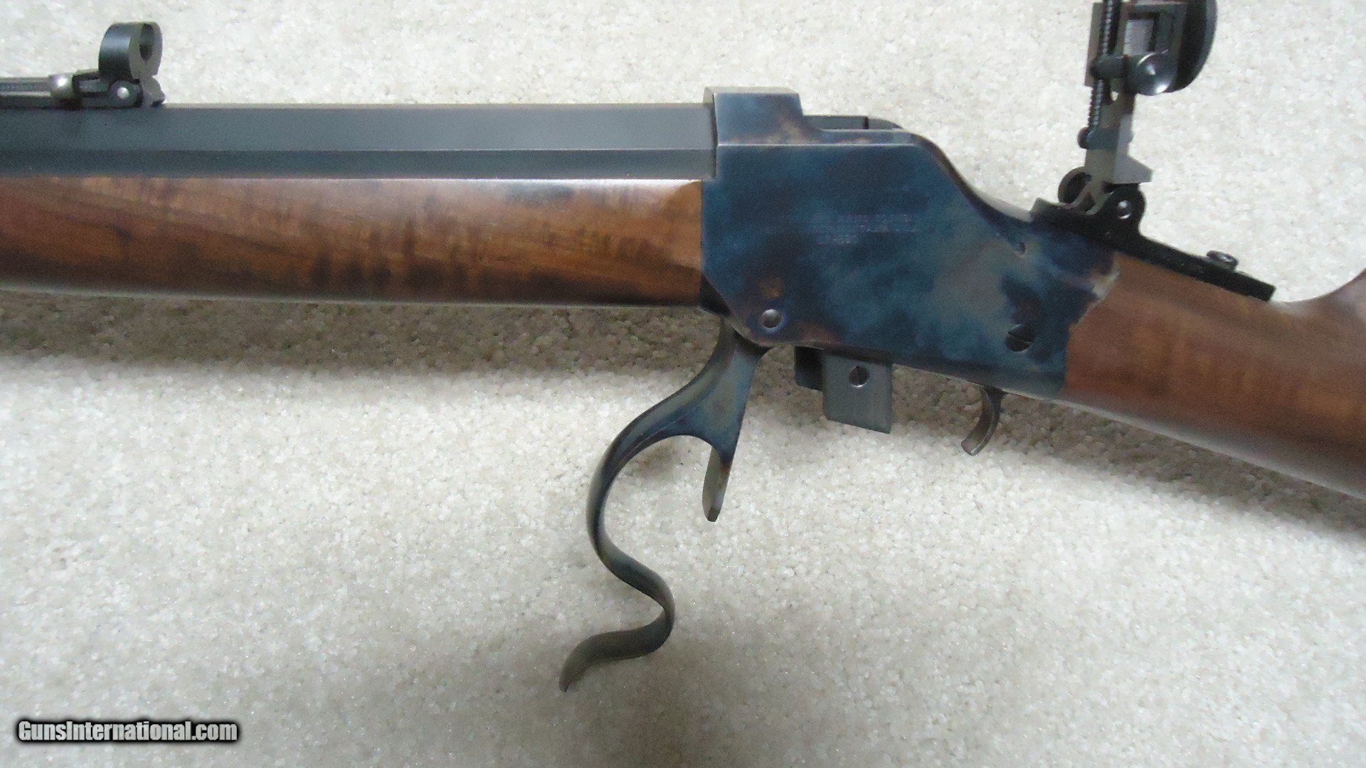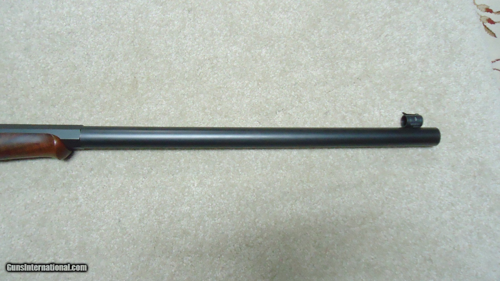 Description: CUSTOM C. SHARPS MADE IN BIG TIMBER, MONTANA, 1885 HIGHWALL SINGLE SHOT IN .30-40 KRAG CALIBER. These are beautifully made rifles on the Winchester pattern thick side Highwall action that is known for its fast lock time and strength. This one has a 28" #3 weight half-octagon barrel (medium weight and standard in antique Winchester Highwall rifles in this caliber). The barrel is fitted with a full buckhorn folding ladder rear sight with elevation slide paired with a globe front sight that will take inserts (a post insert in in the globe now). It is also fitted with a C. Sharps marked mid-range fully adjustable for windage and elevation vernier tang sight. The semi-fancy walnut stock and forend show some nice grain and are a n attractive deep brown color. The butt is fitted with a case colored checkered steel shotgun butt plate. The receiver is case colored and the trigger pull is light and crisp. Overall, this rifle appears about new and unfired. These are always back ordered with a long delivery wait time. This one is also in a great, traditional caliber that was quite popular in Winchester Highwalls in the late 1890s to early 1900s. A super hunting or target rifle. Weighs approx. 10 1/2 lbs. SOLD Rifle Caliber: .30-40 Krag Manufacturer: C. SHARPS Model: 1885 HIGHWALL Serial Number: 85- Barrel Length: 28" HALF OCT. Condition: LIKE NEW |