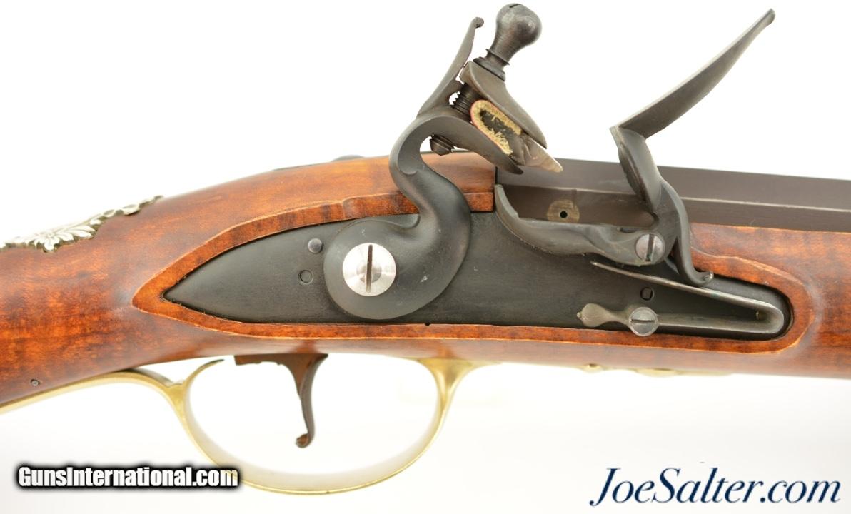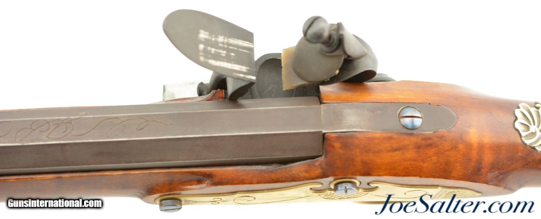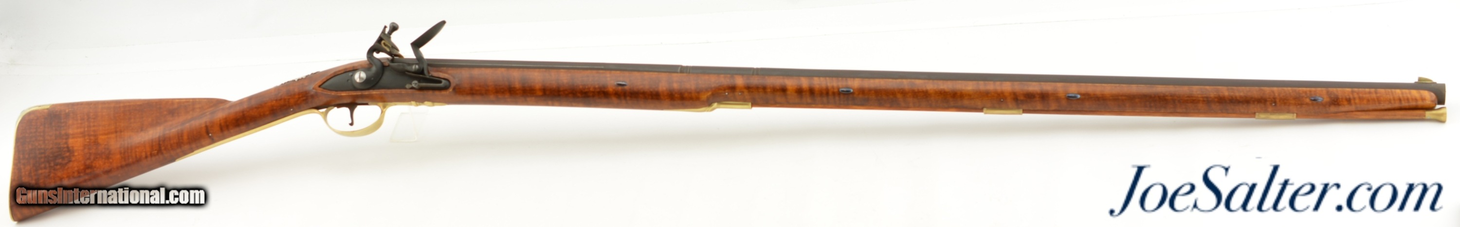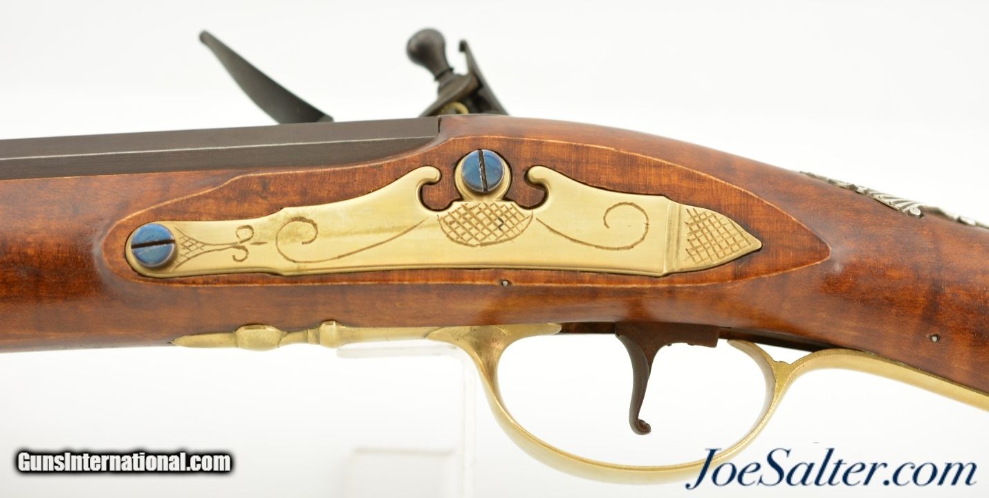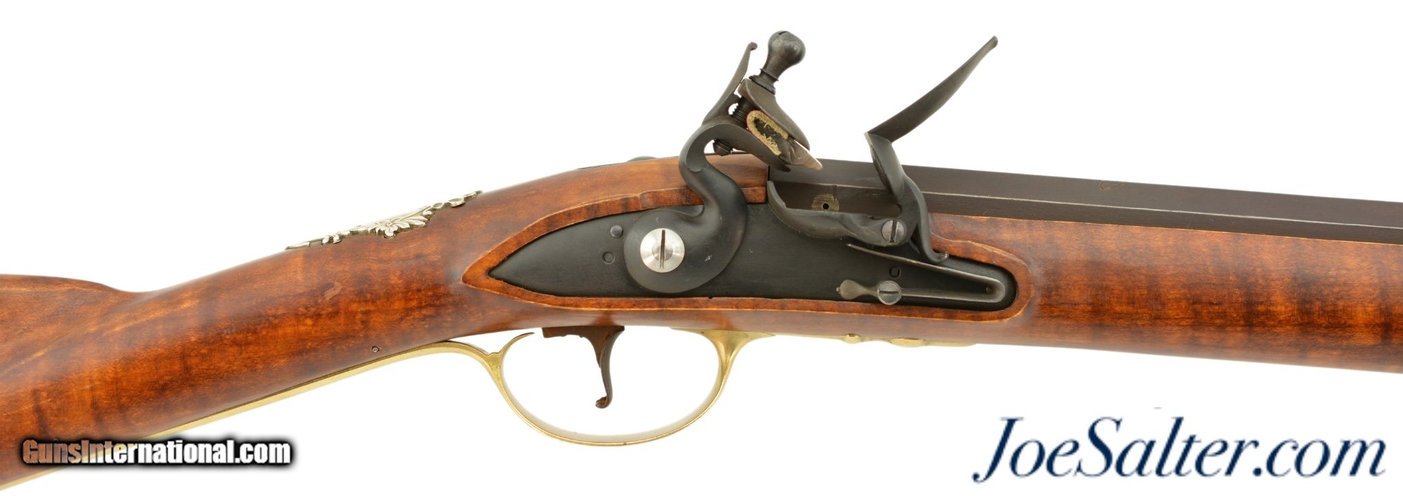 Description: Serial #NSN, .60 caliber, black powder, 42.25 inch part octagon part round barrel with a bright, excellent bore that appears unfired. This is a "G.B. WHITE" marked colonial style flintlock smoothbore muzzleloader built by Dr. Gary Banks White who was a well respected gun maker, founder of the "Green River Rifle Works" in 1972. He passed away in 2022 after a lifetime of historic reproduction gun building and innovative gun creation. This fine example of "Doc's" work remains in excellent condition with the browned barrel showing almost no wear with nearly all, 99% plus of the original finish as does the lock and hammer which shows only a few scratches on the frizzen. The striped maple stock is likewise excellent with very nice wood grain pattern. All brass furniture are bright and shiny with hand engraved cannon and drum scene on the buttplate. There is a silver escutcheon at the wrist ready for engraving. The brass tipped wood ramrod is excellent. The lock functions properly holding at half and full cock releasing with a crisp trigger pull. It comes with "The Leatherman" a protective leather cover for the action. A beautiful example of a historic pattern musket in near new, unfired condition from a very well respected maker. Antique SOLD |