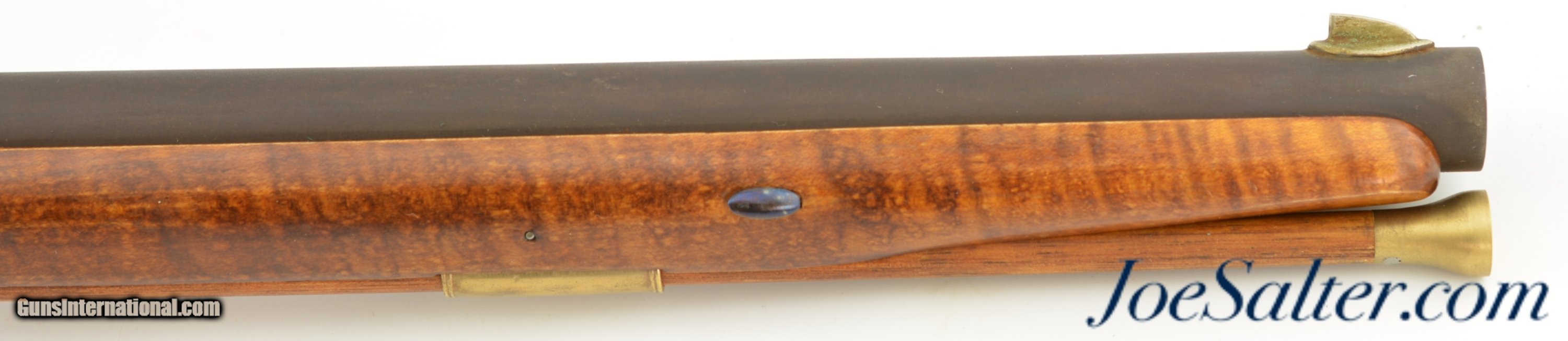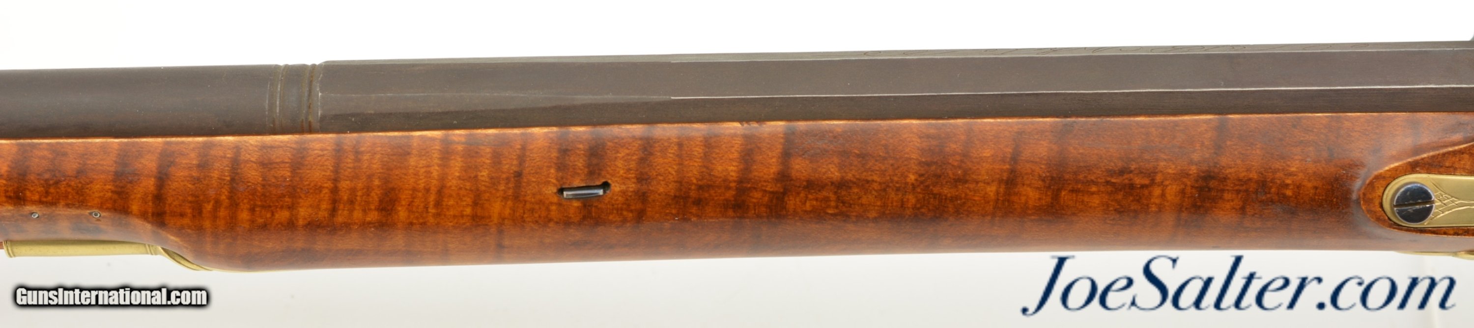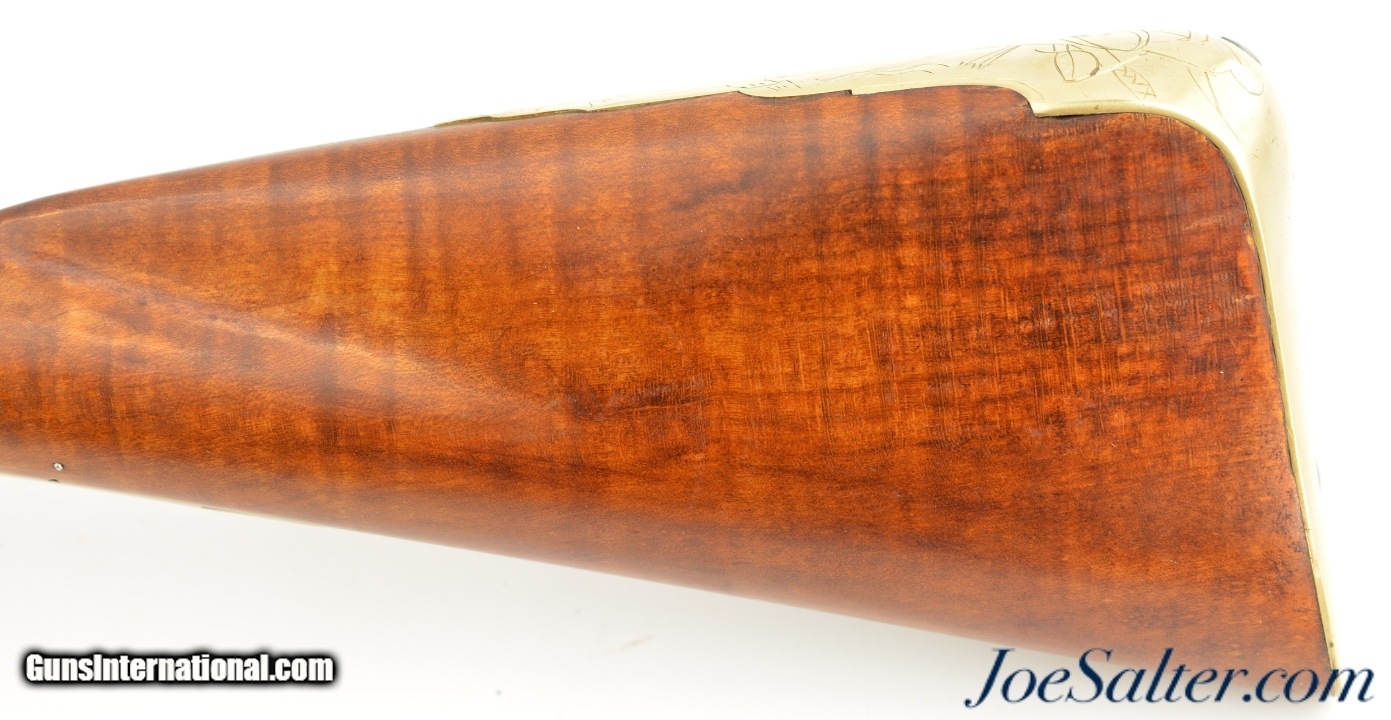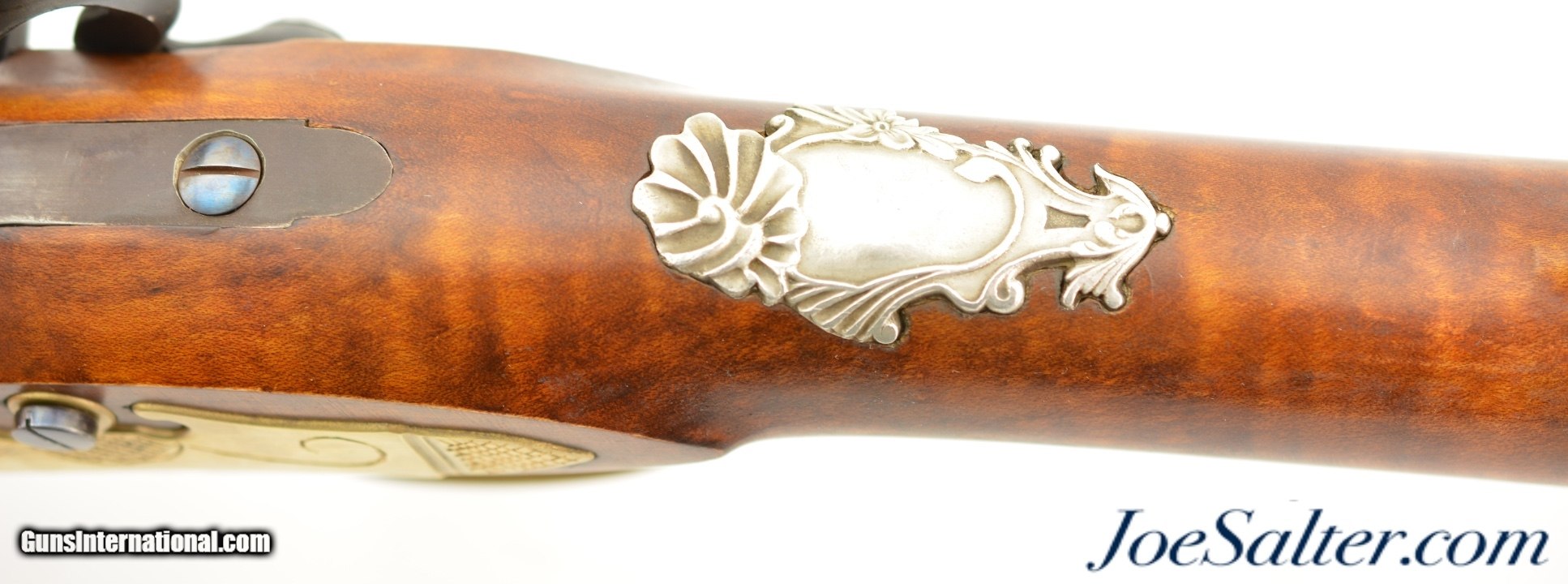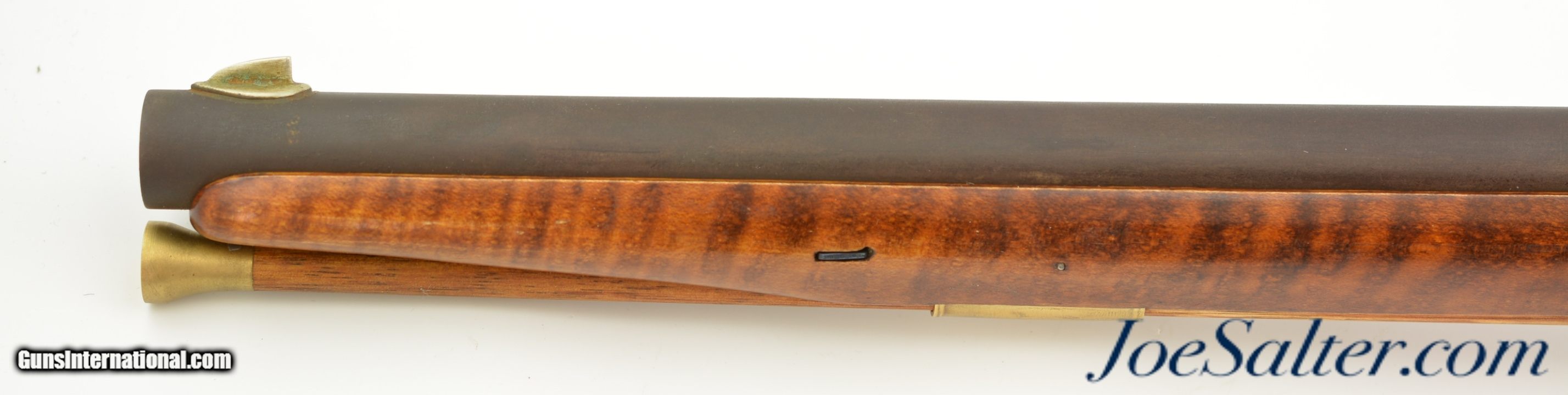 Description: Serial #NSN, .60 caliber, black powder, 42.25 inch part octagon part round barrel with a bright, excellent bore that appears unfired. This is a "G.B. WHITE" marked colonial style flintlock smoothbore muzzleloader built by Dr. Gary Banks White who was a well respected gun maker, founder of the "Green River Rifle Works" in 1972. He passed away in 2022 after a lifetime of historic reproduction gun building and innovative gun creation. This fine example of "Doc's" work remains in excellent condition with the browned barrel showing almost no wear with nearly all, 99% plus of the original finish as does the lock and hammer which shows only a few scratches on the frizzen. The striped maple stock is likewise excellent with very nice wood grain pattern. All brass furniture are bright and shiny with hand engraved cannon and drum scene on the buttplate. There is a silver escutcheon at the wrist ready for engraving. The brass tipped wood ramrod is excellent. The lock functions properly holding at half and full cock releasing with a crisp trigger pull. It comes with "The Leatherman" a protective leather cover for the action. A beautiful example of a historic pattern musket in near new, unfired condition from a very well respected maker. Antique SOLD |