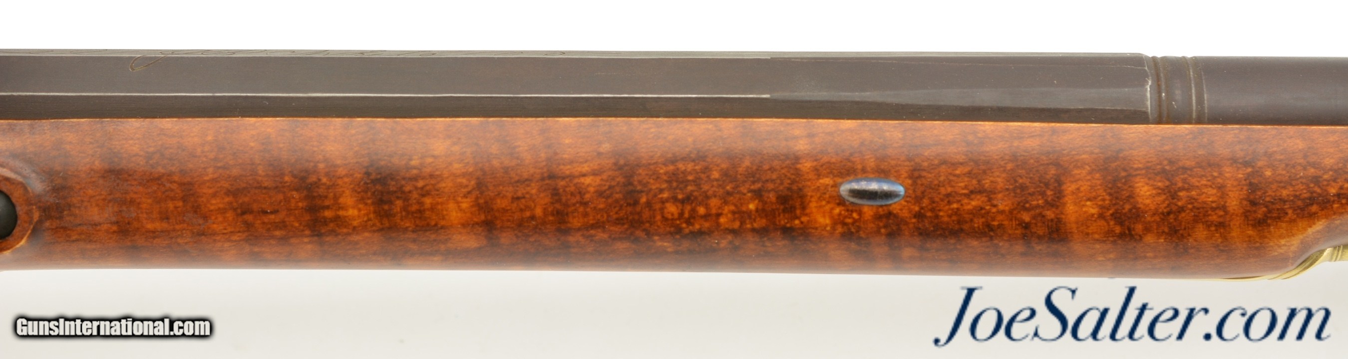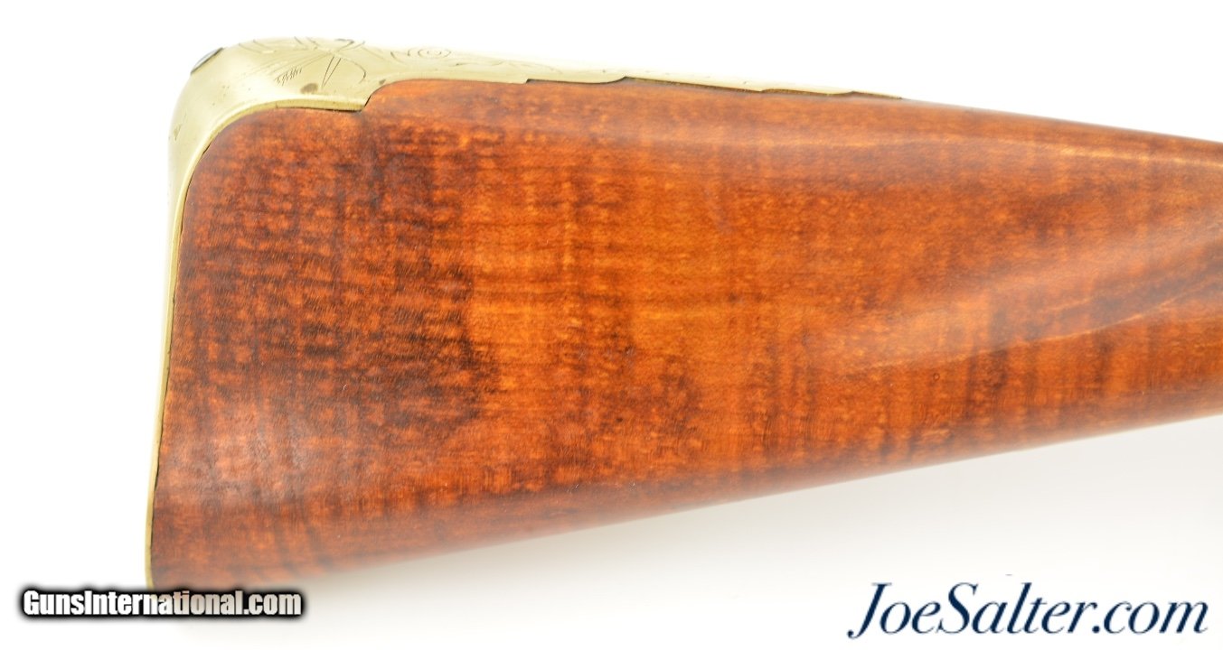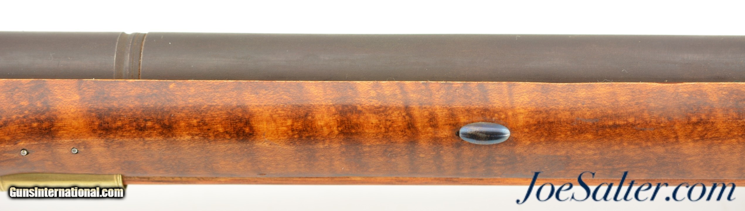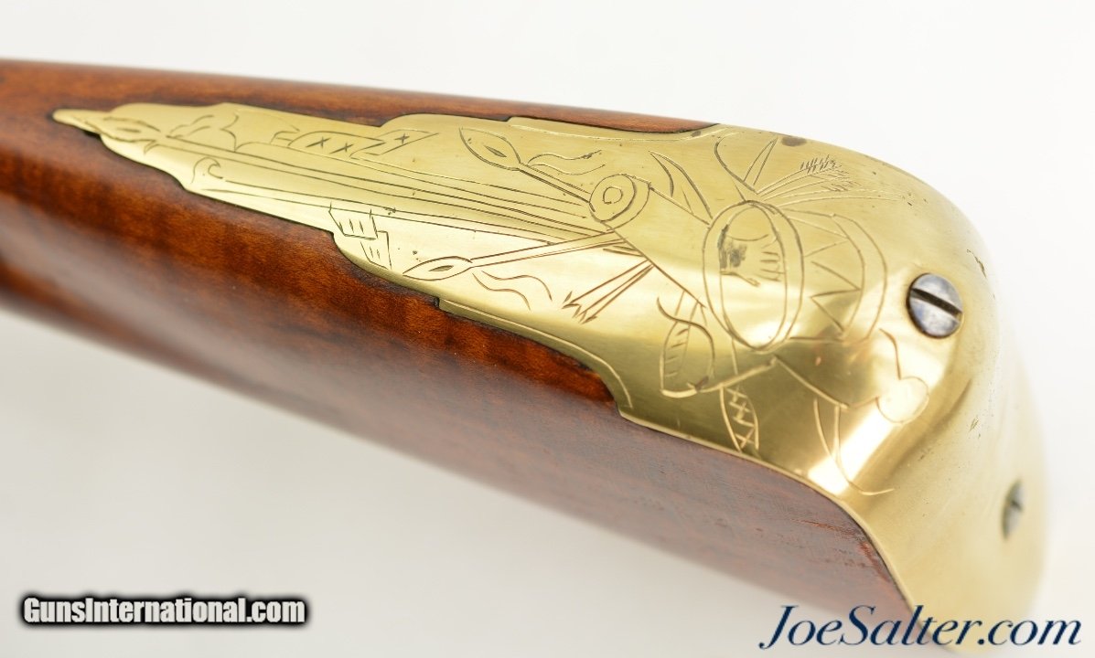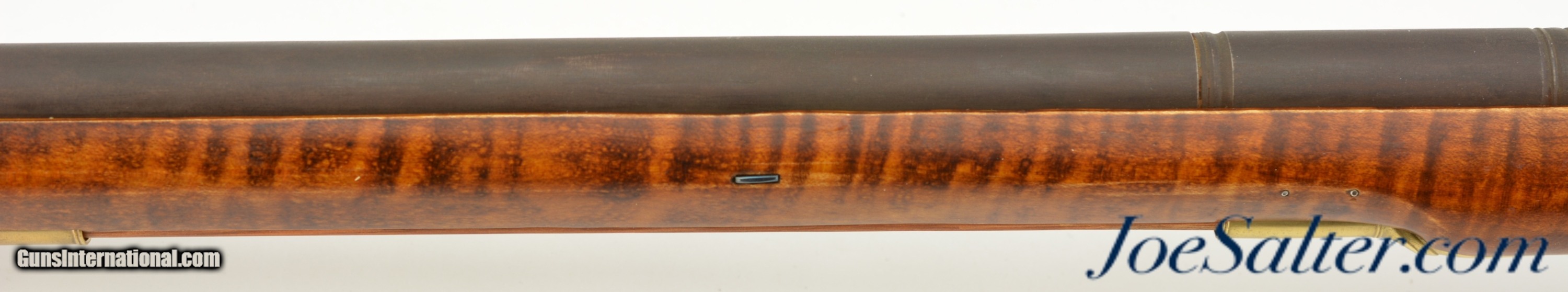 Description: Serial #NSN, .60 caliber, black powder, 42.25 inch part octagon part round barrel with a bright, excellent bore that appears unfired. This is a "G.B. WHITE" marked colonial style flintlock smoothbore muzzleloader built by Dr. Gary Banks White who was a well respected gun maker, founder of the "Green River Rifle Works" in 1972. He passed away in 2022 after a lifetime of historic reproduction gun building and innovative gun creation. This fine example of "Doc's" work remains in excellent condition with the browned barrel showing almost no wear with nearly all, 99% plus of the original finish as does the lock and hammer which shows only a few scratches on the frizzen. The striped maple stock is likewise excellent with very nice wood grain pattern. All brass furniture are bright and shiny with hand engraved cannon and drum scene on the buttplate. There is a silver escutcheon at the wrist ready for engraving. The brass tipped wood ramrod is excellent. The lock functions properly holding at half and full cock releasing with a crisp trigger pull. It comes with "The Leatherman" a protective leather cover for the action. A beautiful example of a historic pattern musket in near new, unfired condition from a very well respected maker. Antique SOLD |
