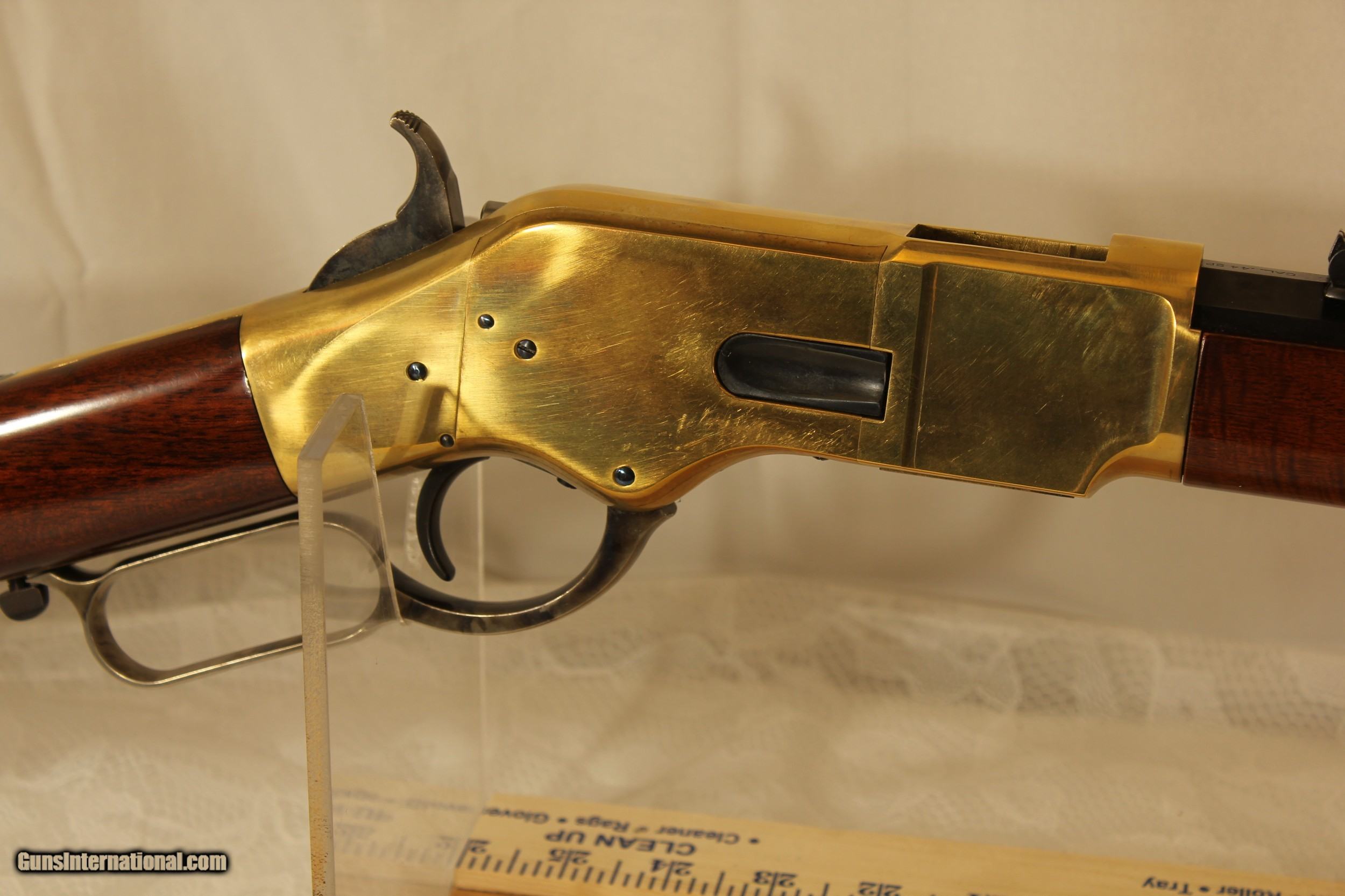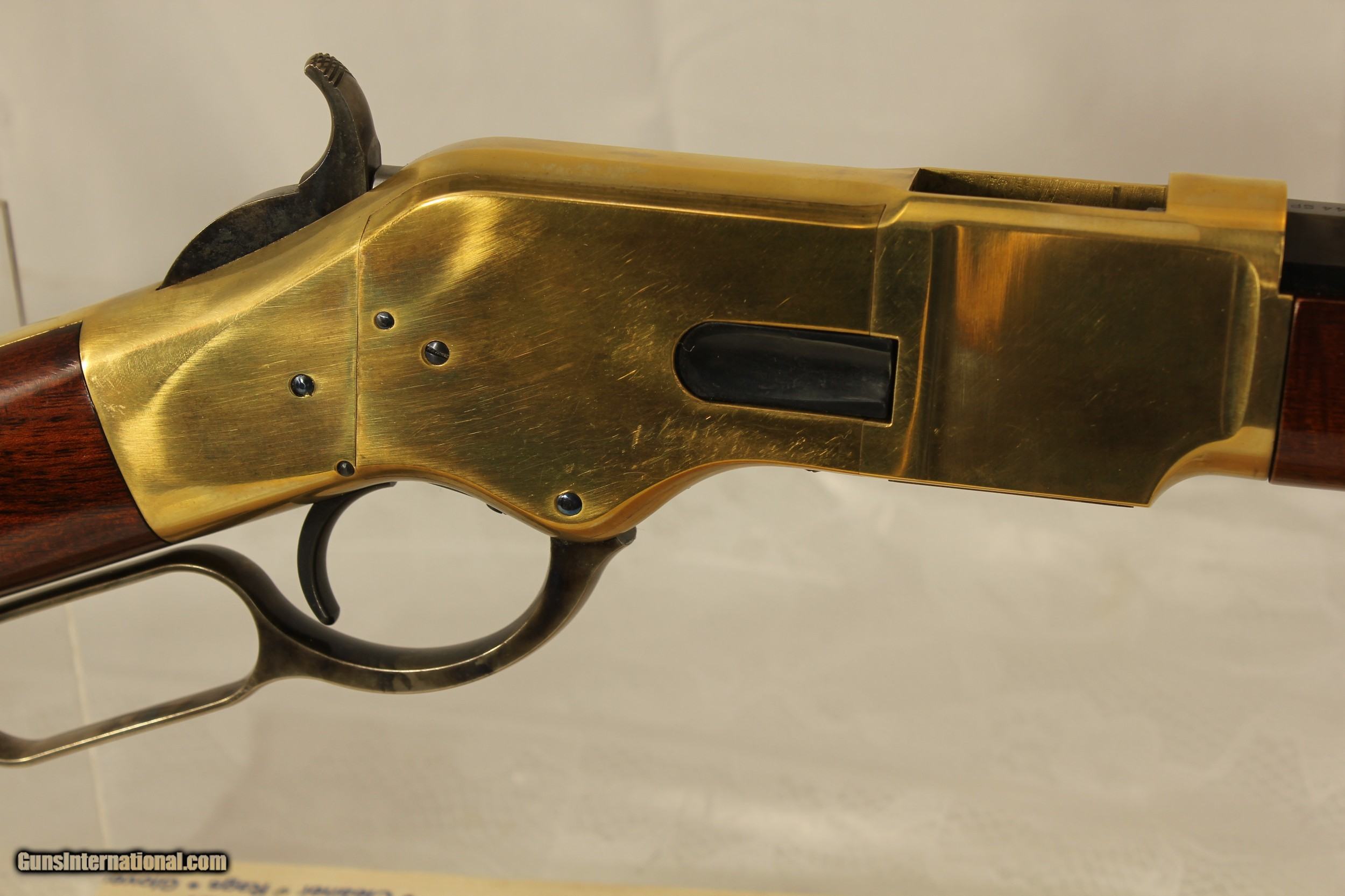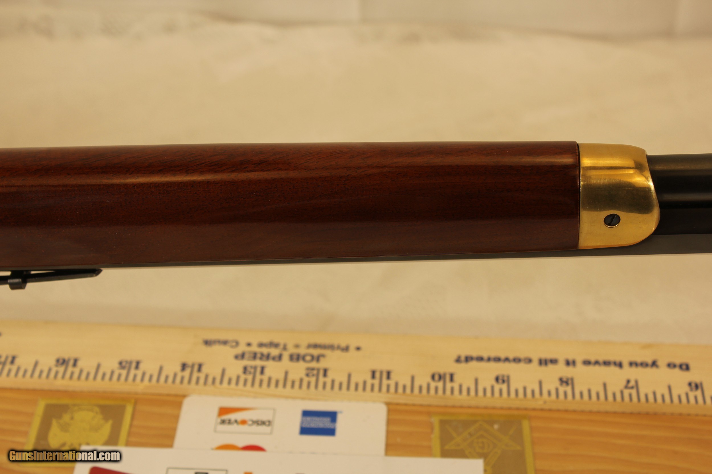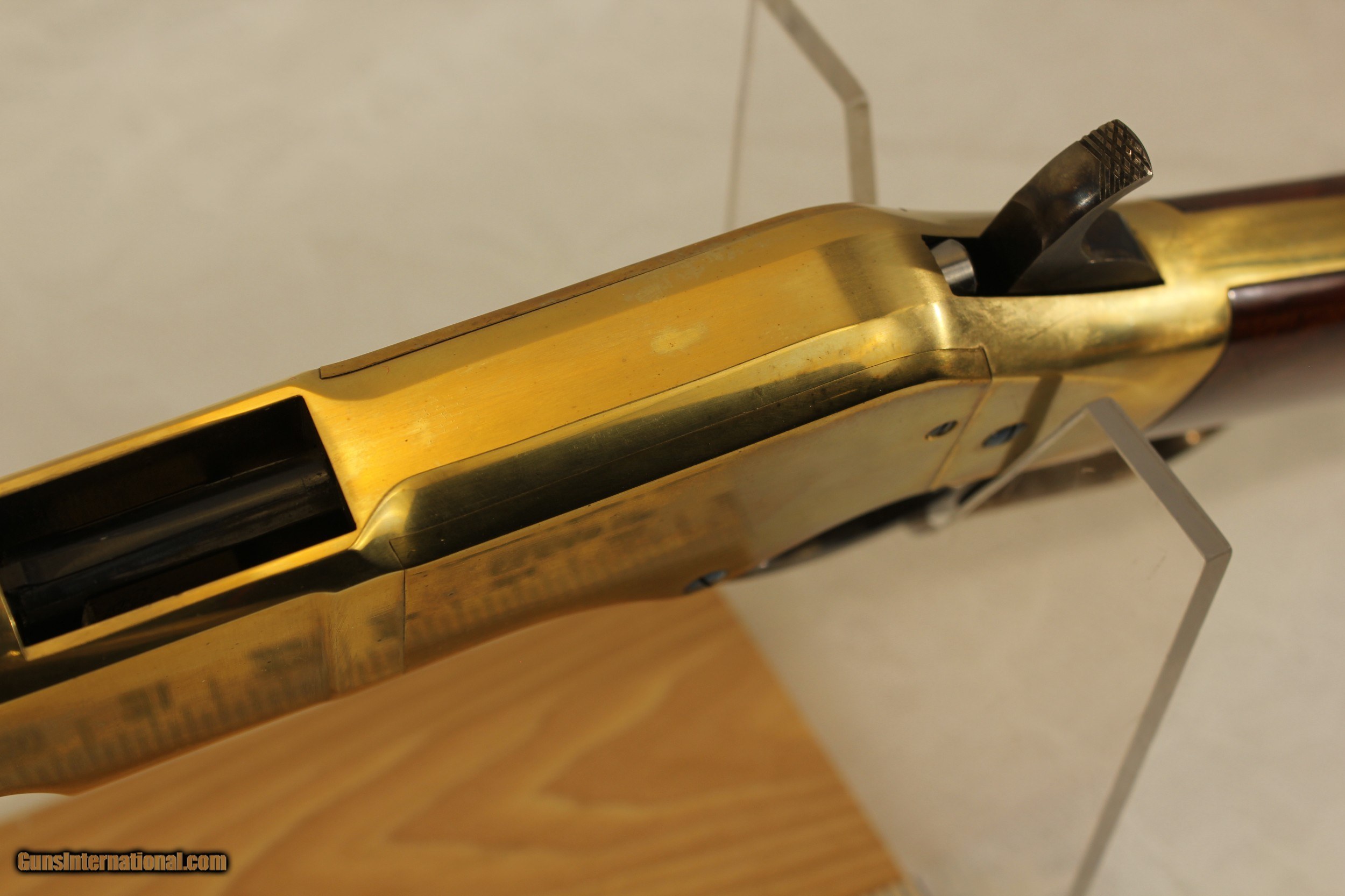 Description: SOLD SOLD SOLD This Yellow Boy replica model 1866 Winchester is an excellent copy of the Winchester 1866 rifle. It has an Octagon barrel and a ladder rear sight. It is 98% condition. Uberti is the foremost and quality replica maker. A real quality rifle. This gun has a 24 inch barrel. $60.00 shipping via Priority Mail. SOLD |