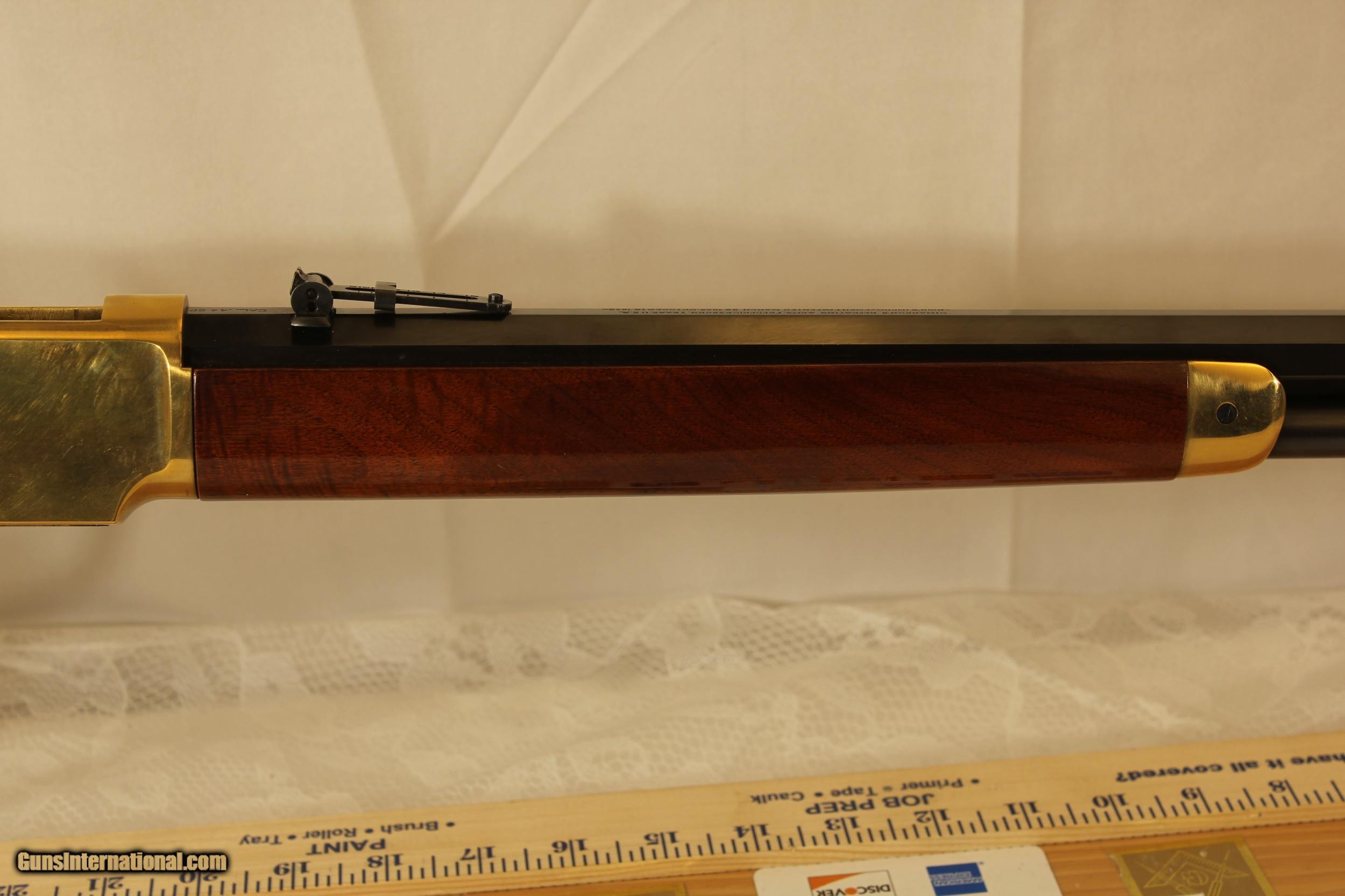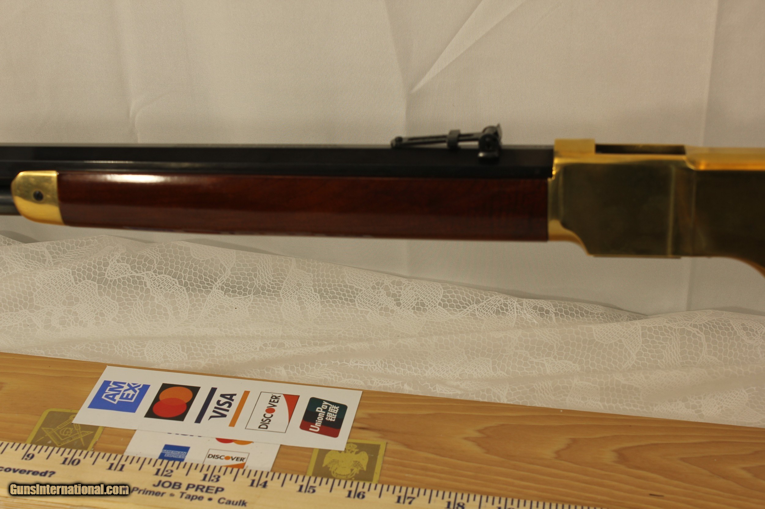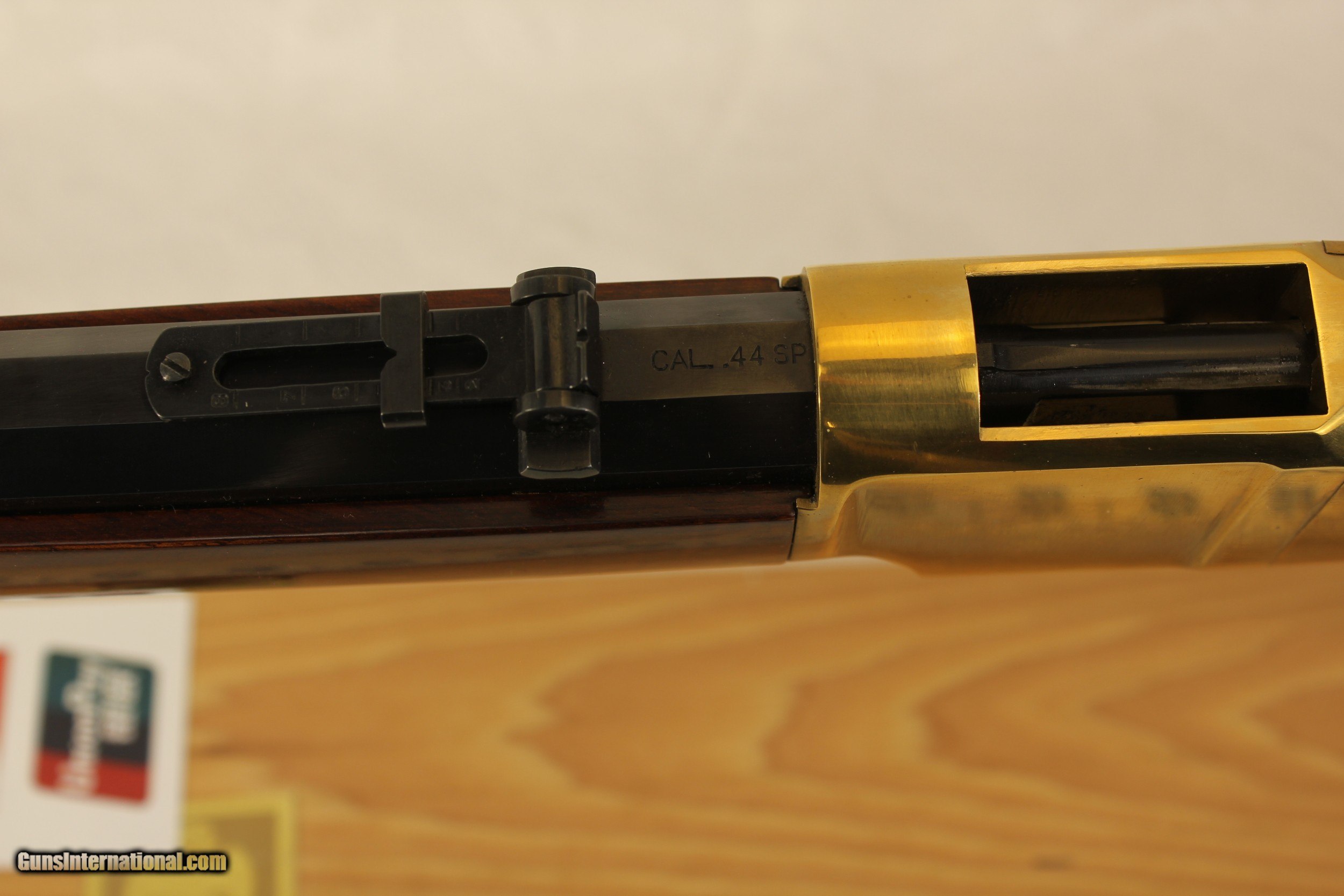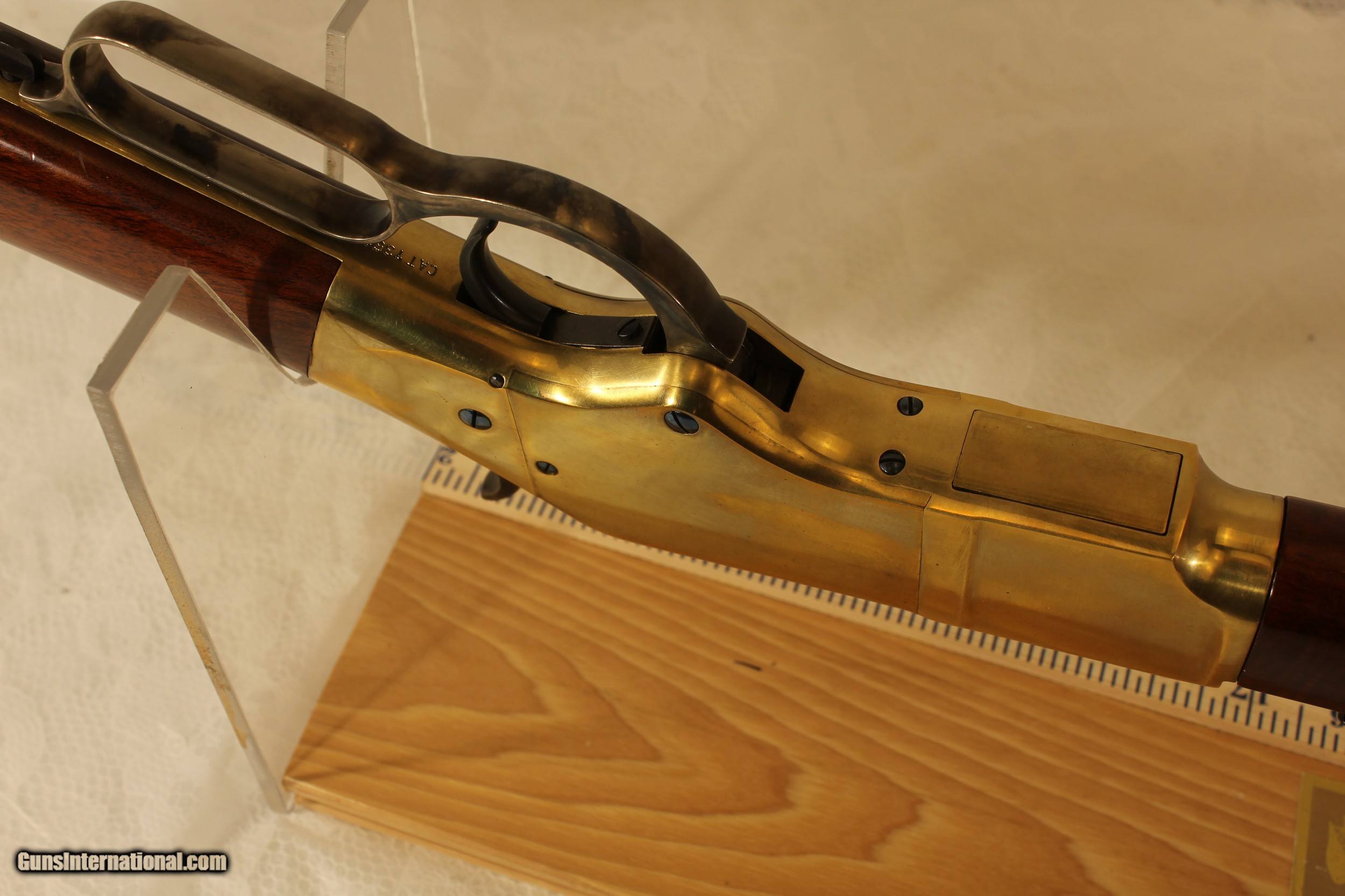 Description: SOLD SOLD SOLD This Yellow Boy replica model 1866 Winchester is an excellent copy of the Winchester 1866 rifle. It has an Octagon barrel and a ladder rear sight. It is 98% condition. Uberti is the foremost and quality replica maker. A real quality rifle. This gun has a 24 inch barrel. $60.00 shipping via Priority Mail. SOLD |