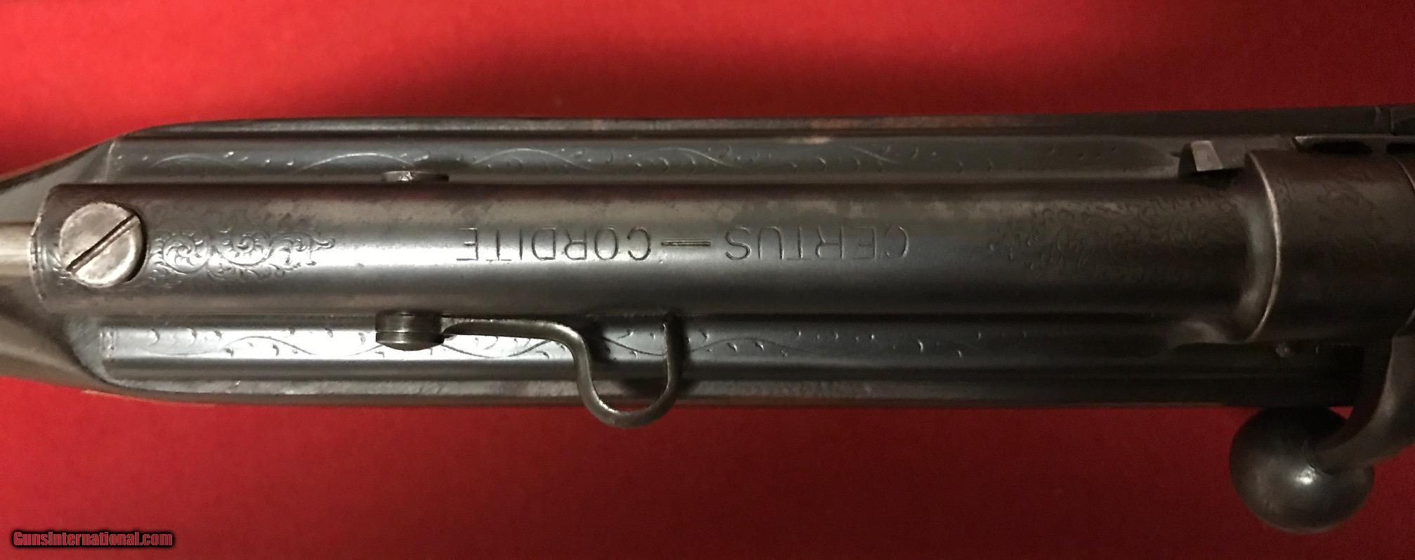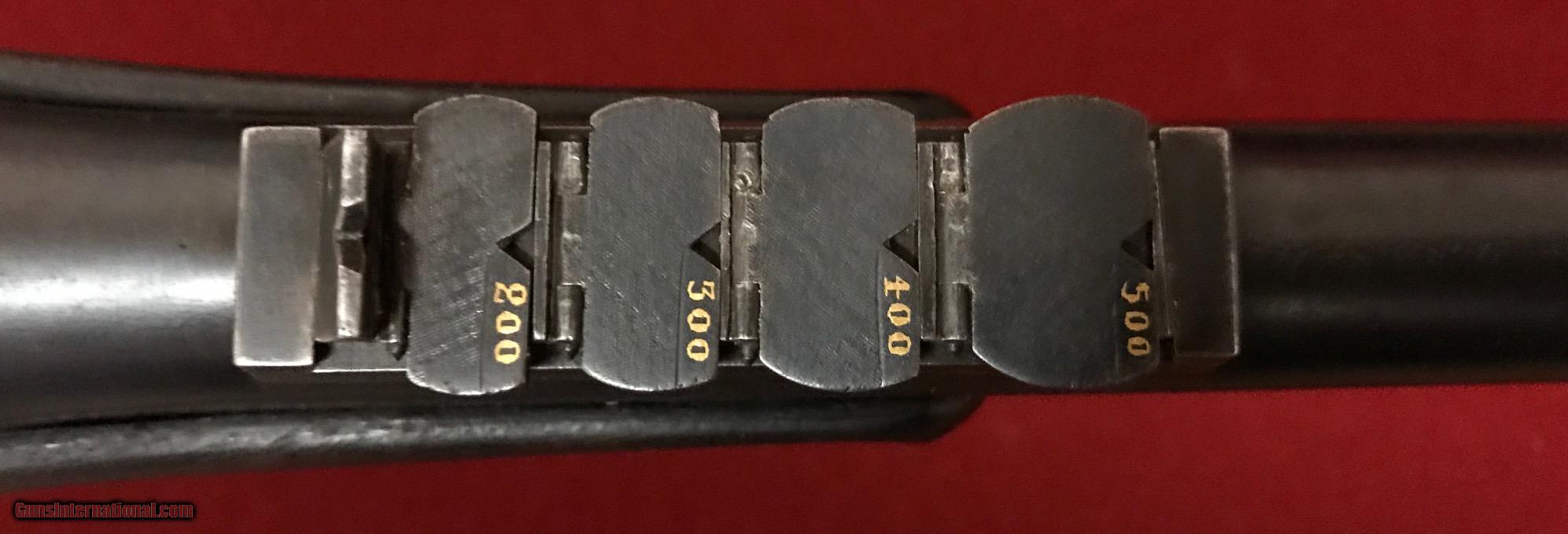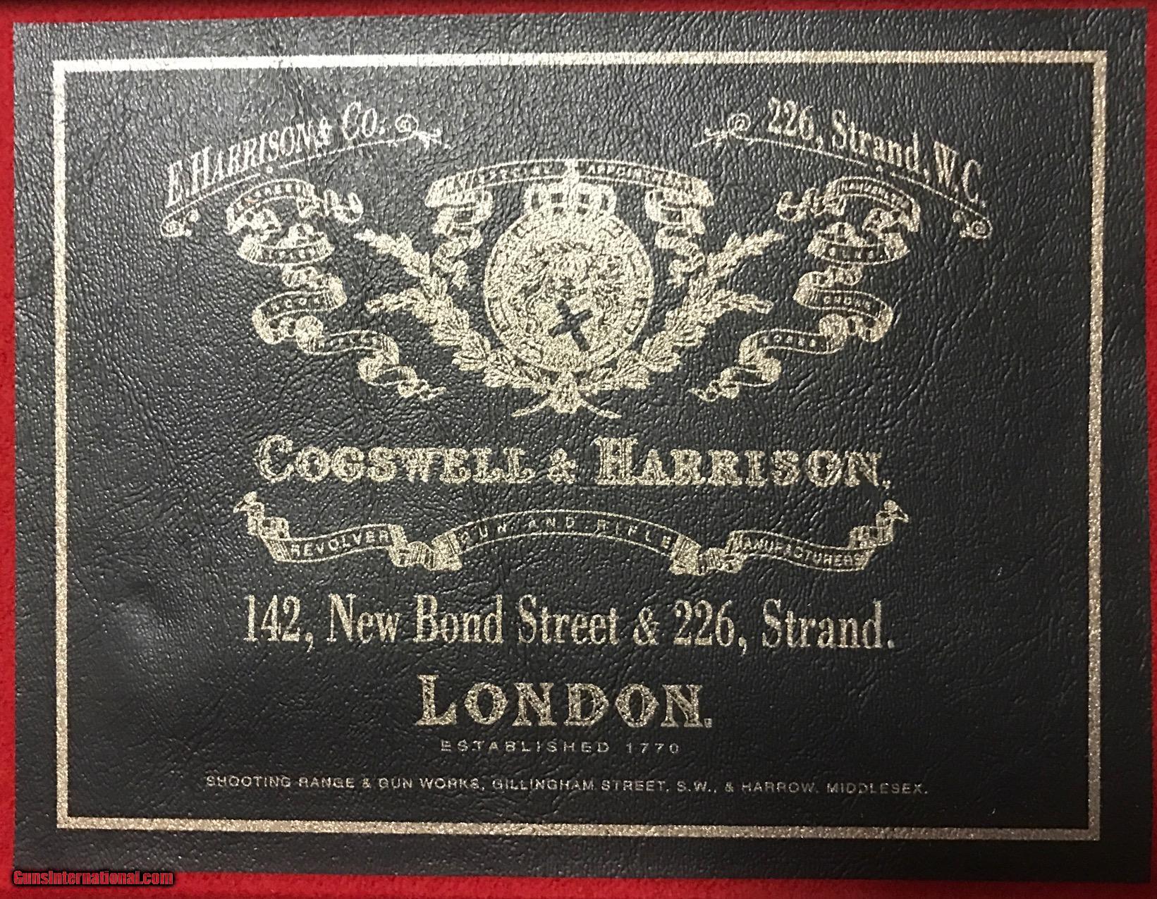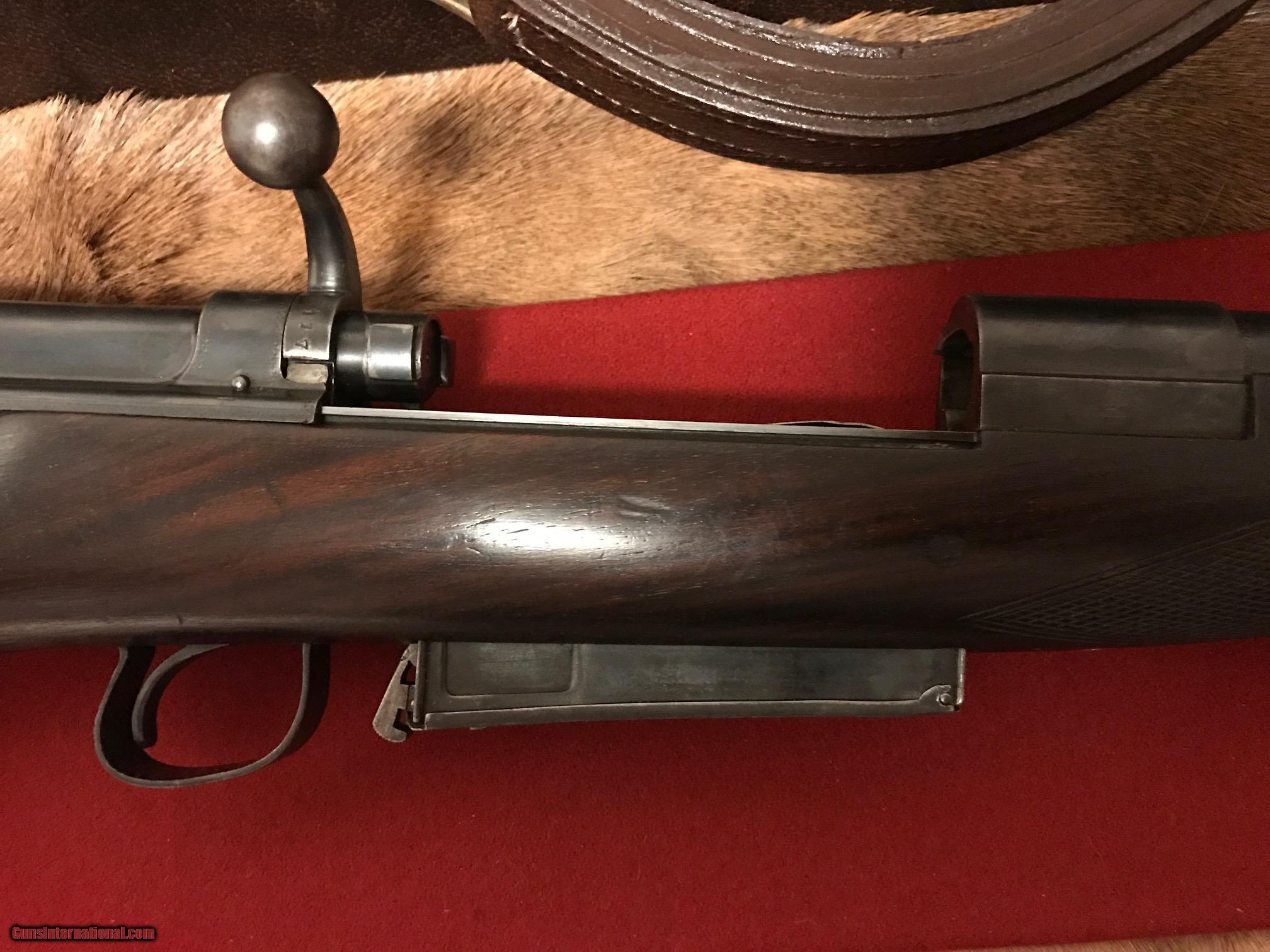 Description: This is a very rare Cogswell & Harrison Certus Dangerous Game Rifle in 450/400 Nitro Express. They were made circa 1905-1906 on a reliable action of their own design in an ingenious manner so that a double rifle rimmed cartridge would reliably feed and extract from a magazine rifle. They made very few of these guns and this particular example is the best one you'll find shown anywhere on the Internet. In this publication that describes the gun they were unable to find a specimen to photograph in anywhere near as high of a condition as the subject gun of this sale. ://countryclubuk/ci/ci76_rifles.pdf This was in 1905 and still is today, an affordable, reliable dangerous game rifle for use on a variety of prey. I had great success using another vintage Cogswell & Harrison rifle in Africa last year and would not hestiate to put this rifle into service. The gun has been fit with an Old English recoil pad which makes recoil quite present to shoot with even the full Nitro load for which the gun is proofed. The regulation load so stamped by the London proof house is 60gr cordite and a 400gr bullet. Bullets and brass are affordable and readily available for this cartridge and many load recipes exist with IMR4350, 3031 and others to reproduce the regulated load. The gun features an island rear sight base with one standing sight regulated at 50 yards and four folding leafs with gold inlay references for 200, 300, 400 and 500 yards. The original 25" barrels have not been cut down as was so often the case. The gun is tight overall with a nice trigger pull, crisp safety and smooth bolt operation. Stock is a beautiful British red oil finish to the nicely grained English Walnut. Checkering exhibits some wear and the stock has the customary handling bumps of a vintage African game rifle. The gun includes a beautiful brass and leather case with wool baize lining that reused the original British case lock and other components. Custom cleaning rod and oil bottle included and proper maker's label. The case is a true safari case with two tiers, top tier for the rifle, lower tier for cleaning rod, ammo and accessories. Very fairly priced considering the cost of the case alone nearly approaches the price of the gun. You'll not find another Certus in the marketplace in this condition and the unique original engraving and figure of this example make it a high grade example. The gun is C&R eligible. I will ship the rifle within the USA to a licensed FFL or C&R FFL. Local pickup is possible if you are an Illinois resident with a valid FOID card. Shipping will be via UPS ground at a charge fo $75 flat rate for the gun and case. Feel free to contact me with questions about the rifle. I hope the new owner gets enjoyment and use from the rifle. I've personally relished using vintage rifles on my African safaris and hope you will too. SOLD Curio/Relic: Yes Manufacturer: Cogswell and Harrison Model: Certus Serial Number: 30117 Caliber Info: 450/400 Nitro Express Condition: VG Metal Condition: VG - Some blueing wear Wood Condition: Good oil finish. Some wear to checkering and dings. Bore Condition: Good Barrels: 25 Barrel Type: Fluid Steel Action: Bolt Action with External Magazine Stock: English Walnut - Pistol Grip - Original to the gun Stock Dimensions: 14-1/4" Length of Pull Engraving: Scroll and Border Case: Leather and Brass - With original British Lock Item Location: Illinois Proof:Nitro: 450/400 |