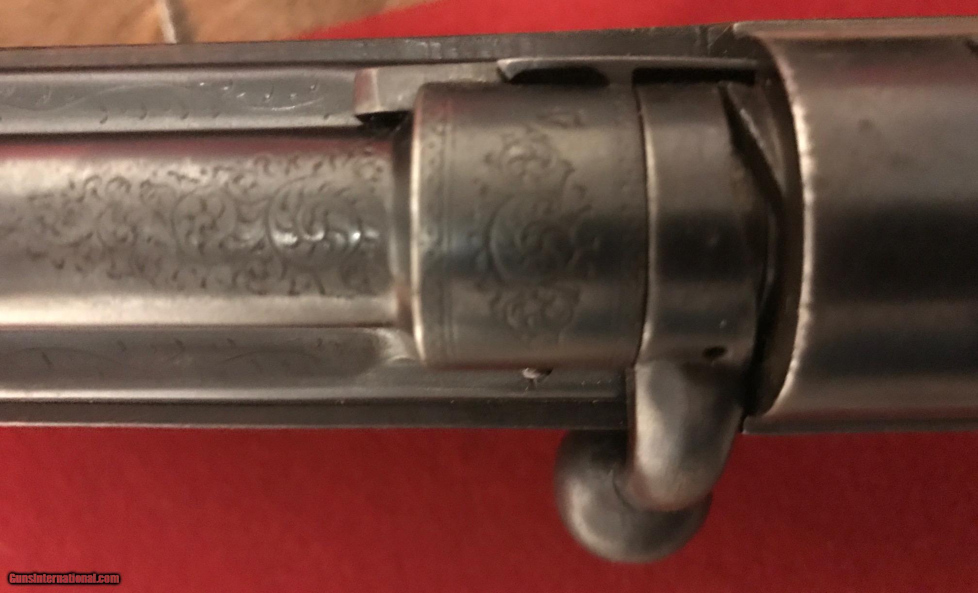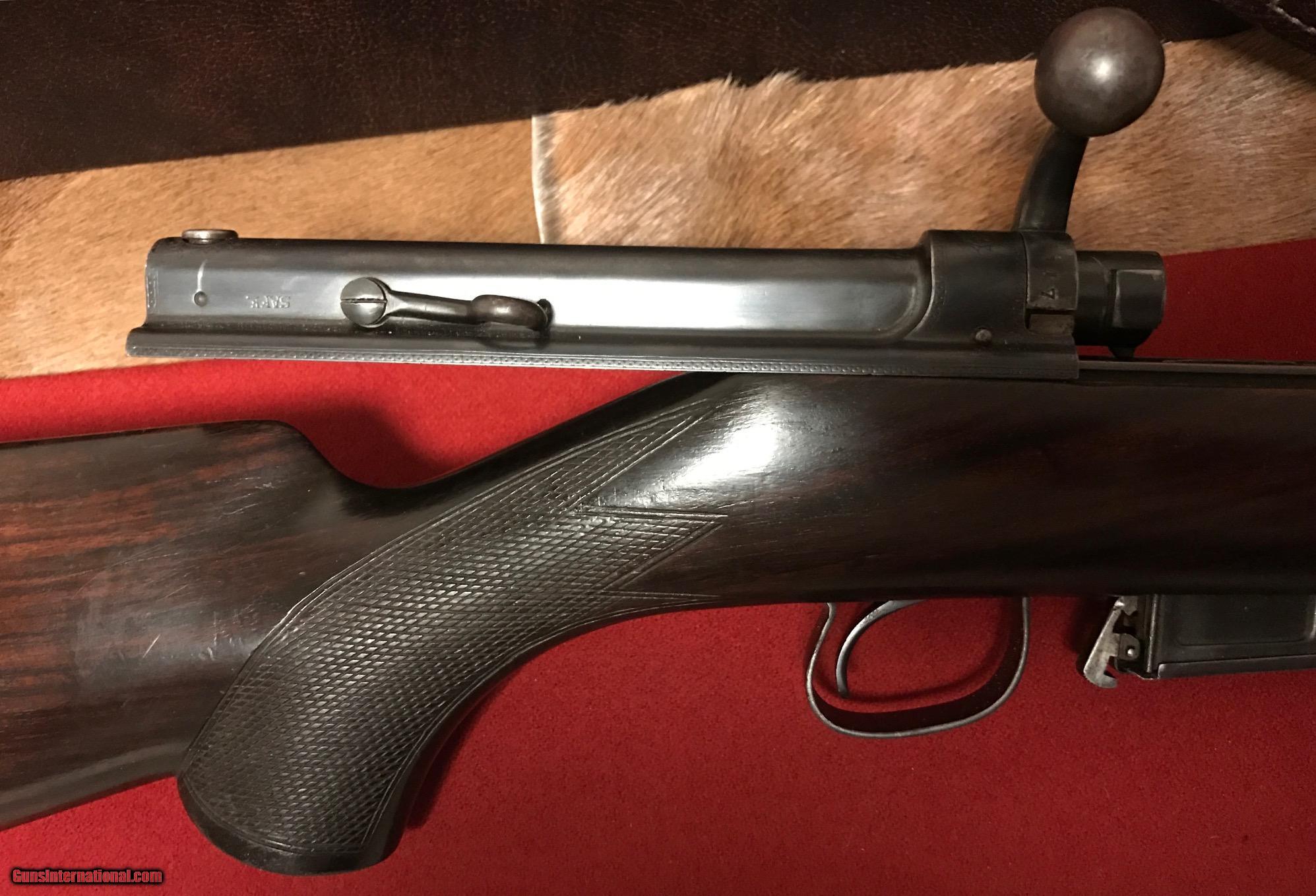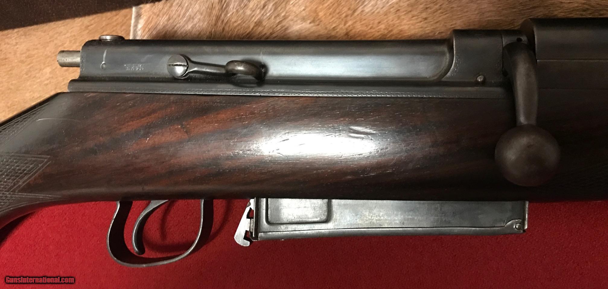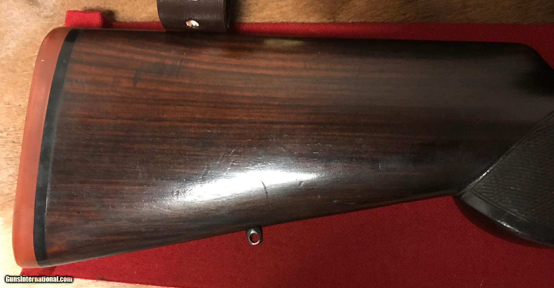 Description: This is a very rare Cogswell & Harrison Certus Dangerous Game Rifle in 450/400 Nitro Express. They were made circa 1905-1906 on a reliable action of their own design in an ingenious manner so that a double rifle rimmed cartridge would reliably feed and extract from a magazine rifle. They made very few of these guns and this particular example is the best one you'll find shown anywhere on the Internet. In this publication that describes the gun they were unable to find a specimen to photograph in anywhere near as high of a condition as the subject gun of this sale. ://countryclubuk/ci/ci76_rifles.pdf This was in 1905 and still is today, an affordable, reliable dangerous game rifle for use on a variety of prey. I had great success using another vintage Cogswell & Harrison rifle in Africa last year and would not hestiate to put this rifle into service. The gun has been fit with an Old English recoil pad which makes recoil quite present to shoot with even the full Nitro load for which the gun is proofed. The regulation load so stamped by the London proof house is 60gr cordite and a 400gr bullet. Bullets and brass are affordable and readily available for this cartridge and many load recipes exist with IMR4350, 3031 and others to reproduce the regulated load. The gun features an island rear sight base with one standing sight regulated at 50 yards and four folding leafs with gold inlay references for 200, 300, 400 and 500 yards. The original 25" barrels have not been cut down as was so often the case. The gun is tight overall with a nice trigger pull, crisp safety and smooth bolt operation. Stock is a beautiful British red oil finish to the nicely grained English Walnut. Checkering exhibits some wear and the stock has the customary handling bumps of a vintage African game rifle. The gun includes a beautiful brass and leather case with wool baize lining that reused the original British case lock and other components. Custom cleaning rod and oil bottle included and proper maker's label. The case is a true safari case with two tiers, top tier for the rifle, lower tier for cleaning rod, ammo and accessories. Very fairly priced considering the cost of the case alone nearly approaches the price of the gun. You'll not find another Certus in the marketplace in this condition and the unique original engraving and figure of this example make it a high grade example. The gun is C&R eligible. I will ship the rifle within the USA to a licensed FFL or C&R FFL. Local pickup is possible if you are an Illinois resident with a valid FOID card. Shipping will be via UPS ground at a charge fo $75 flat rate for the gun and case. Feel free to contact me with questions about the rifle. I hope the new owner gets enjoyment and use from the rifle. I've personally relished using vintage rifles on my African safaris and hope you will too. SOLD Curio/Relic: Yes Manufacturer: Cogswell and Harrison Model: Certus Serial Number: 30117 Caliber Info: 450/400 Nitro Express Condition: VG Metal Condition: VG - Some blueing wear Wood Condition: Good oil finish. Some wear to checkering and dings. Bore Condition: Good Barrels: 25 Barrel Type: Fluid Steel Action: Bolt Action with External Magazine Stock: English Walnut - Pistol Grip - Original to the gun Stock Dimensions: 14-1/4" Length of Pull Engraving: Scroll and Border Case: Leather and Brass - With original British Lock Item Location: Illinois Proof:Nitro: 450/400 |