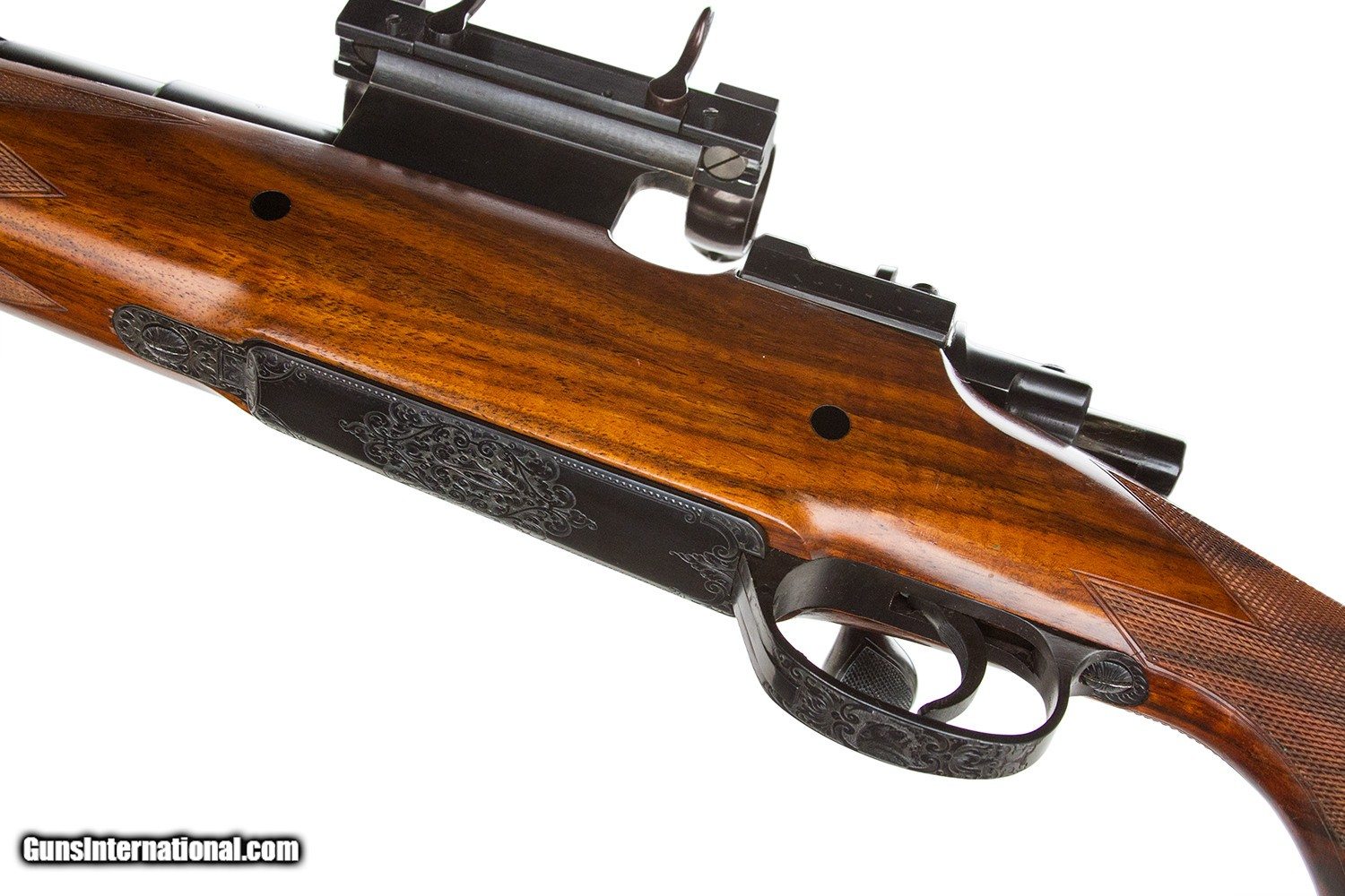 Description: MAGNUM SINGLE SQUARE BRIDGE MAGNUM MAUSER NOT SURE WHO DID IT VERY HIGH QUALITY WORK TO ME LOOKS FUGGER ENGRAVED 24" BARREL WITH 1/4 RIB 4 BLADE 1 STANDING 3 FOLDING HOODED FRONT 2 PANEL BOLT JEWELED BOLT ENGRAVED STEEL GRIP CAP MINTY CONDITION VERY INTERESTING GUN 9LBS 10 OZ 13 3/4 LOP SOLD |