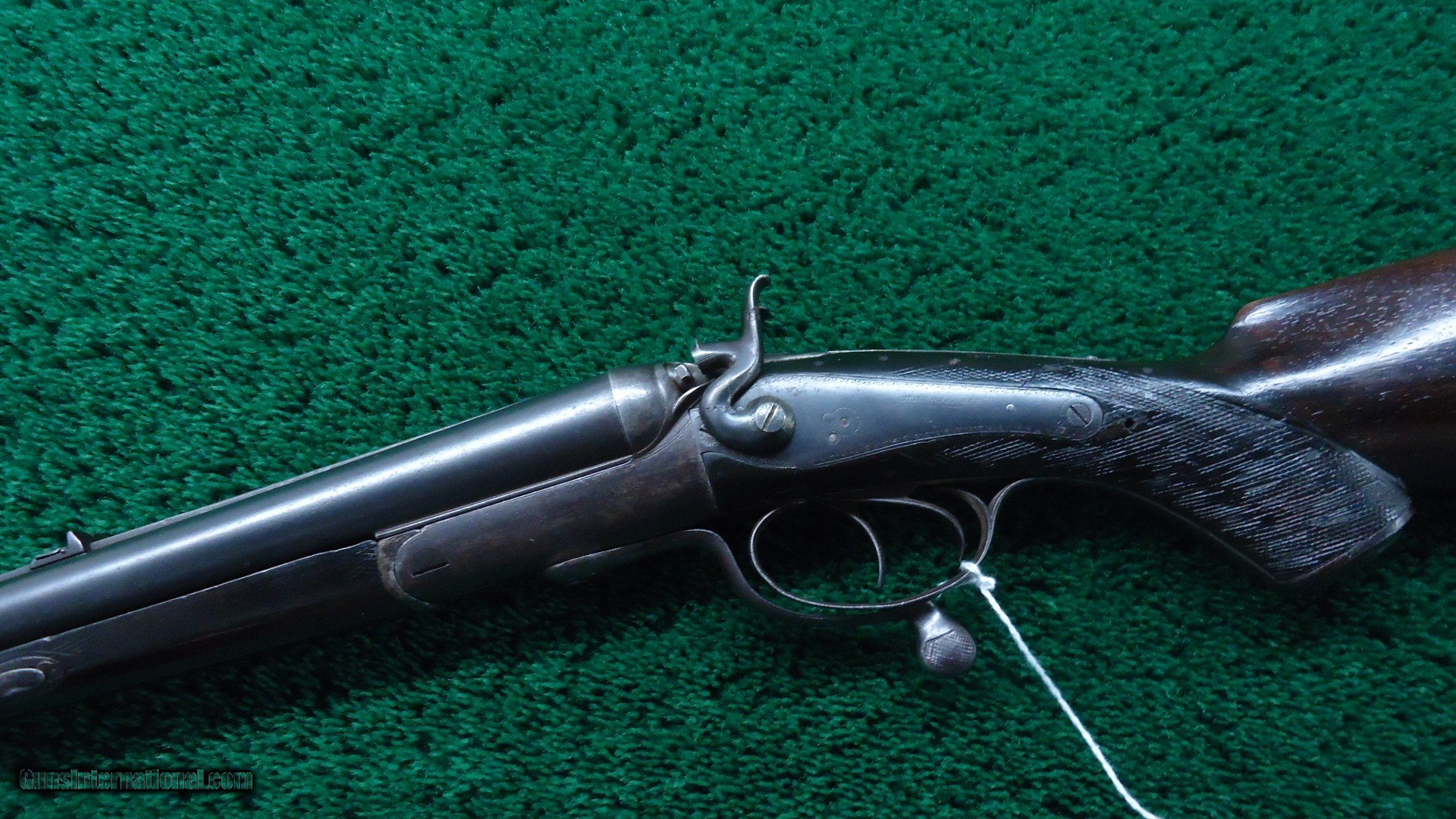 Description: Fine old English double rifle which is the under lever design with hammer style action locks. 26-1/4 inch barrels chambered in 577/500 No. 2 BPE caliber. Very good bores with sharp rifling and it should make a great shooter. Also this gun features a two leaf flip up platinum line rear and a low-profile silver bead front sight. Barrels retain about 50-60% of a reapplied aged blue brown finish. Lockplates retain about 85% of the same rust blue finish while the action and triggerguard have mostly turned a pleasant gray/brown patina. Lockplates retain faded markings that are still legible. The checkered walnut capped pistolgrip buttstock has signs of an old repair in the wrist that seems to be sound and solid which should make it quiet serviceable. Overall the rest of the wood shows considerable amounts of use. Equipped with sling eyes. This double rifle has a lot of character and seems to have been well-used on some overseas big game hunts in Africa or India. Leroy Merz Antique Firearms specializes in antique and vintage Winchesters and other fine American firearms. Since 1965 Mr. Merz has taken part in the world of firearms and has been a contributor to many well known reference books. We have hundreds of additional guns in every price range at our home online. Search for Merz Antiques in google. SOLD Antique: Yes Rifle Caliber: .577/500 No 2 Black Powder Express |