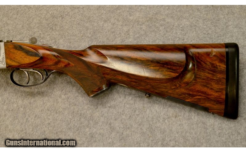 Description: This is a pre-owned Butch Searcy boxlock dangerous game double rifle in 450 Nitro Express # 2 SOLD Caliber Info: .450 Nitro Express # 2 Metal Condition: Very good with a few small scratches Wood Condition: Very good with a few small scratches, 3 small dents on the right side of the stock near the reciever, a few longer scratches on the stock and a small gouge in the stock between the pad and cheekpiece Bore Condition: Clean with bright lands Barrels: 25" with ejectors Triggers: Double triggers Stock: Checkered Turkish walnut Stock Dimensions: 15 1/2" LOP to front trigger Fore End: Checkered Turkish walnut Butt Pad: Old English pad Weight: 11 Lbs. Sights: Beaded blade with flip-up leopard front sight and quarter rib with 1 standing and 1 folding rear sight Item Location: Glendale, AZ |