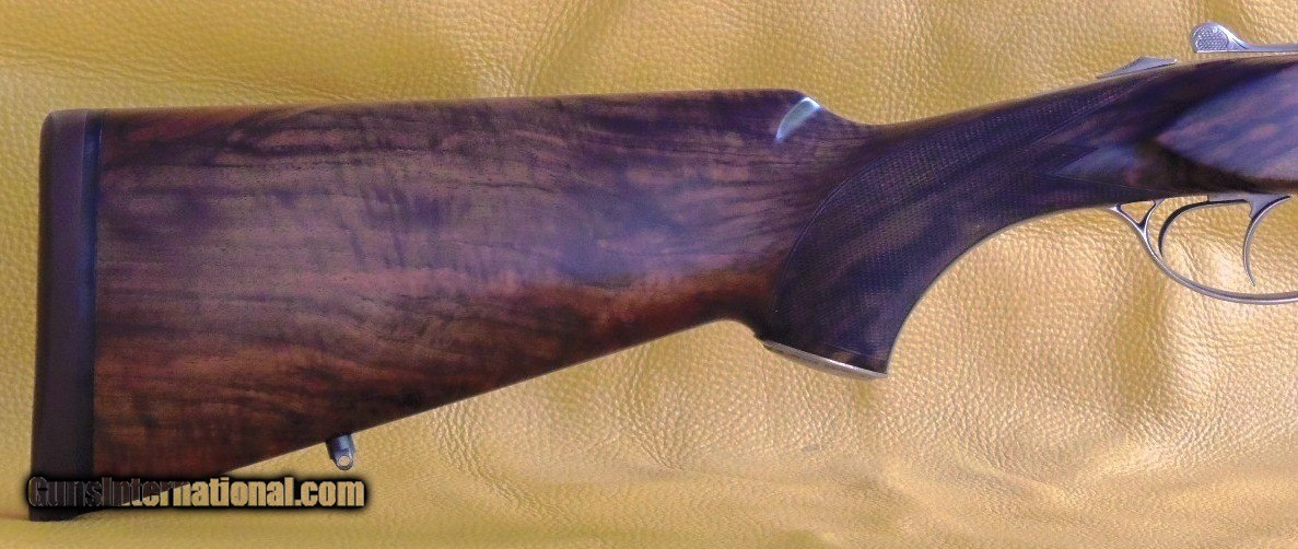 Description: Sale pending #55727, Chapuis Brousse 450 /400 ejector with Docter reflex sight. A slightly used express rifle built in 2012, imported by us. 25 5/8” long barrels, quarter rib with one standing three folding express sight , silver front sight with Holland style Flip over moon sight. Fitted with Docter 3.5 MOA red dot sight on quick detach plate. Very well regulated with Hornady DGX 400gr. Bores and chambers are like new, and the blacking is in 98% original condition. Double triggers in rolled hedge trigger guard, ejectors, reinforced frame coin finish with medium relief acanthus leaves and cape buffalo head. Mechanically perfect, with very good trigger pulls, tight on face with a long way for the bolt to ware in. Cosmetically in 95% condition. Stocked in a nice piece of Turkish walnut with a balanced mix of marble and fiddle back and a great grain alignment with the grip. Length is 15 1/8” over a .800 Decelerator pad, drop is 1 ½” and 2 ½”, cast off ¼”. Very light handling marks, 95%+ original condition on the wood finish and checkering. Weight of the rifle is 9Lbs 14 oz. Replacement is over $12,900.00. This rifle is well dialed in, shoots very well, and has been hunted in Africa. It is ready to go today! SOLD Rifle Caliber: .450/400 3" Manufacturer: Chapuis Model: Brousse Serial Number: 55727 Barrel Length: 25 5/8 Chambers: Like new Ejectors: Yes Condition: Great condition Wood Condition: 95%+ Bore Condition: Like new Stock: nice piece of Turkish walnut with a balanced mix of marble and fiddle back and a great grain alignment with the grip Butt Pad: .800” Decelerator pad LOP: 15 1/8 Weight: 9 Lbs 14 oz. Extras: Docter 3.5 MOA red dot sight on quick detach plate Case: Yes |