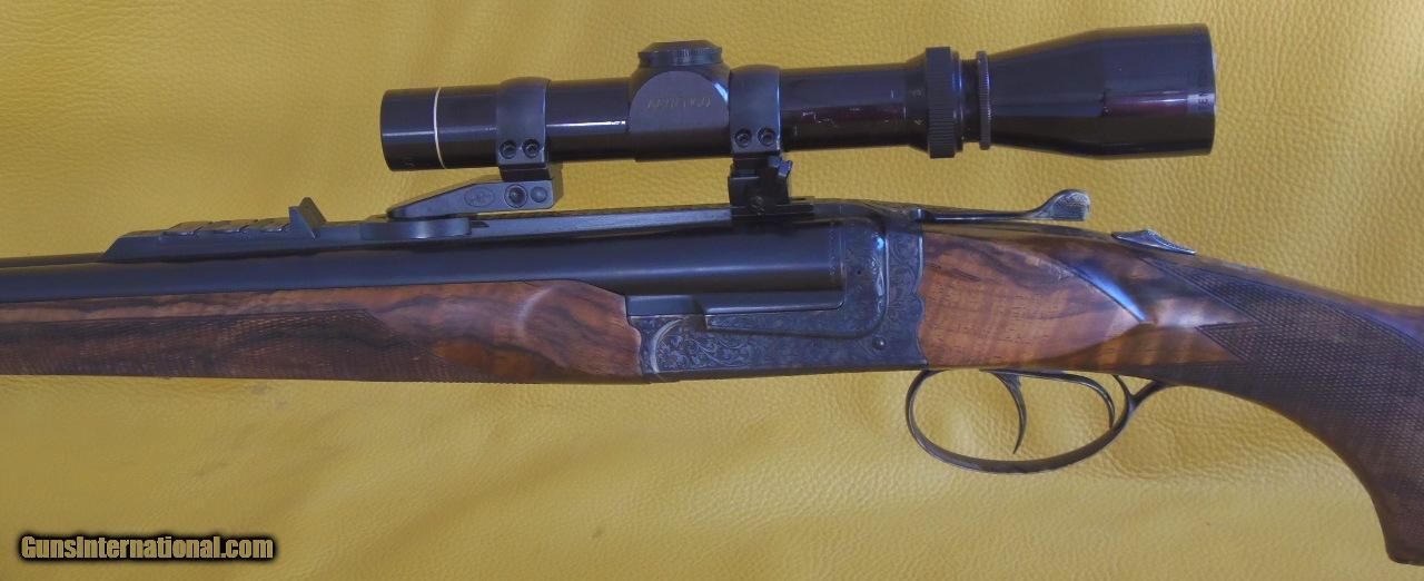 Description: Sale pending!!! #58939 Chapuis Brousse 450 /400 Ne Made in 2014. Imported by us in 2014 , a one owner rifle in excellent overall condition. Double triggers, ejectors , reinforced receiver with case color harden finish. Chapuis Royal style medium relief engraving with Cape buffalo head on bottom of action. 25 5/8” barrels with one standing , three folding leaves express sight , Holland style front sight with flip over moon sight. Factory pivot scope mount with a Leupold VXII 1-4 x 20. Weight with scope is 9 lbs 12 oz and 8 lbs 14 oz without. Bores and chambers are like new , metal finish is 99% original condition. Mechanical condition is 99% + I regulated the gun for Woodleigh 400gr and 66 gr of Reloader 15. Nice wood with great contrast, 15 ½” LOP over .800” Decelerator pad. Some light handling marks ,with the wood finish and checkering in 95% original condition. Drop 1 ½’ and 2 ½” , cast off ¼”. Sling swivels fitted, in the factory case. Good value. SOLD Manufacturer: Chapuis Armes France Model: Brousse Serial Number: 58939 Caliber Info: 450/400 Ejectors: Yes Barrels: 25 5/8 Stock Comb: 1 1/2 Stock Heel: 2 1/2 Stock Cast: 1/4" off LOP: 15 1/2 Weight: 8 Lbs 14 oz. Manufacture Date: 2014 Extras: Scope Case: Yes |