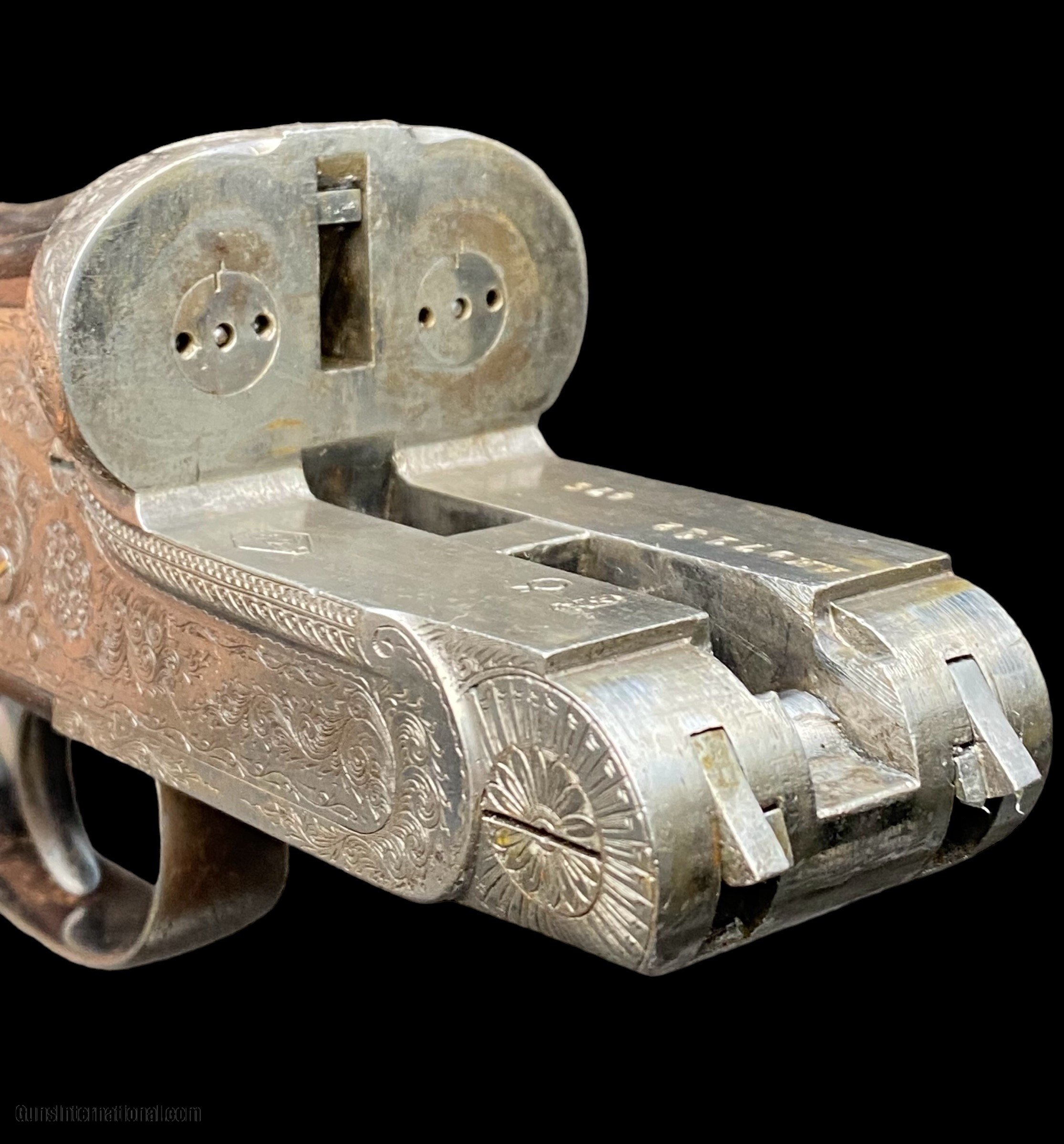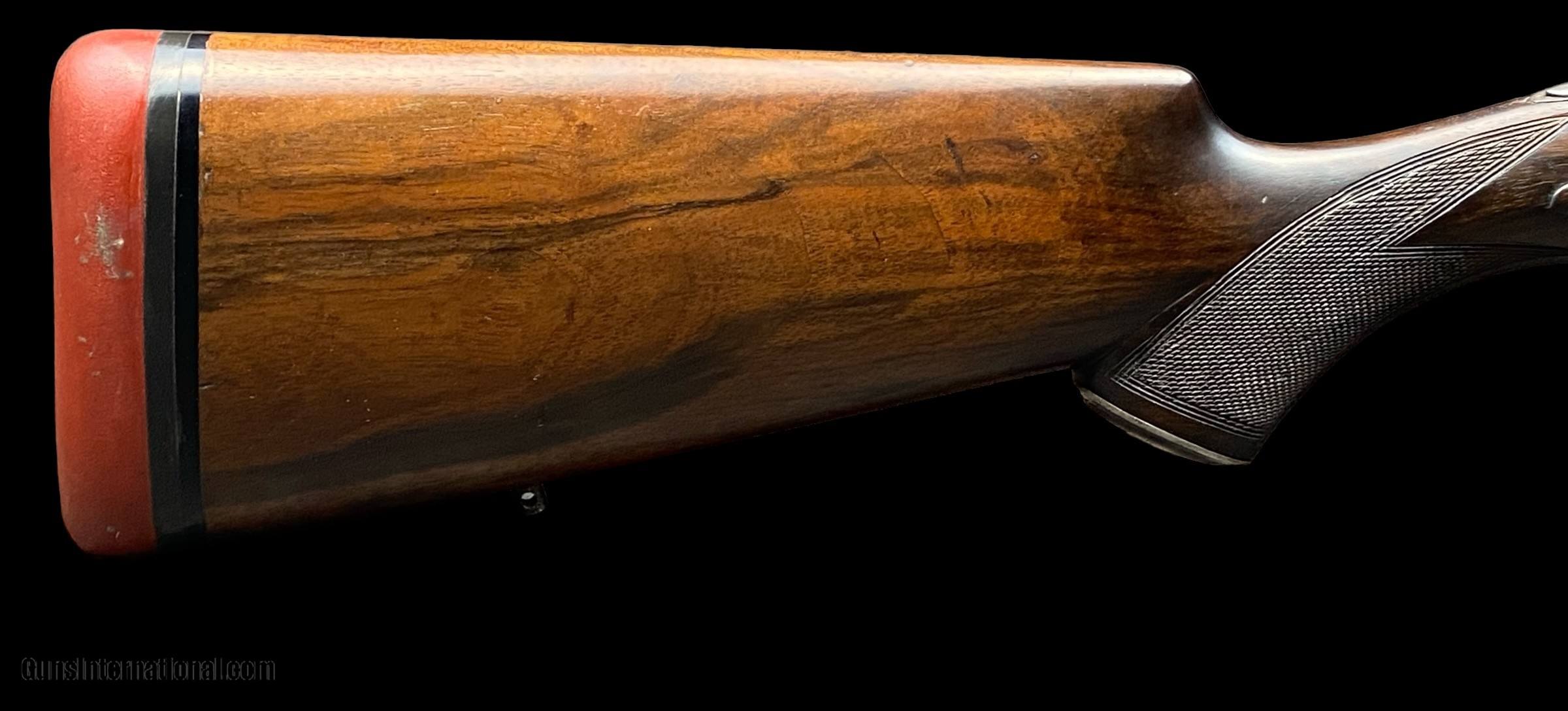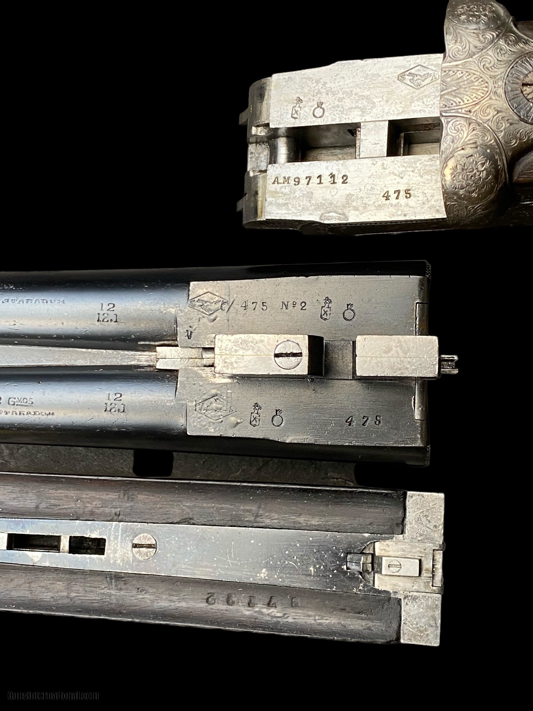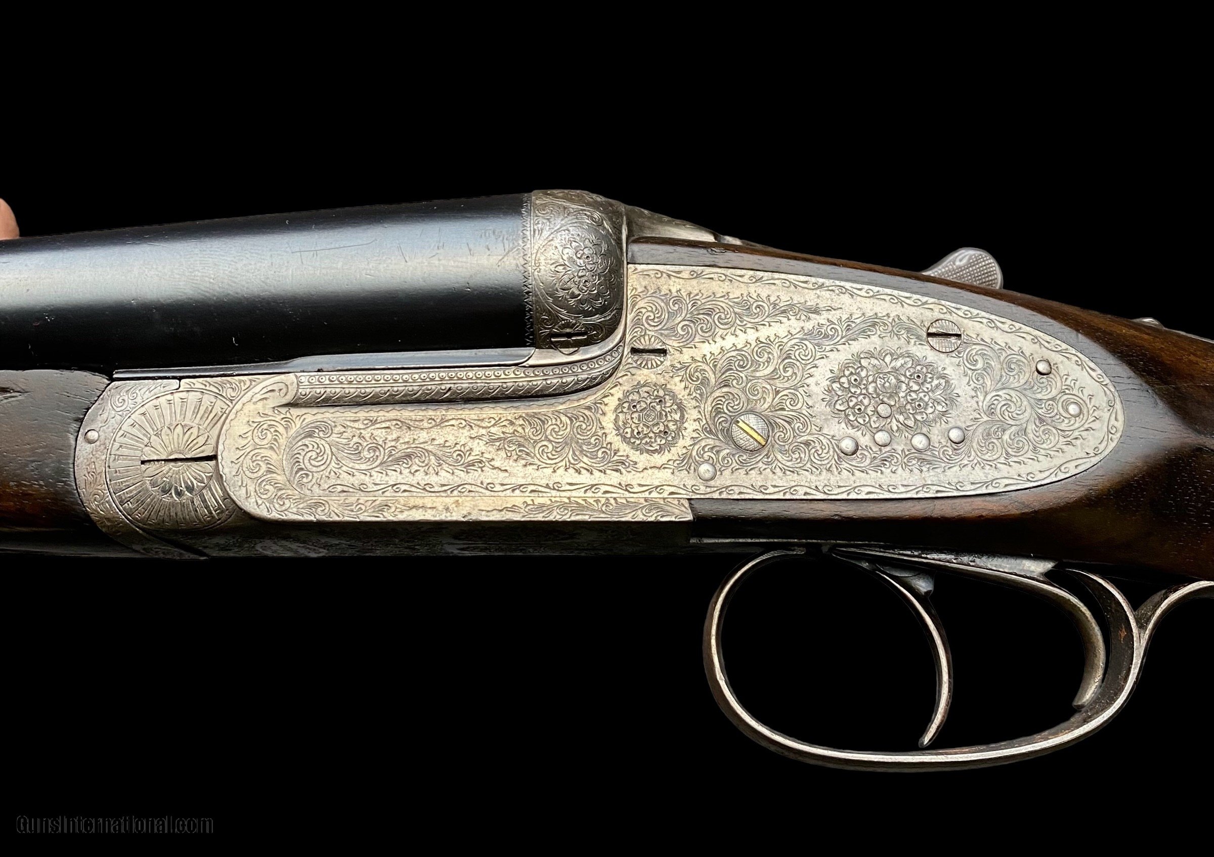 Description: VICTOR SARASQUETA - EIBAR, SPAIN SAFARI SIDELOCK EJECTOR DOUBLE RIFLE ROSE AND SCROLL COIN FINISHED RECEIVER SUPER STRONG DOUBLE UNDERLUG AND HIDDEN THIRD FASTENER CAL: 475 NO 2 - JEFFREY NITRO EXPRESS BBL: W/ ONE STANDING REAR SIGHT. - MARKED "VICTOR SARASQUETA - EIBAR ESPANA" EJECTORS DOUBLE TRIGGERS W/ HINGED FRONT TRIGGER EXTENDED BOTTOM TANG. ENGRAVED STEEL PISTOL GRIP CAP AUTO SAFETY WITH "S" IN GOLD NICELY FIGURED EUROPEAN WALNUT STOCK WITH CHEEKPIECE AND SILVERS STYLE SOLID RED PAD DIM:14.75" LOP WEIGHT: 9LBS 9OZ CONDITION: GUN IS IN VERY GOOD OVERALL CONDITION WITH LONDON QUALITY REBLACK.. BARRELS TIGHT ON FACE. BORES CLEAR WITH STRONG RIFLING. EJECTORS STRONG AND IN-TIME. STOCK RETAINS WHAT APPEARS TO BE ALL ORIGINAL OIL FINISH WITH SCANT LIGHT SURFACE MARKS FROM USE. CHECKERING ONLY SLIGHTLY SOFTENED. NICE GUN READY FOR YOUR NEXT SAFARI. GENTLEMEN, THIS IS A FANTASTIC SAFRI-READY DOUBLE RIFLE IN THE POWERFUL 475 #2 JEFFREY NITRO EXPRESS CARTRIDGE. WITH A 500 gr (32 g) BULLET, THIS CARTRIDGE RUNS 2,120 ft/s (650 m/s) AND DELIVERS A WHOPPING 5,000 ft⋅lbf (6,800 J) OF STOPPING POWER. NICE QUALITY GUN AND A VERY GOOD PRICE WHEN COMPARED TO OTHER DOUBLE RIFLES LIKE HOLLAND & HOLLAND, RIGBY, WESTLEY RICHARDS, ETC. PLEASE CALL NOW! FFL REQUIRED (C&R OKAY) FLAT $50 S/H/I CARD FEE APPLIES SOLD Curio/Relic: Yes Rifle Caliber: .475 No 2 Nitro Express Manufacturer: SARASQUETA Model: SLE DOUBLE RIFLE Serial Number: 97122 Ejectors: YES Action: SIDELOCK Triggers: DOUBLE |