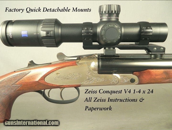 #010529, Krieghoff 500/416 N. E., Right Hand & Left Hand Model Classic Big Five SxS Double Rifle with a Right Hand Factory Stock but it also has a Left Hand Factory Stock, Model Classic Big Five SxS Double Rifle with 500/416 Hornady ammo in both DGX Bonded and Solids, Hornady Unfired and Fired brass and C & H reloading dies go with the gun, Made in 2021, The rifle barrels at 23 5/8" extractor with 1/4 rib, 1 standing rear sight, Factory installed Pivot Scope Mounts on the rib for pivot mounts, It comes with a Zeiss Conquest V4 1-4x24 with their Competition Reticle that is Illuminated, It comes with all the Zeiss instructions and paperwork, Double triggers with the front articulated, 14 15/16" LOP over a 3/4" Decelerator pad, The Left Hand Stock is the same LOP, 2 each Schnabel forends, It comes with an extra forend to be used with the Left Hand Stock, Deeley & Edge pull-down forend release, Shadowline cheekpiece, Sling eyes, 10 lbs. 11 oz. without the scope & 12 lbs. 1 oz. with the scope, The blue on the barrels at 99%, The stock finish at 98% with very few & light handling marks, The checkering at 100%, The bores are as new, The whole is cased in a Leather trunk with a canvas cover. A lot of ammo, dies and cases come with the gun. This set-up is complete and ready for your do-everything African Safari and is totally ready for the belly of a Boeing headed to Africa.