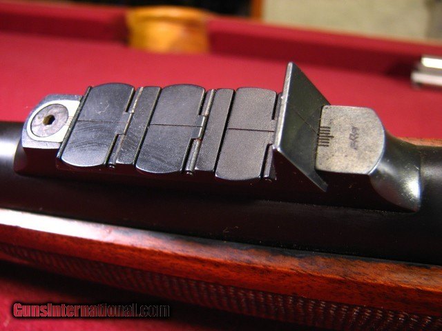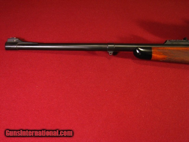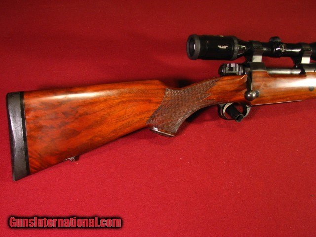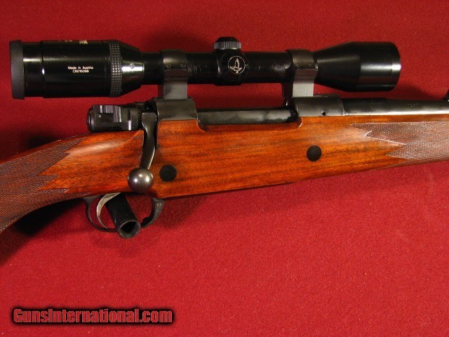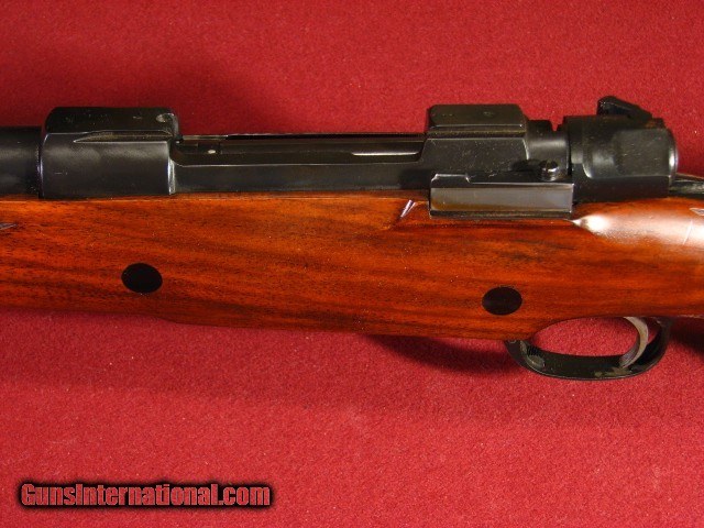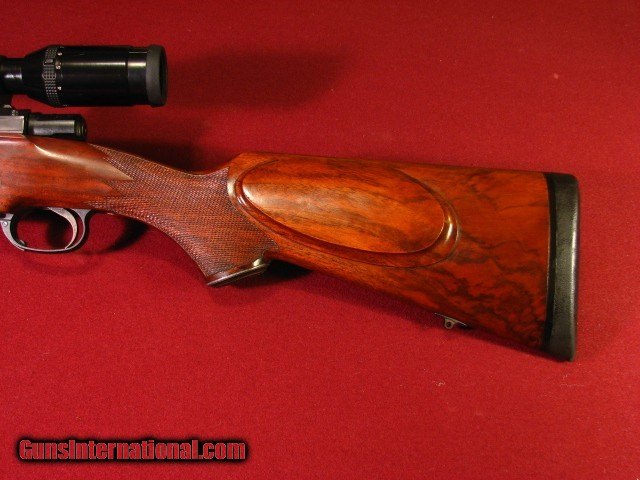 Description: Armor International S.A. Belgium .375 Holland & Holland built on a double square bridge Mauser action with a 24" barrel with an excellent bore. Banded ramp front sight and banded sling swivel. Island express Recknagle rear sight with one standing and three folding leaves. Double square bridge Mauser action with drop box magazine, three position side swing safety, and quick release rings mounting a 1" Swarovski Habicht 3x9x36 scope with duplex. Fully adjustable trigger. Stocked in a very nice piece of European Walnut in English style with shadowline pancake cheekpiece, two screw Jerry Fisher grip cap, ebony forend tip, and point pattern checkering. Stock is double crossbolted. 13 5/8" LOP to a Decelorator pad. 9lb 12oz as scoped. This piece is built the way a Safari rifle should be with timeless styling. I used it to succesfully harvest 12 species in Mozambique in 2018. It functioned flawlessly. It is accurate. It remains in 96-97% overall condition. Also included is a set of 30mm quick release rings identical to the 1" rings so that a spare scope can be taken with you. They return to zero very well. SOLD |