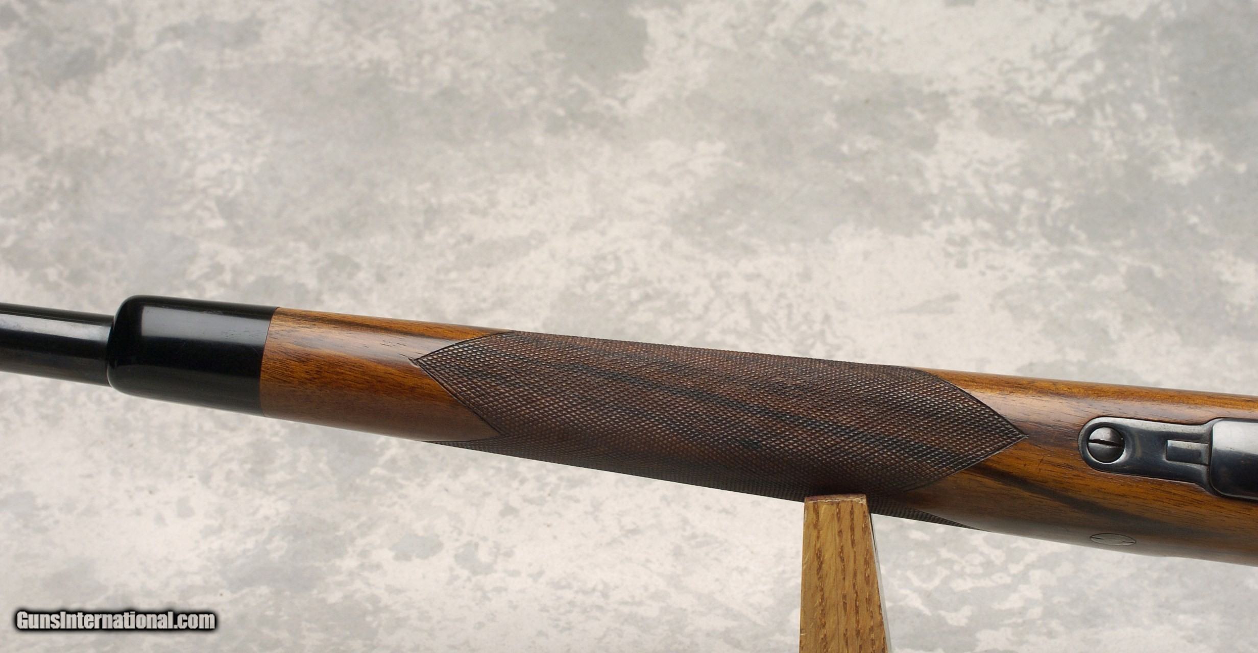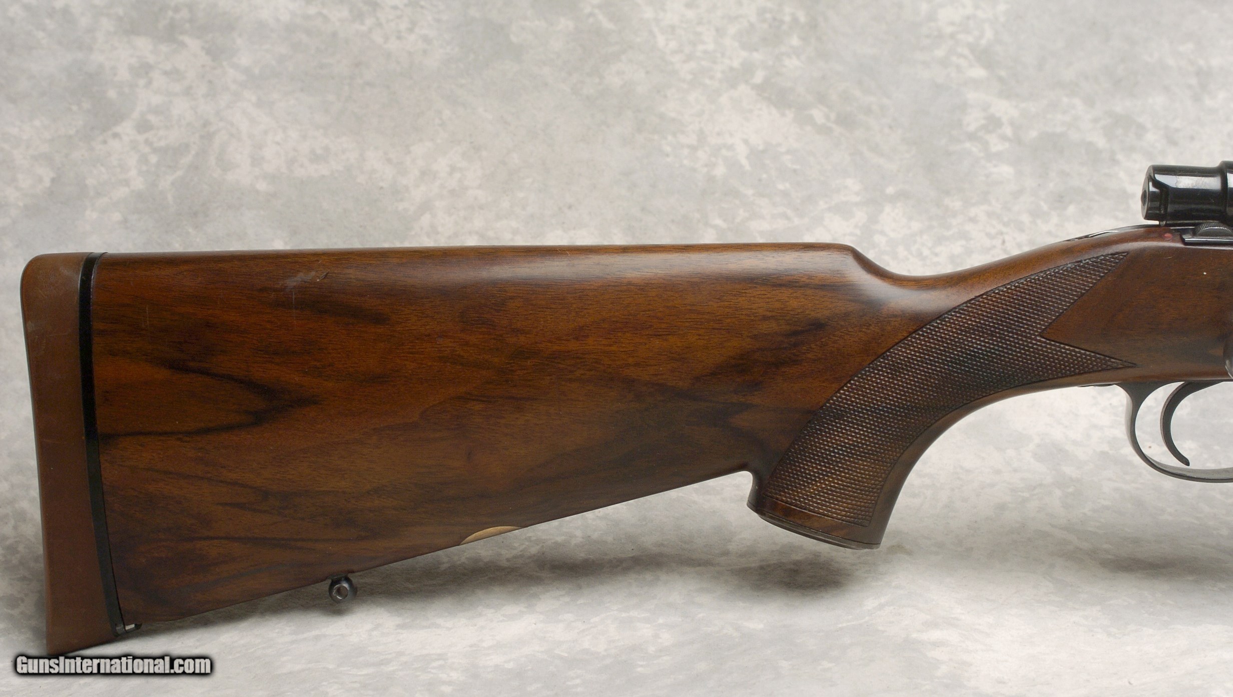 Description: For sale here is a Churchill One of One Thousand Mauser Sporter rifle in .458 Win Mag caliber. This is a fine British bolt action gun in a desirable dangerous game caliber. It has a 26 inch barrel with a shrouded blade front sight. This gun hasn't been fire and the bolt has not been worked. The consignee bought it for a collection. This rifle is from a limited edition of 100 rifles produced by E J Churchill in celebration of InterArms 20th Anniversary in 1973. It has a shrouded front sight and flip up set distance rear sight. The barrel and action are finished in a mirror-like blued finish. The one piece French Walnut stock has a fine grain pattern and exceptionally fine checkering. It has one small ding on the stock that doesn't affect the finish. The recoil pad on this rifle has a button release on the bottom that allows it to swing open and closed, concealing a chamber to hold three additional rounds behind the pad. This is an exceptionally rare and beautiful rifle of the finest British quality. SOLD Manufacturer: Churchill Model: Mauser Sporter Caliber Info: .458 Win Mag Condition: New Metal Condition: 100% Wood Condition: 100% Bore Condition: New, unfired Triggers: 2 set |